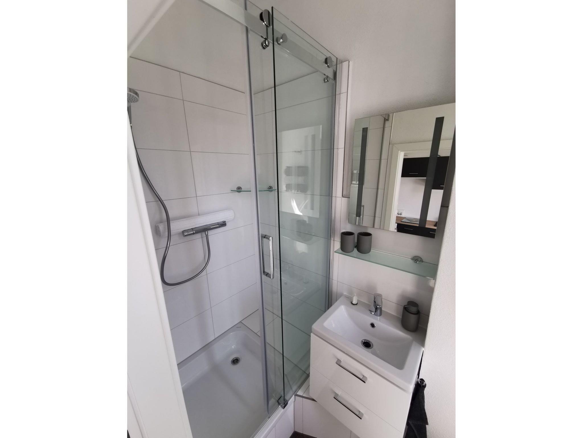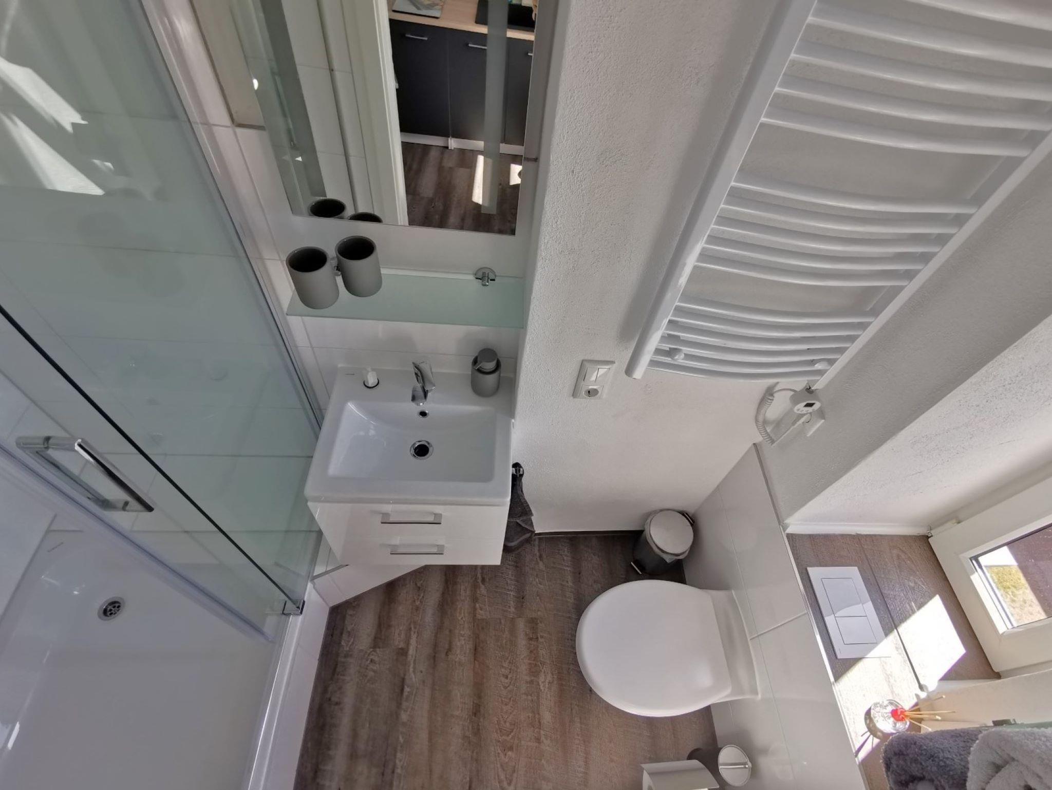 Das Badezimmer verfügt über eine Dusche mit kleiner Einstiegshöhe, WC, Handtuchheizung und einen Fön.