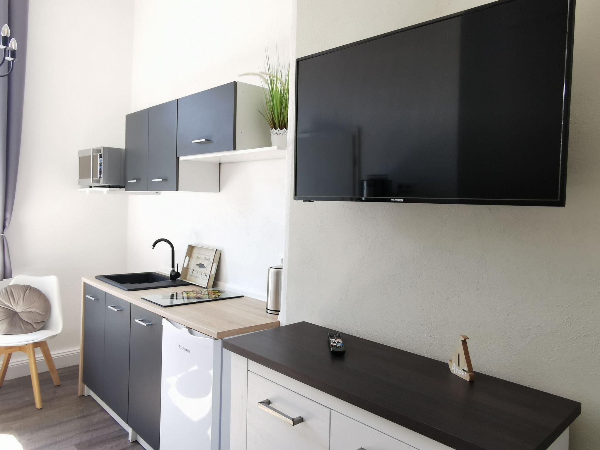 Der Smart-TV ist schwenkbar, sodass man vom gemütlichen Queen-Size-Bett (2x 0,80m breite Matratzen) und ebenfalls von der Essecke im Küchenbereich Fernsehen kann. Die gut ausgestattete Küche bietet einen Kühlschrank mit Gefrierfach, 2 Induktionskochfelder, Mikrowelle mit Umluft+Grill, Wasserkocher, Toaster, sowie eine Kaffeemaschine für Bohnen-und Filterkaffee.