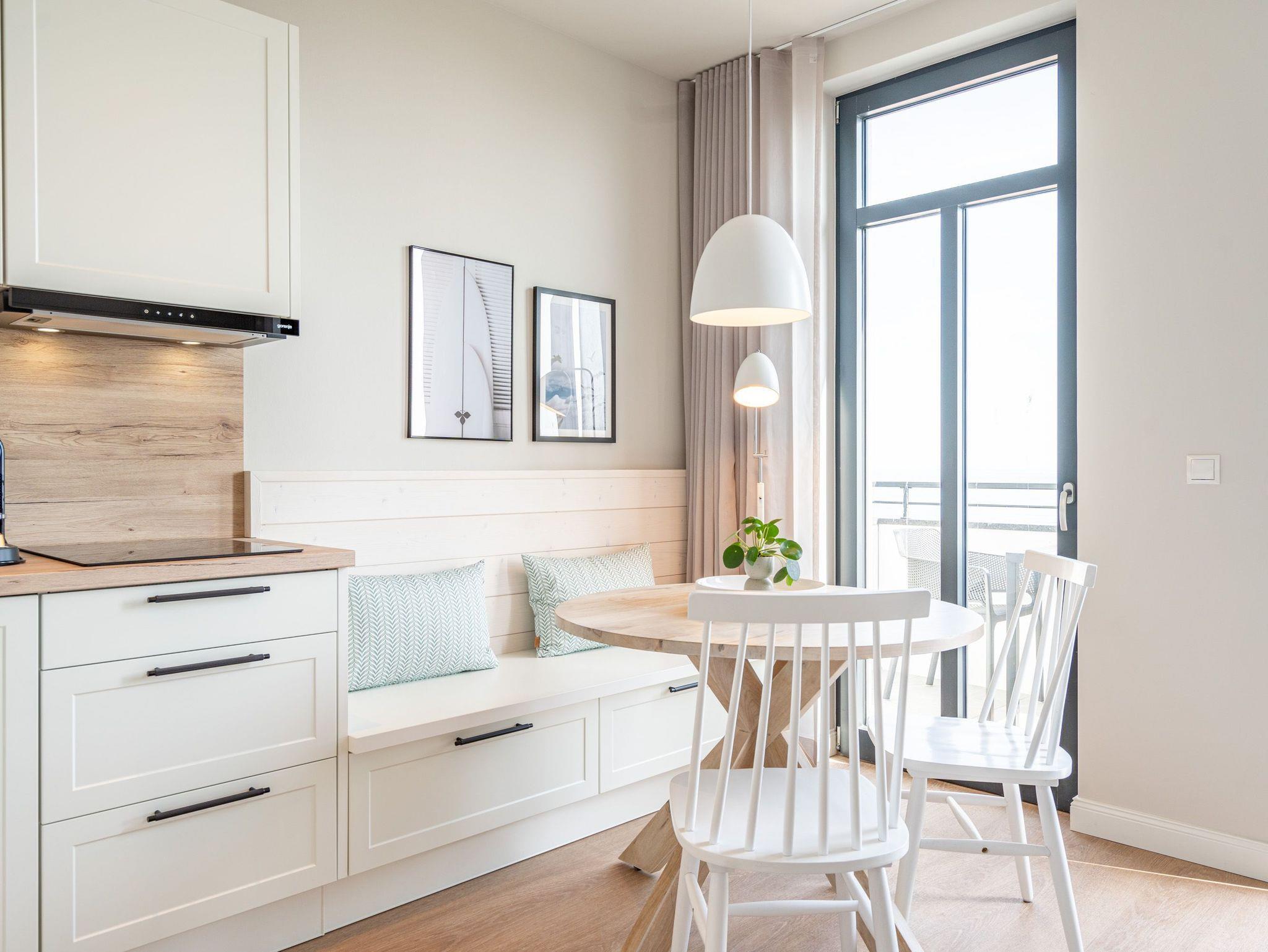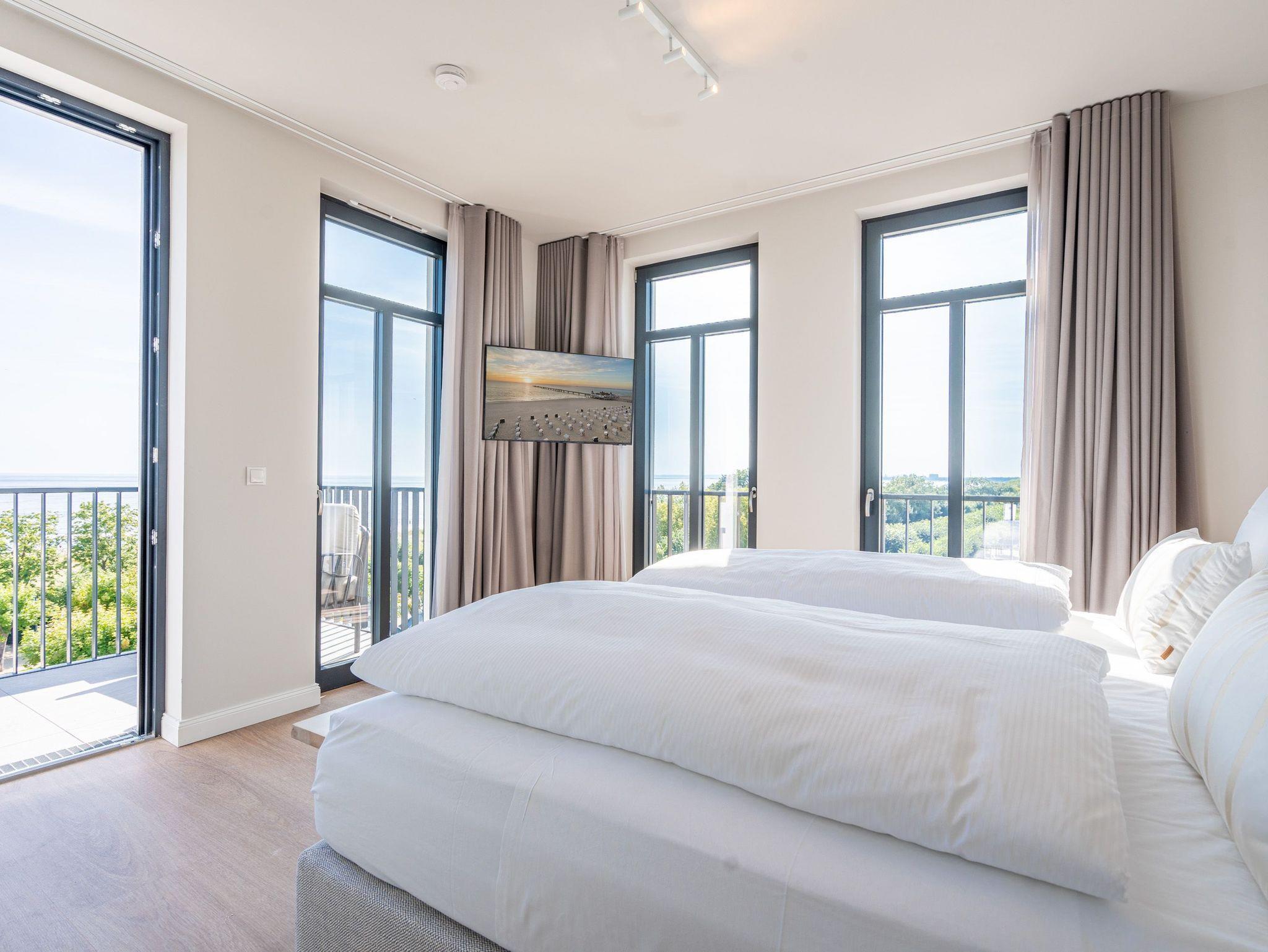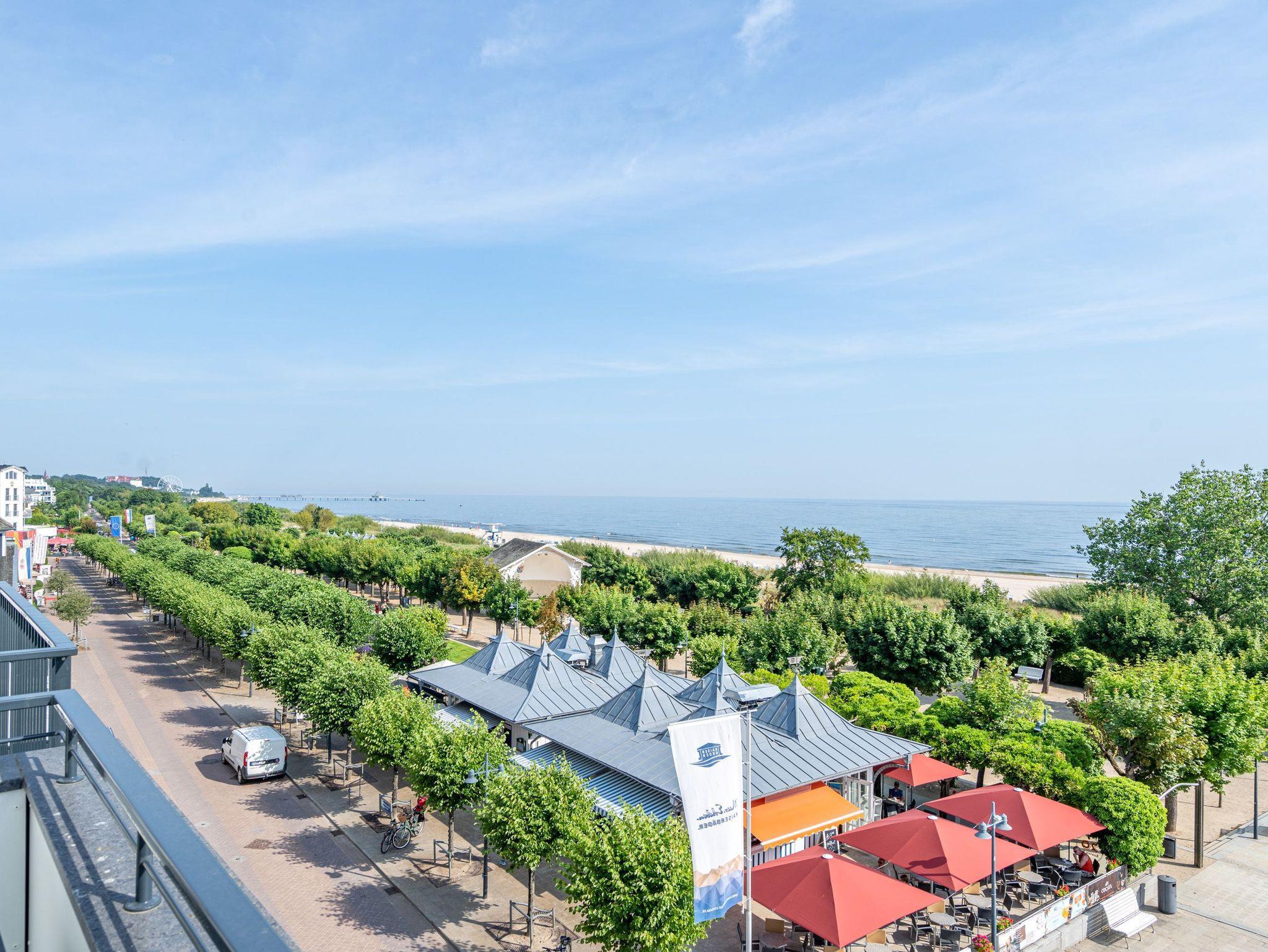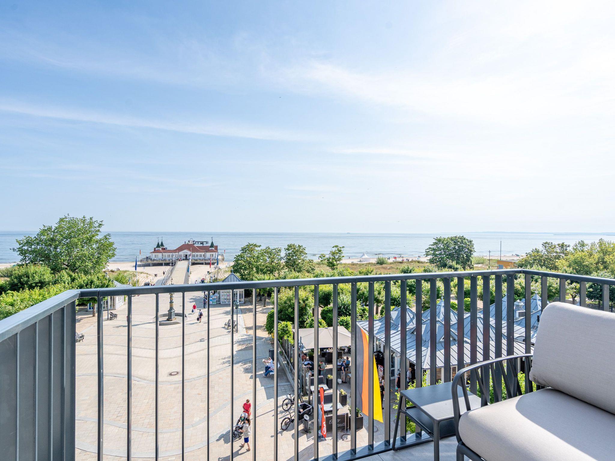 Visasvis der Seebrücke reicht der Blick aus dem exklusiven 2-Raum-Appartement A 3.4 (Haus A) in der 3. Etage von der Heringsdorfer Seebrücke bis nach Swinemünde. An Tagen mit klarer Seeluft sogar bis zu den weißen Klippen von Misdroy. Dieses kleine, aber feine Urlaubsdomizil wartet auf seinen 48 Quadratmetern mit viel Komfort und Finesse auf. Der offene Wohnbereich und das Schlafzimmer sind ideal für zwei Personen und sind ein Traum für alle Ostseeliebhaber. Denn von der werden Sie hier nicht genug bekommen. Nordisches Design gibt beim Interieur den Ton an. Modern und hyggelig zugleich. Genießen sie aus den stylischen, drehbaren Relaxsesseln ? die Füße auf bequeme Hocker ausgestreckt ? den fantastischen Blick aufs Meer. Ein Elektrokamin (ohne Wärmeabgabe) sorgt zudem für eine heimelige Atmosphäre. Sogar im Sommer. Ein 50-Zoll-Flachbildfernseher steht für Ihre Unterhaltung zur Verfügung. Die offene Küchenzeile ist mit einem Backofen, einem 3-Platten-Induktionskochfeld, einer Spülmaschine, einer Nespresso-Kapselmaschine und vielem mehr komplett ausgestattet. Hier fehlt es an nichts, um raffinierte Gerichte zu zaubern und sie anschließend am schönen Esstisch gemeinsam einzunehmen. Nur einen Schritt aus dem bodentiefen Fenster hinaus und Sie stehen auf dem ersten Ost-Balkon mit einem Beistelltisch, zwei Sesseln und einer Gartenliege. Entspannen Sie hier bei Sonnenschein und atmen die energieaufladende Brise, die direkt vom Wasser herüberweht, tief ein. Das Schlafzimmer verspricht im luxuriösen Boxspringdoppelbett (2,00m x 2,00m) wunderbare Stunden der Ruhe. Hier befindet sich ein großer Kleiderschrank und ein weiterer 43-Zoll-Flachbildfernseher. Mit Meerblick aufwachen, das ist doch purer Luxus. In diesem charmanten Appartement gehört er zur Grundausstattung dazu. Kaum aus dem Bett, können Sie vom Schlafzimmer aus auf dem zweiten Balkon (Richtung Ost) die aufgehende Sonne begrüßen. Denn auf Usedom entsteigt sie jeden Morgen der Ostsee. Das innenliegende Bad ist mit einer Dusche, einem Waschtisch und einer Toilette ausgestattet. Zur Wohnung gehört in der Tiefgarage ein PKW-Stellplatz. Genießen Sie in diesem wunderschönen Urlaubsparadies unvergessliche Tage am Meer.
