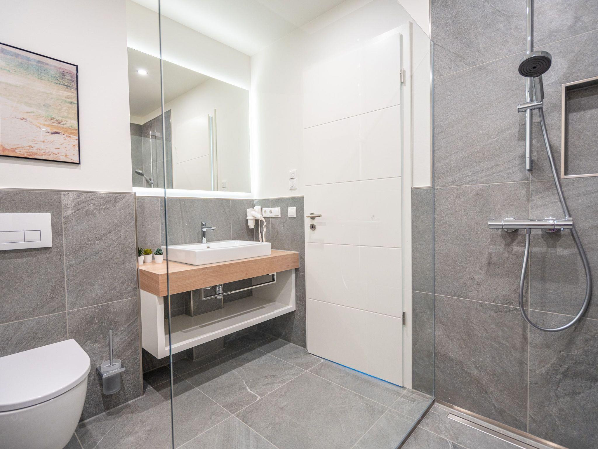 Die 2024 fertig gestellte Strandterrasse liegt direkt an der belebten Strandpromenade und bietet einen einzigartigen Ausblick auf die Grand Dame der historischen Seebrücken sowie die historische Konzertmuschel, einem beliebten Treffpunkt für Kunst und Kultur. Dahinter liegt die Ostsee ? ein Panorama, das zu den schönsten in den Kaiserbädern gehört. Es ist wie das Abtauchen in eine andere Zeit. In eine Zeit, in der man mit Stock, Sonnenschirm und Hut fürs „Sehen und gesehen werden“ über die Promenade schlenderte; aber auch in eine Zeit, in der ? damals wie heute ? Zeit einmal für eine kurze Weile keine Rolle spielt. Weil man angekommen ist im Loslassen, Entspannen und Genießen. Es ist dieser besondere Geruch nach Meeresluft und Freiheit, der in Erinnerung bleibt. Dazu die Bilder, die man mitnimmt. Von langen Strandspaziergängen, vom Lachen in fröhlich schäumenden Ostseewellen, von der Zeit in einem wunderschönen Urlaubsdomizil. Denn genau das ist die Strandterrasse mit ihren 56 modernen und exklusiven Ferienappartements direkt gegenüber der Ahlbecker Seebrücke. Die Ein-, Zwei- oder Dreizimmerwohnungen ? zwischen 40 und 70 Quadratmeter groß ? sind von einer Innenarchitektin gemeinsam mit unserem Erfahrungsschatz an Gästewünschen mit viel Liebe zum Detail und ganz individuell konzipiert worden. Entspannung und Wohlfühlen stehen an erster Stelle. Alles ist aufeinander abgestimmt und sorgt für eine gemütliche Atmosphäre. Wählen Sie zwischen einem Domizil in einem hellen, sandfarbenen Designkonzept oder einem Appartement mit anthrazitfarbenen Farbakzenten. Alle Appartements verfügen gleichermaßen über eine stilvolle und komfortable Einrichtung, die passgenau angefertigt worden ist, sowie über moderne Küchen und Bäder. Jedem Schlafzimmer ist ein eigenes Bad mit Dusche zugeordnet (außer App. B4.5). Die Appartements besitzen fast alle einen Balkon ? viele schauen sogar zur Ostsee hinaus. Die meisten Feriendomizile haben einen Elektrokamin und Infrarotsaunen. Im Erdgeschoss befindet sich ein separater Gemeinschaftsraum für Fahrräder. Außerdem besteht die Möglichkeit, im Gemeinschaftswaschraum 2 Waschmaschinen [&] Trockner zu nutzen. Ergänzt wird das Angebot durch eine Gemeinschaftssauna, die täglich von 11:00 bis 22:00 Uhr nutzbar ist. In der Tiefgarage (Einfahrtshöhe 2,03 Meter) steht für jede Wohnung 1 Pkw-Stellplatz zur Verfügung. Ist alles zur Zufriedenheit untergebracht? Dann kann der Urlaub ja beginnen. Und beim Blick vom Balkon über die Ostsee treffen sich zum Sonnenaufgang das Heute und das Damals. Gelassenheit legt sich beim Gang hinunter an den Strand auf die Seele. Jetzt darf die Zeit stehenbleiben.