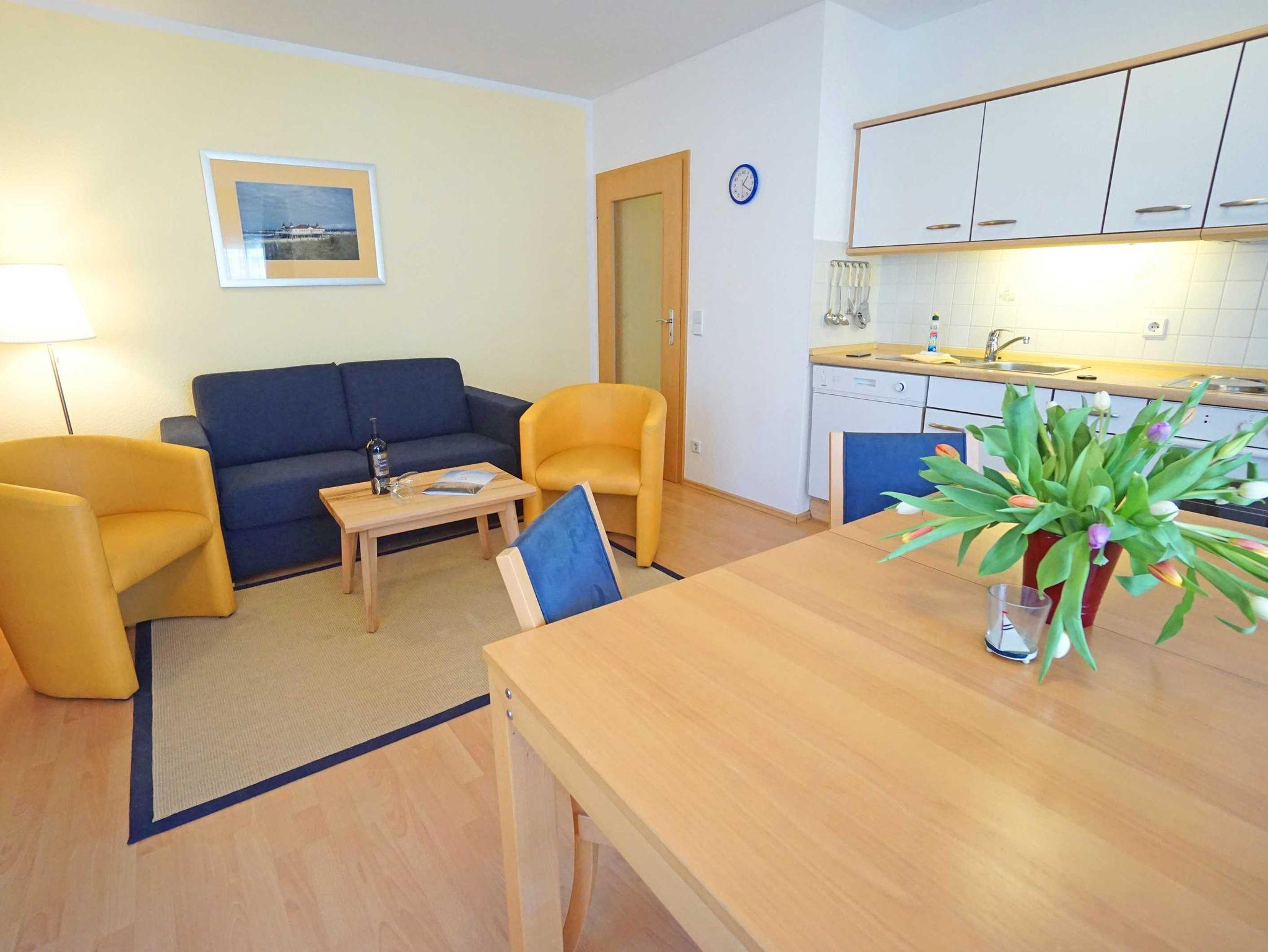 Die helle und freundliche 2-Zimmer-Ferienwohnung verfügt über ein komfortabel eingerichtetes Wohnzimmer (Flachbildfernseher, DVD-Player, etc.) mit einer komplett ausgestatteten Küchenzeile (Geschirrspüler, Mikrowelle, etc.). Desweiteren befindet sich im Wohnzimmer eine gemütliche Schlafcouch und im Schlafzimmer ein großes Doppelbett (180x200 cm). Ein Duschbad ist vorhanden.
