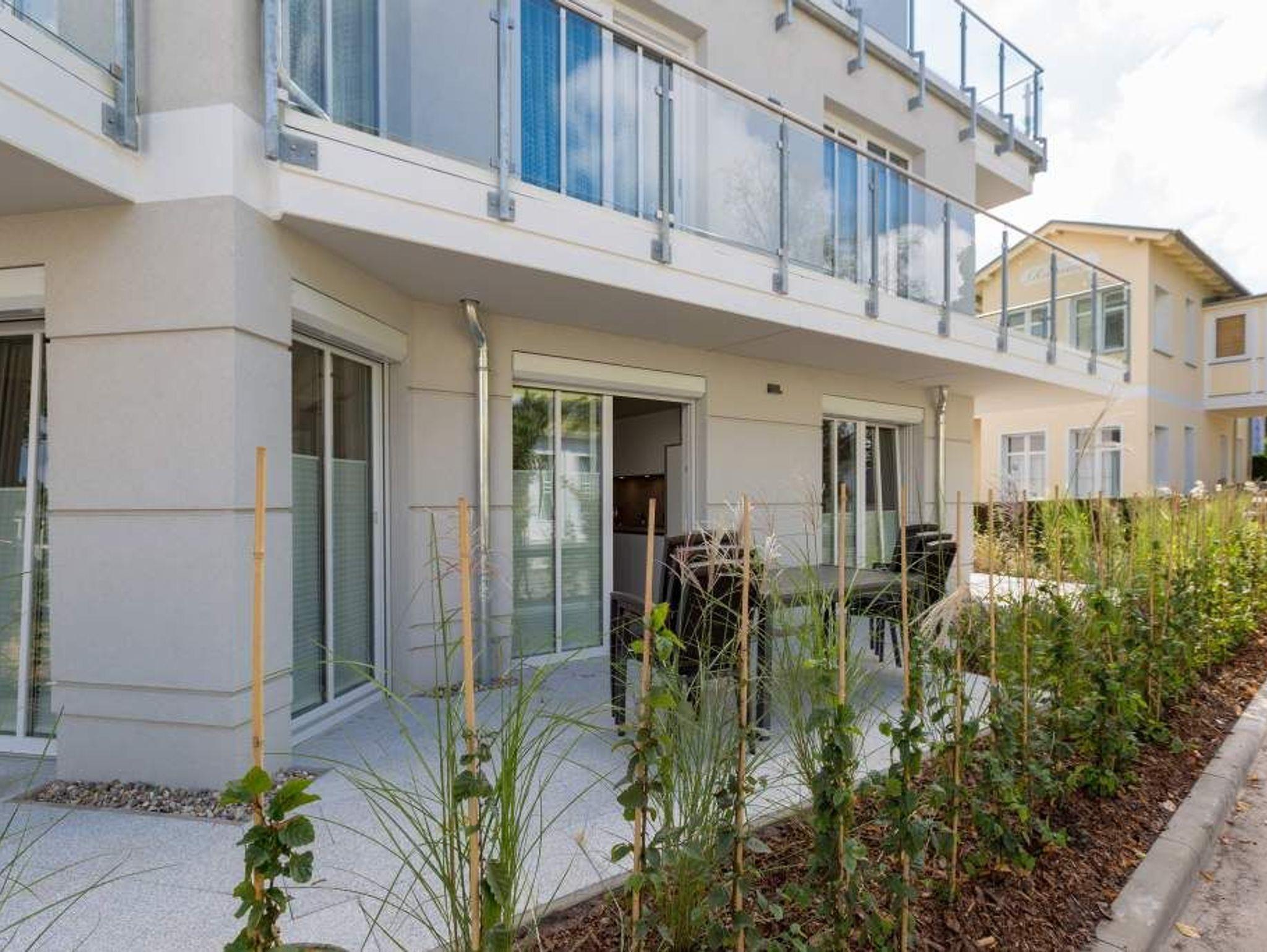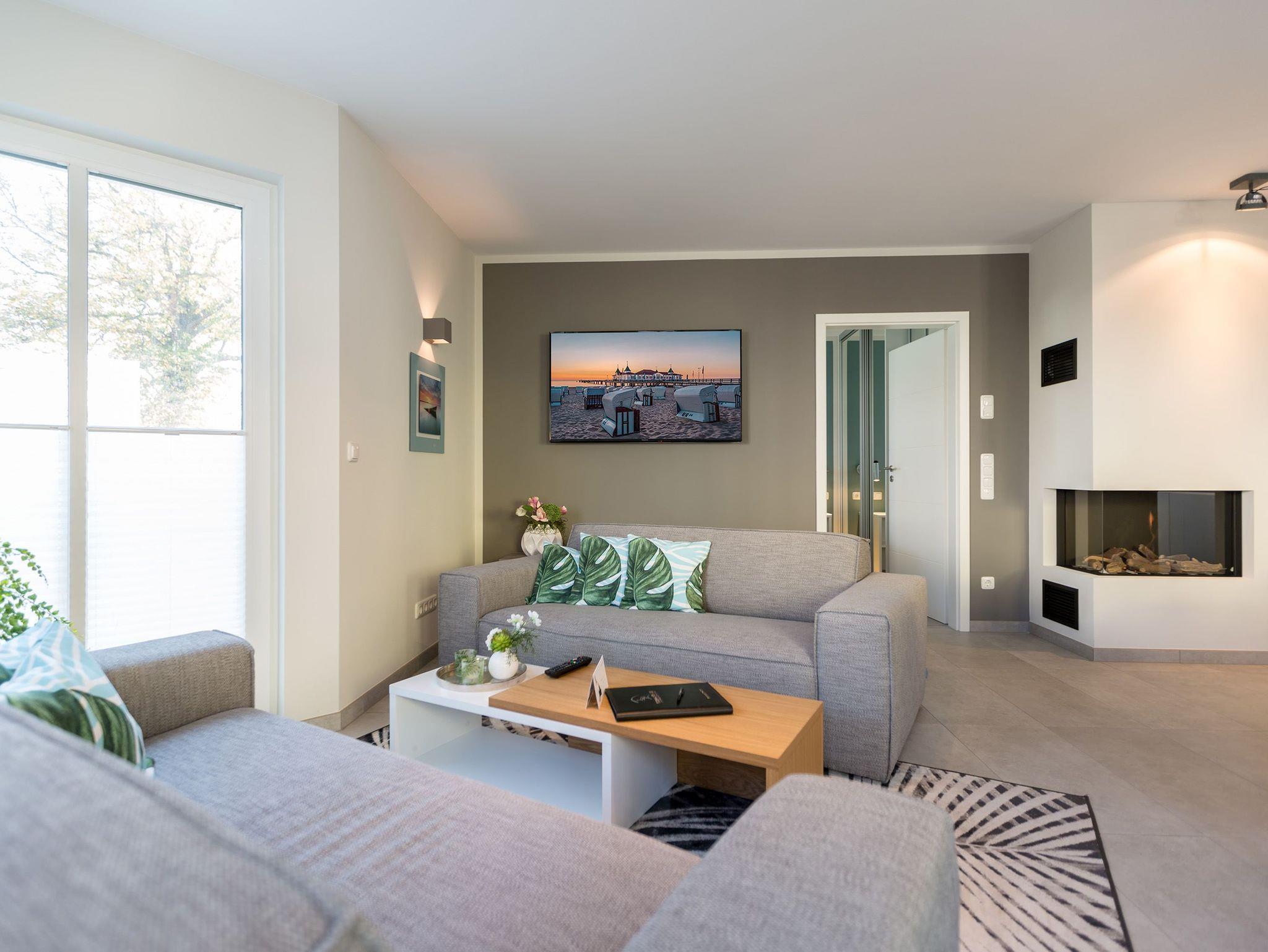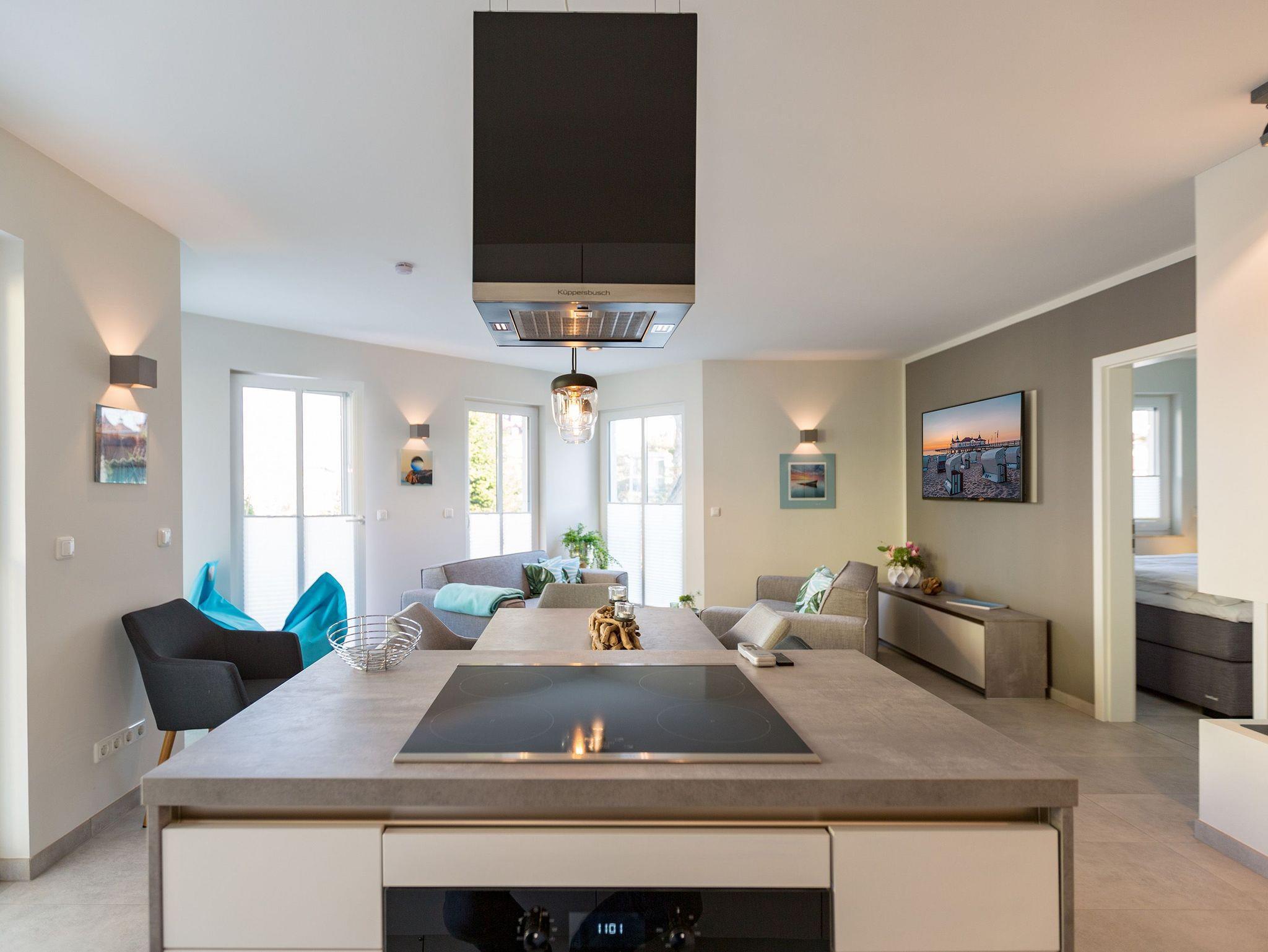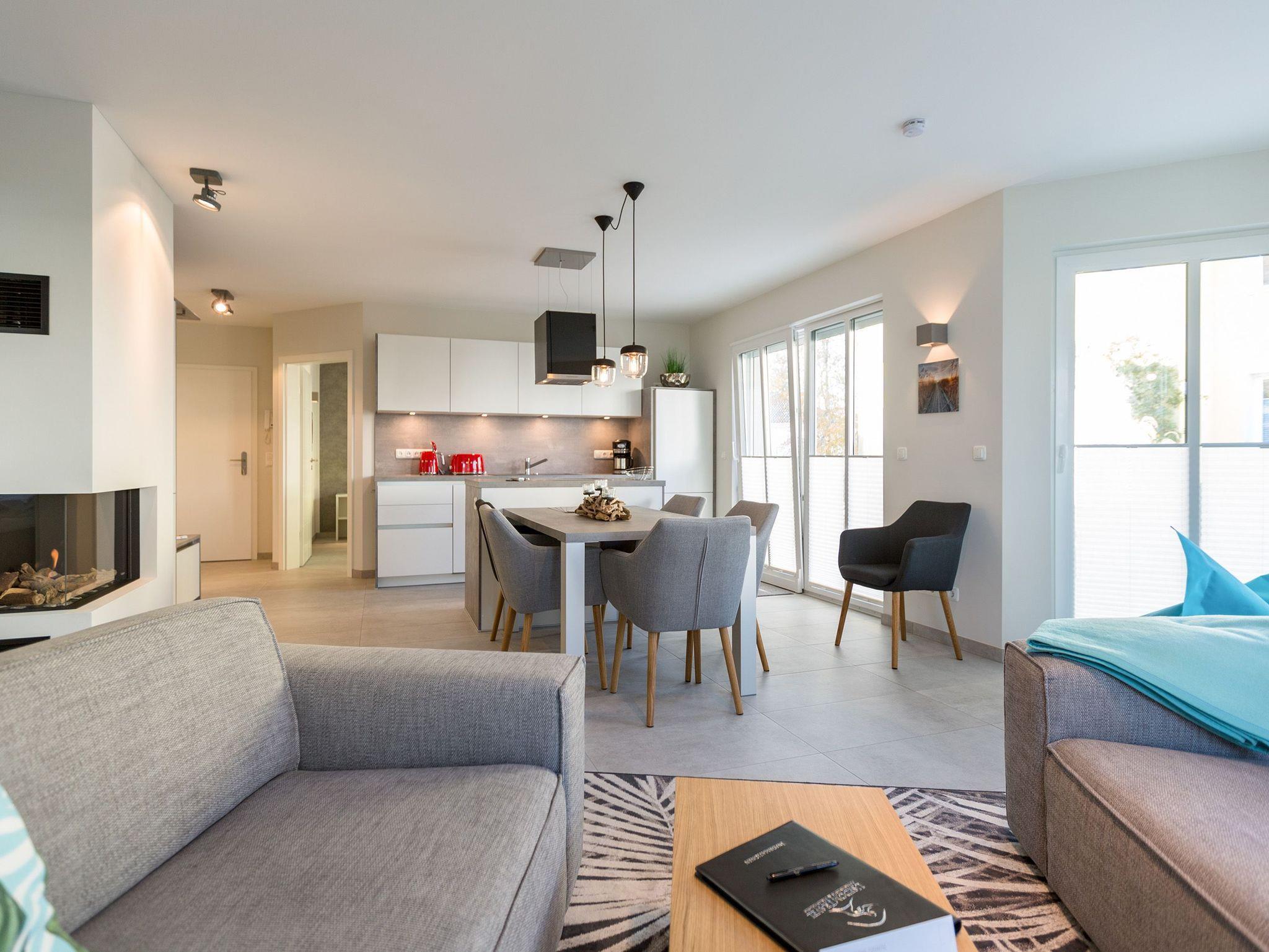 Individualisten werden sich in diesem Drei-Raum-Appartement im Erdgeschoss ganz besonders wohlfühlen. Denn ausgefallen, stylisch und modern empfängt es seine Gäste mit viel Komfort und Eleganz. Zeitlose Betonoptik, eine Einrichtung, die mit exklusivem Designgeschmack ausgesucht und mit den passenden Dekorationen ergänzt wurde. Das große und offene Wohnzimmer lässt viel Sonnenlicht ein. Zwei Terrassen (15 Quadratmeter groß Richtung Norden [&] 37 Quadratmeter groß Richtung Nord-Westen) schauen direkt auf die Ostsee. Hier ist Entspannung pur angesagt ? egal, ob beim Sonnenbaden oder zum gemütlichen Essen. Das Innere der Ferienwohnung lockt mit viel Platz ebenfalls zum Entspannen. Ganz besonders die beiden großen Sofas eignen sich dafür perfekt. An ungemütlichen Tagen und Abenden sorgt der Gas-Kamin für eine wohlige Kuschelatmosphäre. Natürlich steht hier für die Unterhaltung ein großer Flat-TV zur Verfügung. Das Wohnzimmer öffnet sich zu einem geräumigen und gemütlichen Ess- und Küchenbereich. Die Kochzeile ist voll ausgestattet mit hochwertigen Geräten und Marken-Geschirr. Gemeinsam kochen ? an der modernen und freistehenden Kochinsel ist das möglich. Am schönen Esstisch mit gemütlichen Sesseln haben bis zu fünf Personen ausreichend Platz zum Schlemmen und Genießen. In den beiden Schlafzimmern können bis zu vier Personen und ein Kleinkind im Kinderreisebett schlafen. Zwei bequeme Boxspringdoppelbetten (1,80 m x 2,00 m) verleihen Ihren Träumen behagliche Leichtigkeit. Im Badezimmer wartet ein besonderes Highlight auf Sie: eine Panorama-Sauna. Gerade an kühlen Abenden ist die Finnische Sauna eine kleine Wellness-Oase, die Sie trübe Gedanken schnell vergessen lässt. Eine geräumige Dusche, ein Waschtisch und ein WC gehören ebenfalls zur Bad-Ausstattung. Zudem verfügt die Wohnung über ein Gäste-WC. Bei Anreise sind die Betten für Sie schon bezogen und Handtücher liegen bereit. Ihr Auto können Sie auf dem für Sie am Haus reservierten und überdachten Stellplatz parken.