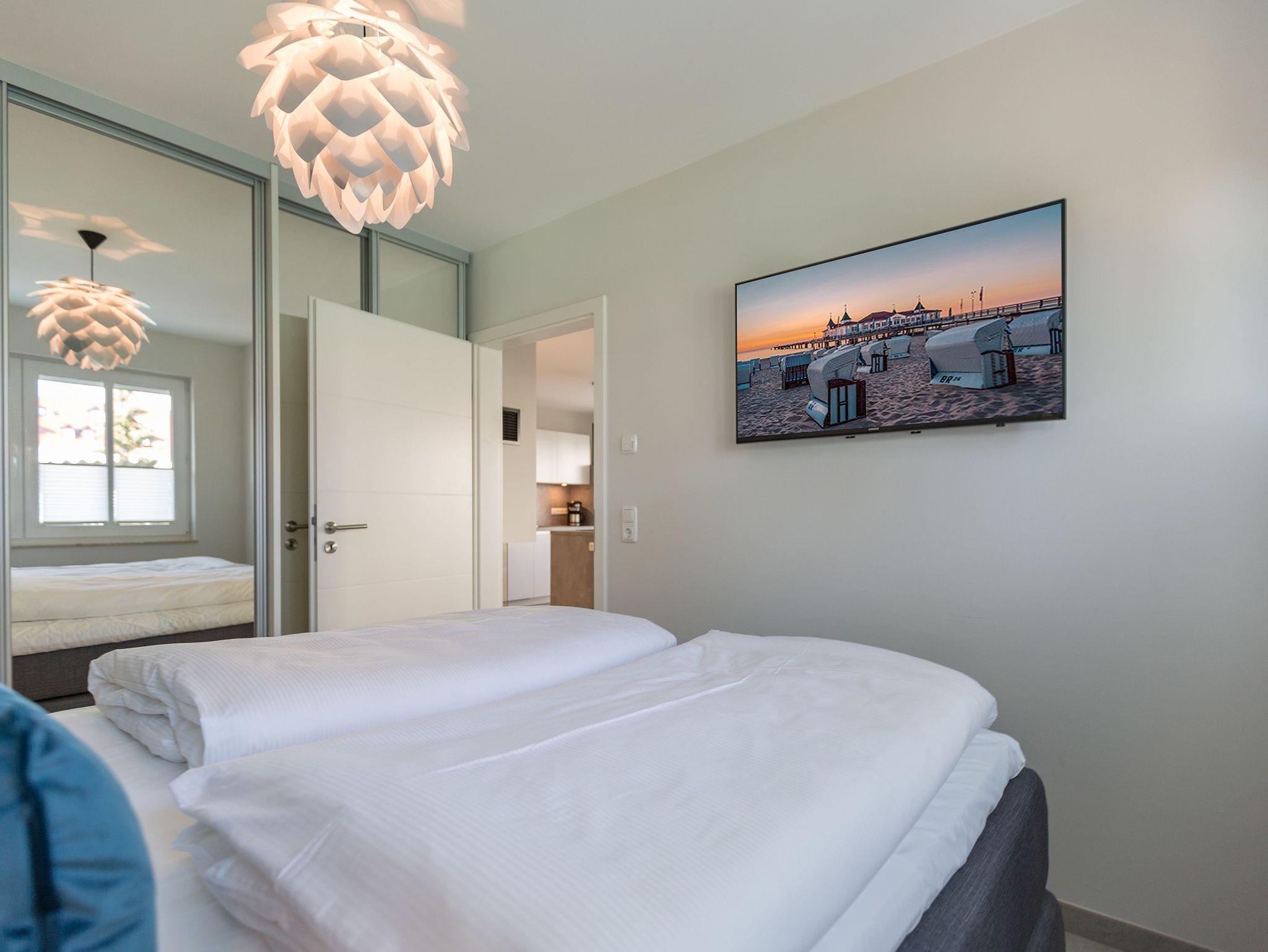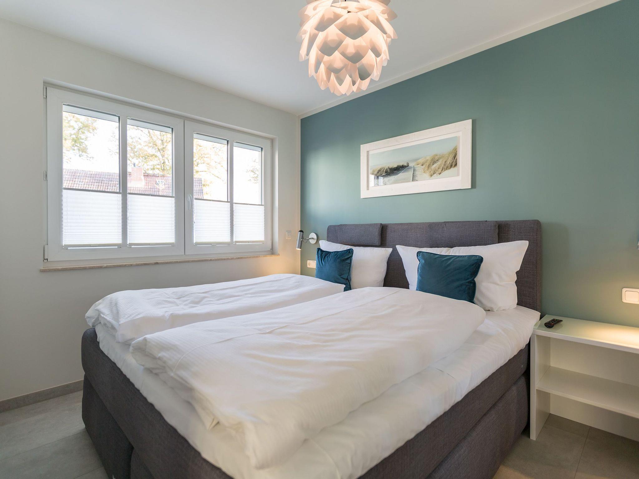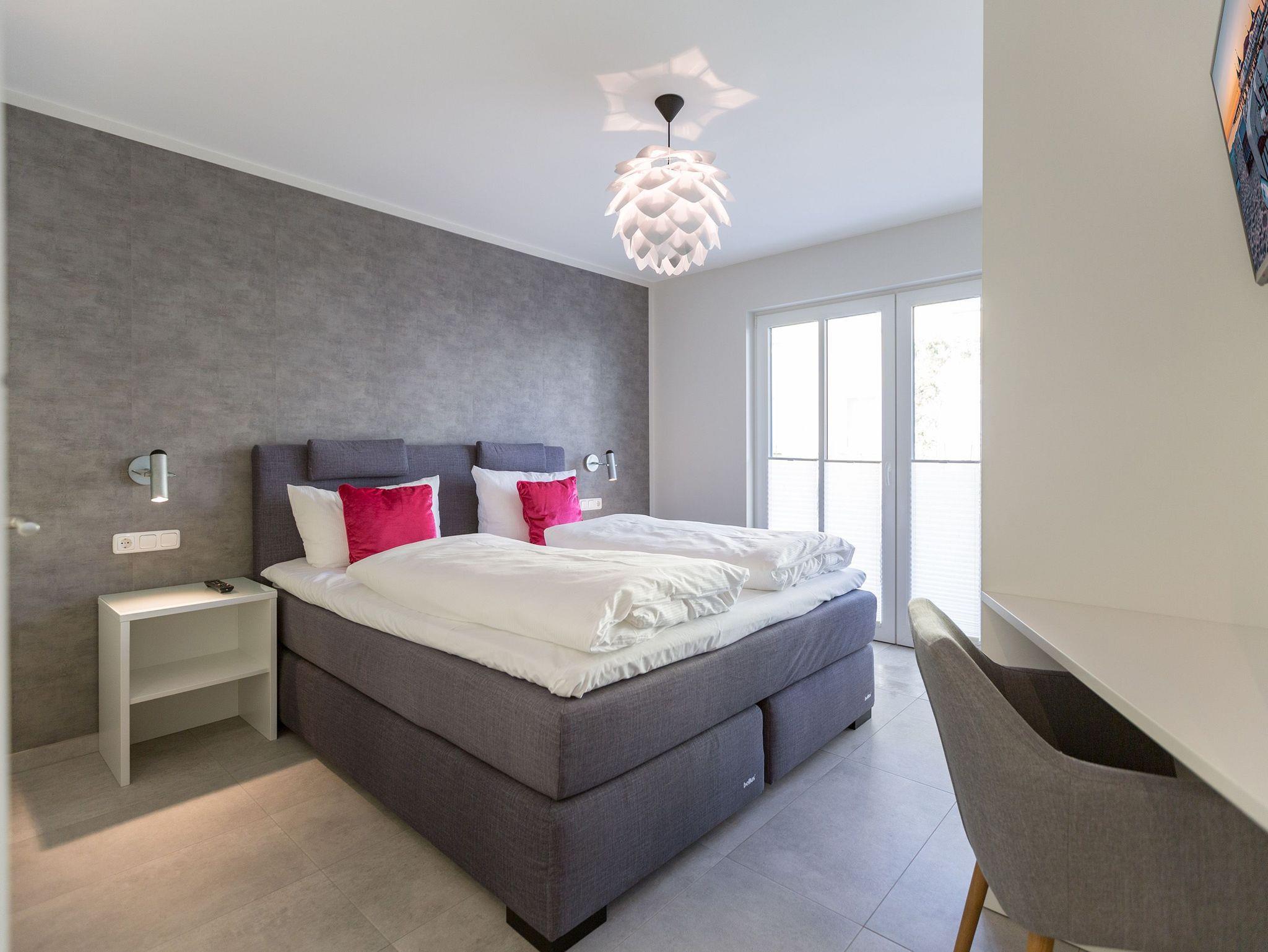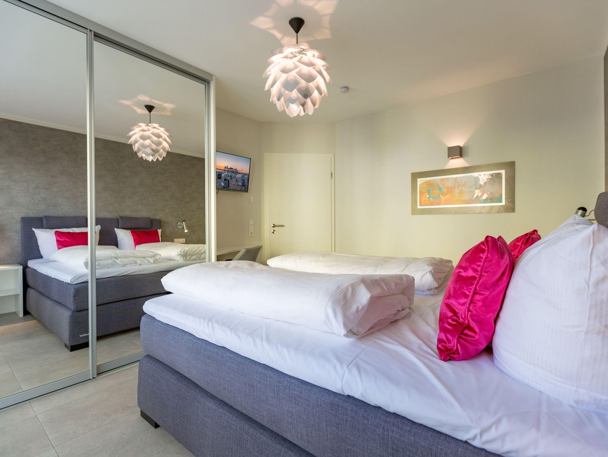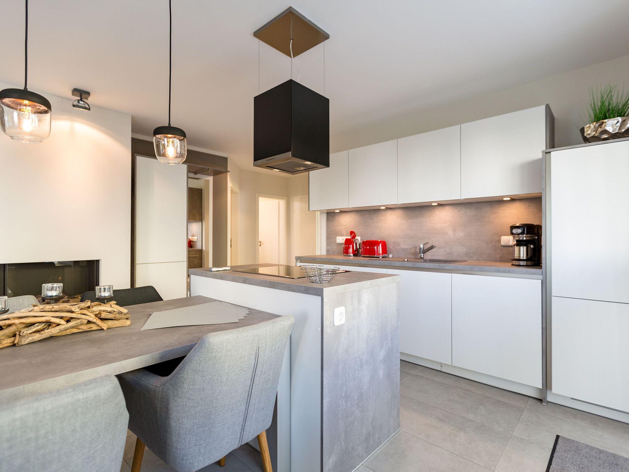 Individualisten werden sich in diesem Drei-Raum-Appartement im Erdgeschoss ganz besonders wohlfühlen. Denn ausgefallen, stylisch und modern empfängt es seine Gäste mit viel Komfort und Eleganz. Zeitlose Betonoptik, eine Einrichtung, die mit exklusivem Designgeschmack ausgesucht und mit den passenden Dekorationen ergänzt wurde. Das große und offene Wohnzimmer lässt viel Sonnenlicht ein. Zwei Terrassen (15 Quadratmeter groß Richtung Norden [&] 37 Quadratmeter groß Richtung Nord-Westen) schauen direkt auf die Ostsee. Hier ist Entspannung pur angesagt ? egal, ob beim Sonnenbaden oder zum gemütlichen Essen. Das Innere der Ferienwohnung lockt mit viel Platz ebenfalls zum Entspannen. Ganz besonders die beiden großen Sofas eignen sich dafür perfekt. An ungemütlichen Tagen und Abenden sorgt der Gas-Kamin für eine wohlige Kuschelatmosphäre. Natürlich steht hier für die Unterhaltung ein großer Flat-TV zur Verfügung. Das Wohnzimmer öffnet sich zu einem geräumigen und gemütlichen Ess- und Küchenbereich. Die Kochzeile ist voll ausgestattet mit hochwertigen Geräten und Marken-Geschirr. Gemeinsam kochen ? an der modernen und freistehenden Kochinsel ist das möglich. Am schönen Esstisch mit gemütlichen Sesseln haben bis zu fünf Personen ausreichend Platz zum Schlemmen und Genießen. In den beiden Schlafzimmern können bis zu vier Personen und ein Kleinkind im Kinderreisebett schlafen. Zwei bequeme Boxspringdoppelbetten (1,80 m x 2,00 m) verleihen Ihren Träumen behagliche Leichtigkeit. Im Badezimmer wartet ein besonderes Highlight auf Sie: eine Panorama-Sauna. Gerade an kühlen Abenden ist die Finnische Sauna eine kleine Wellness-Oase, die Sie trübe Gedanken schnell vergessen lässt. Eine geräumige Dusche, ein Waschtisch und ein WC gehören ebenfalls zur Bad-Ausstattung. Zudem verfügt die Wohnung über ein Gäste-WC. Bei Anreise sind die Betten für Sie schon bezogen und Handtücher liegen bereit. Ihr Auto können Sie auf dem für Sie am Haus reservierten und überdachten Stellplatz parken.