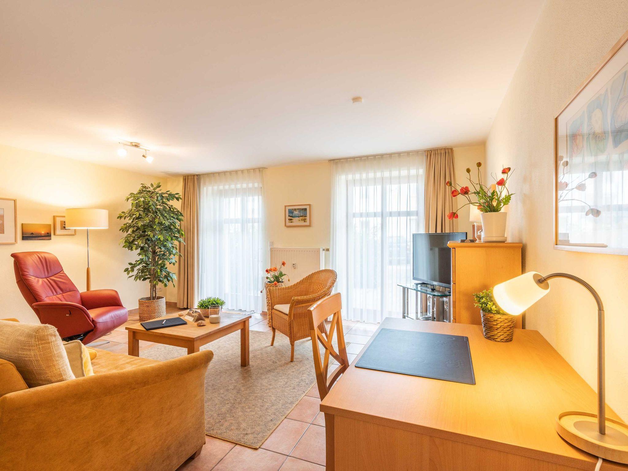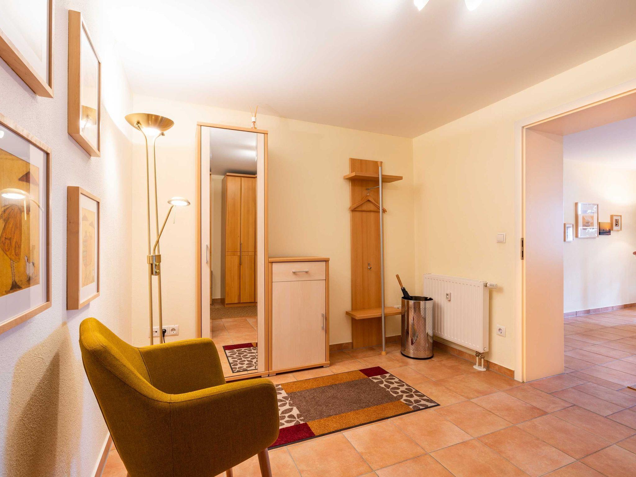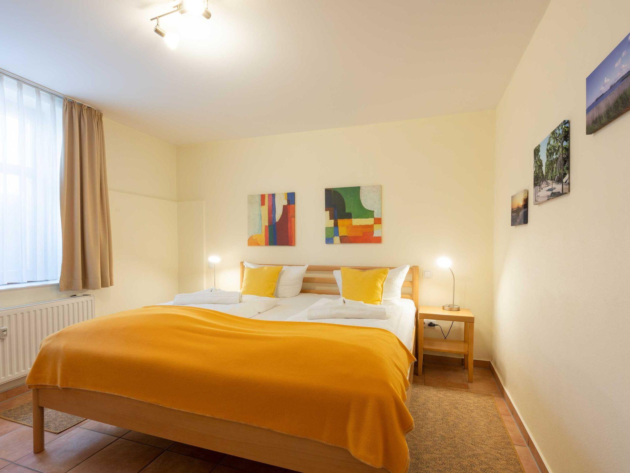 Die helle, freundliche & behindertenfreundliche Ferienwohnung befindet sich im Souterrain des Altbaus der Villa Linquenda. Die 86 qm große Wohnung ist hochwertig eingerichtet und bietet Platz für maximal 3 Personen und ein Kleinkind. Sie verfügt über ein Wohnzimmer mit Sitzgruppe (Schlafsofa) & Flat-TV, eine komplett ausgestattete Küche, ein Schlafzimmer mit Doppelbett (1,80m x 2,00m, verstellbares Lattenrost am Kopf- und Fußteil) und zusätzlichem Flat-TV sowie ein separates befahrbares Ankleidezimmer. Das Bad verfügt über eine ebenerdige Dusche (mit Klappsitz und Haltegriff) und Toilette (klappbare Haltebügel). Eine Terrasse rundet das Angebot der Wohnung ab.