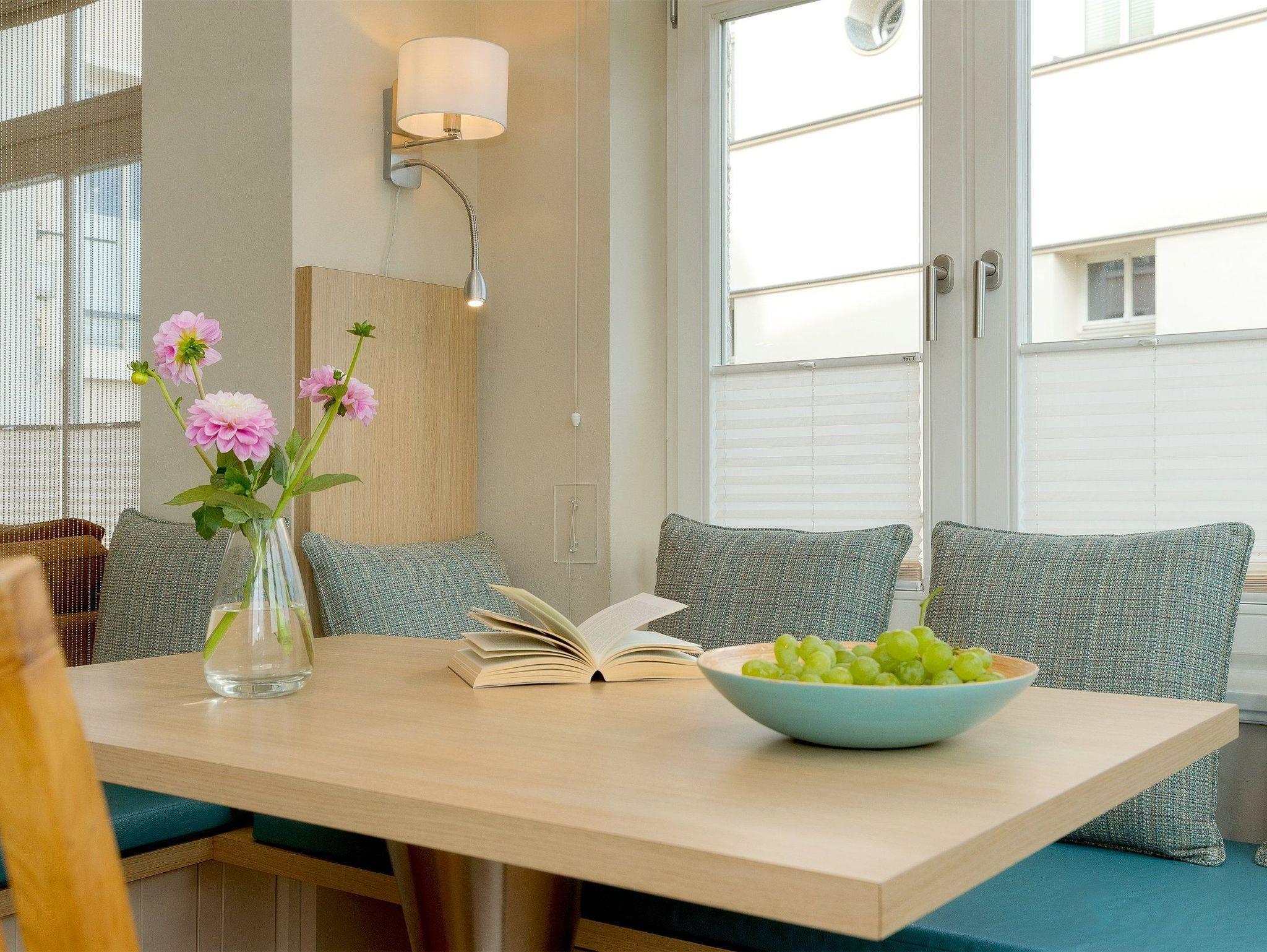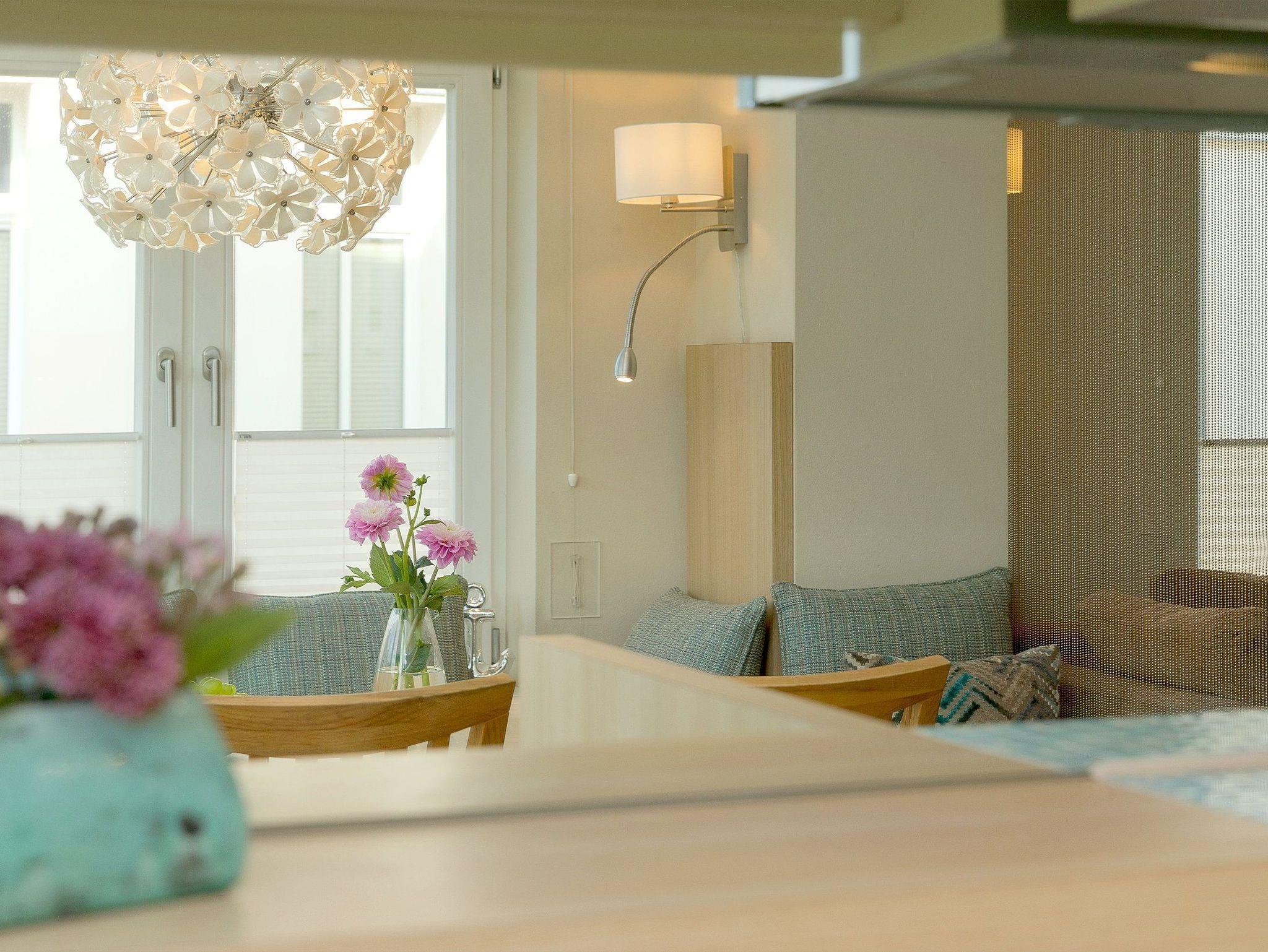 Das Appartement wurde von der professionellen Hand eines Innenarchitekten eingerichtet. Die farbliche Gestaltung in Pastell und Blau zaubert ein Ambiente von Strand und Meer in Ihre Ferienwohnung. Der Wohnbereich ist mit einem Flachbildfernseher, DVD-Player und einer gemütlichen Polstersitzecke ausgestattet, die zum Erholen einlädt.