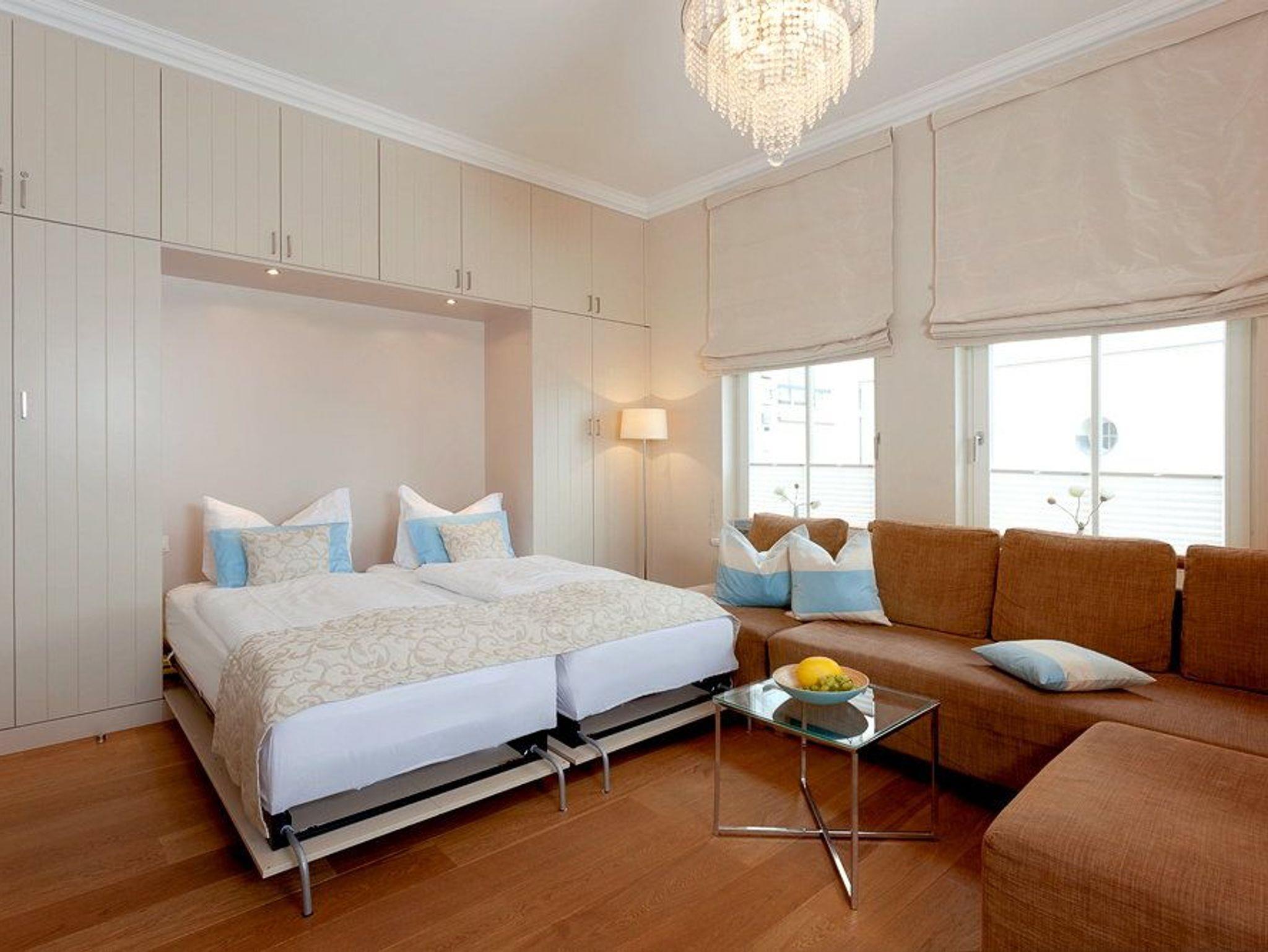 Im Wohnraum befindet sich ein hochwertiges Schrankbett (180 x 200cm / zwei getrennte Matratzen), dass Sie für die Nachtruhe im Handumdrehen in eine Schlafstätte für zwei Personen verwandeln und tagsüber einfach einklappen.