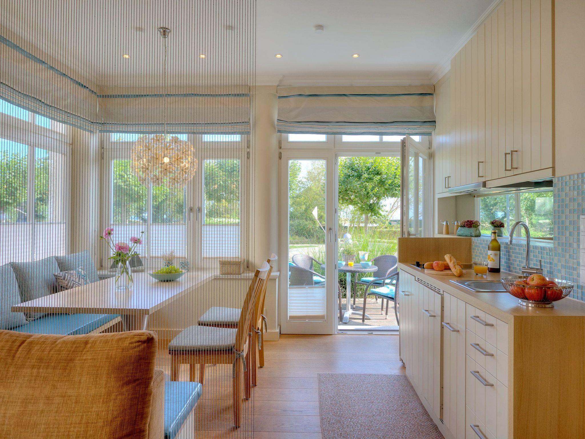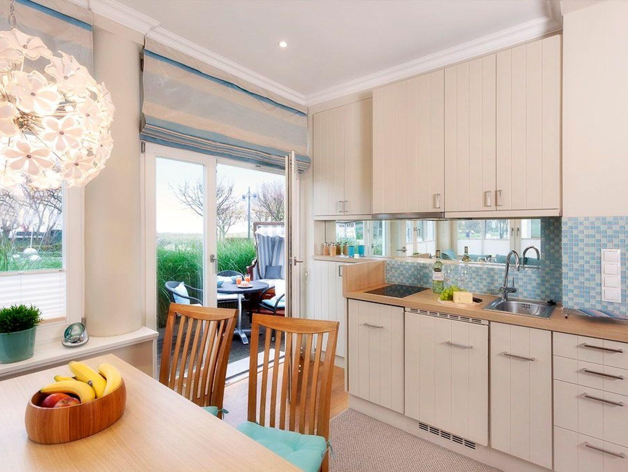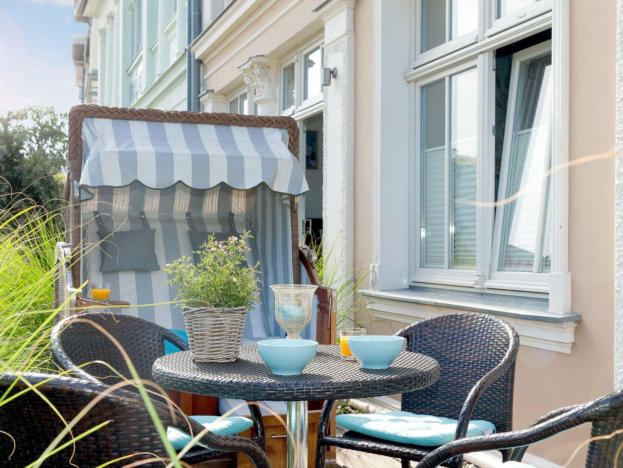 Vom Wohnbereich betreten Sie Ihre private Nordost-Terrasse mit eigenem Strandkorb, von der Sie eine wundervolle Sicht auf die Ostsee und die Ahlbecker Promenade haben. In der Loggia ist eine gut ausgestattete Küche mit Ceranfeld, Mikrowelle (mit Grillfunktion), Kühlschrank mit Gefrierfach und Geschirrspüler integriert. Der Wohnbereich und die Loggia können durch einen dekorativen Vorhang optisch voneinander getrennt werden.