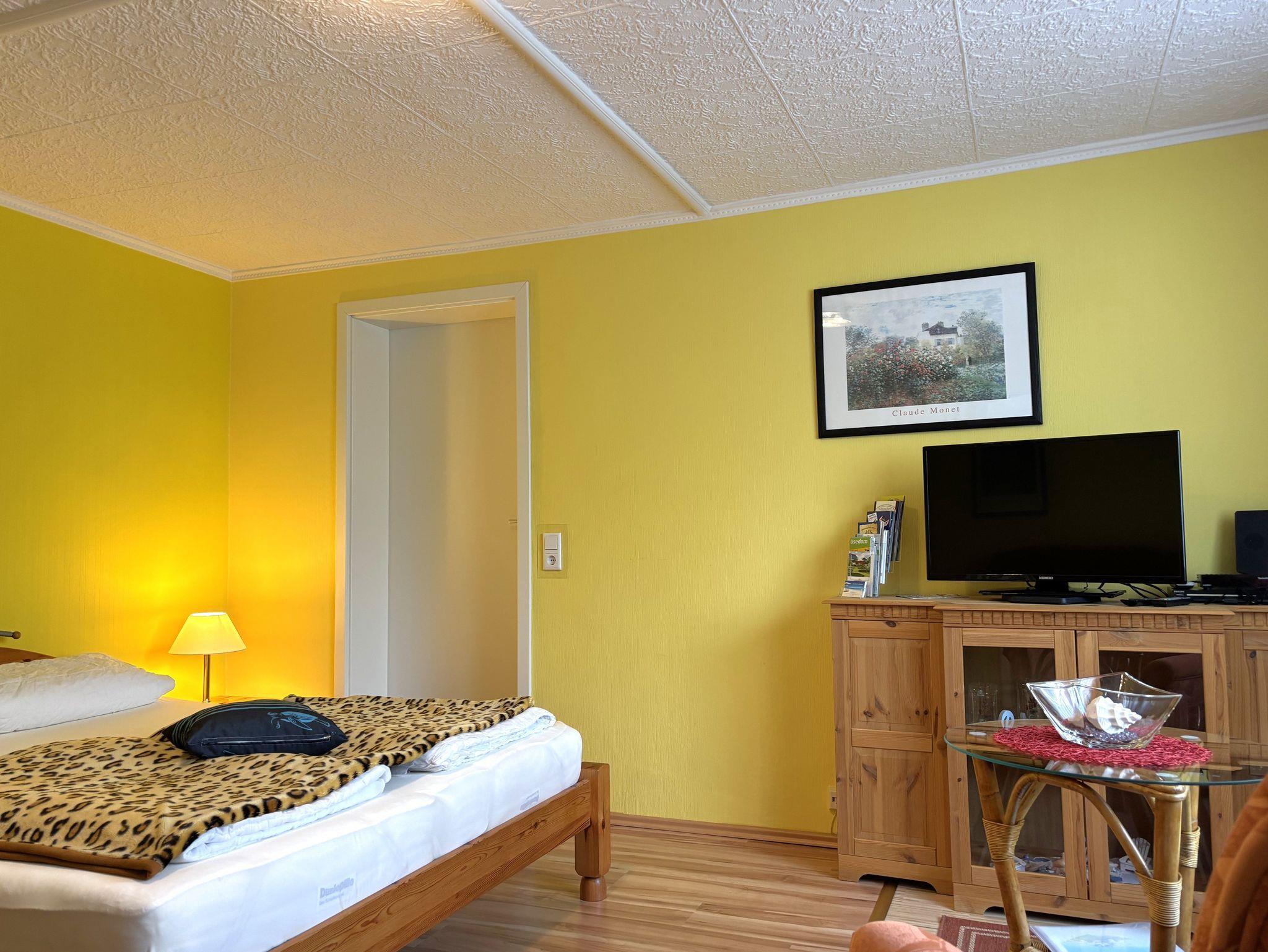 Ein Schlafzimmer ist mit einem Doppelbett ausgestattet und dient gleichzeitig als kombiniertes Wohn- und Schlafzimmer. Hier finden Sie zusätzlich eine gemütliche Couch sowie einen Fernseher für entspannte Abende.