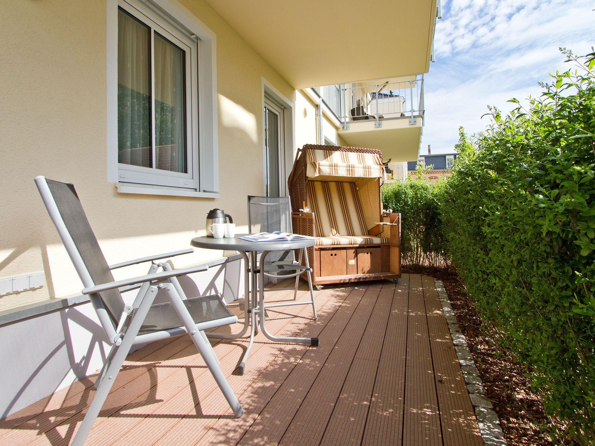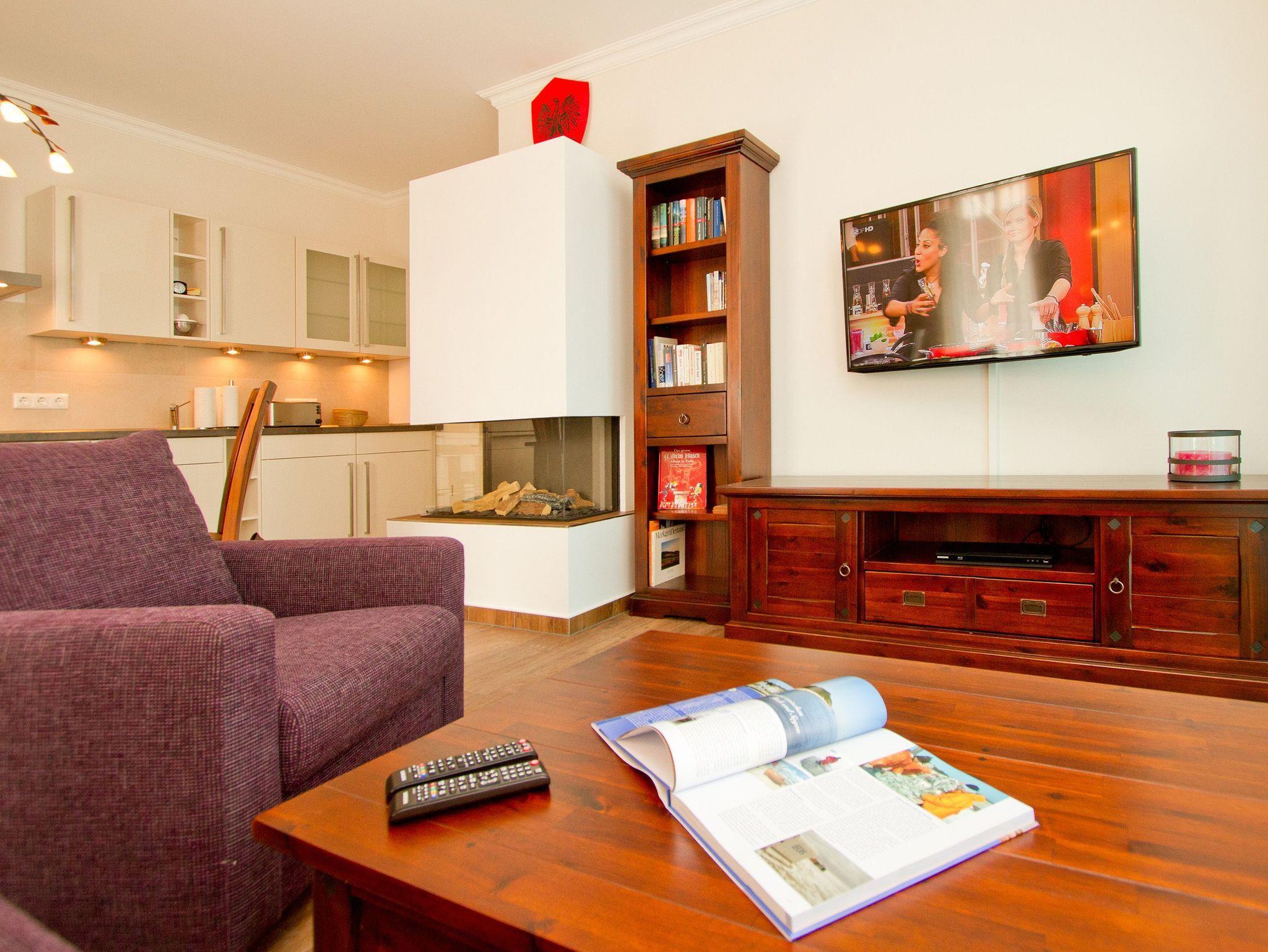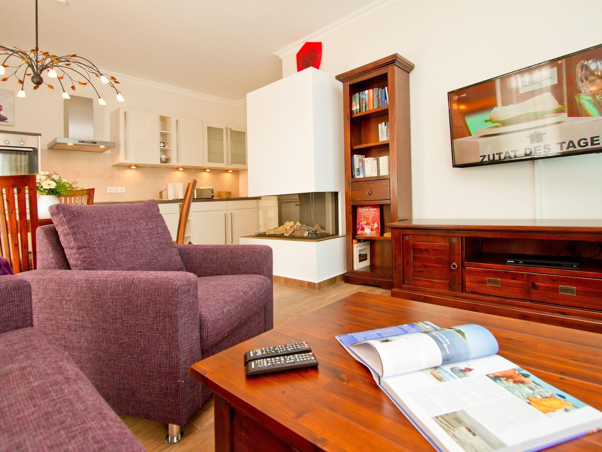 Dünenpalais Ferienwohnung 6: Im Erdgeschoss des Südhauses befindet sich dieses schöne 3-Raum-Appartement für 4 Personen und ein Kleinkind (bis 3 Jahre im Kinderreisebett). Der gemütliche Wohnraum wird ergänzt durch die moderne, komplett ausgestattete Küchenzeile mit Essbereich. Die beiden Schlafzimmer sind mit Doppelbetten (1,80 m x 2 m) und je einem Flat-TV ausgestattet, hier findet sich auch genug Platz für ein Kinderreisebett (kann im Vorwege ohne Matratze [&] Bettzeug gegen einen Aufpreis bestellt werden). Zum hellen Bad mit großer Echtglasdusche und WC gibt es zusätzlich ein Gäste-WC. Ein besonderes Highlight ist die wohnungseigene Sauna (ideal für 2 Personen) und der per Fernbedienung bedienbare Gaskamin. Wer keine Lust auf Strand hat, macht es sich wahlweise auf dem großen, sonnigen Südbalkon (teilweise überdacht) oder der schönen Terrasse gemütlich, bequeme Gartenmöbel und ein Strandkorb sowie Sonnenliege warten hier auf Sie. Für Ihren Komfort steht die Erstausstattung Wäsche für Sie bereit. Ein Pkw-Stellplatz befindet sich in der Tiefgarage.