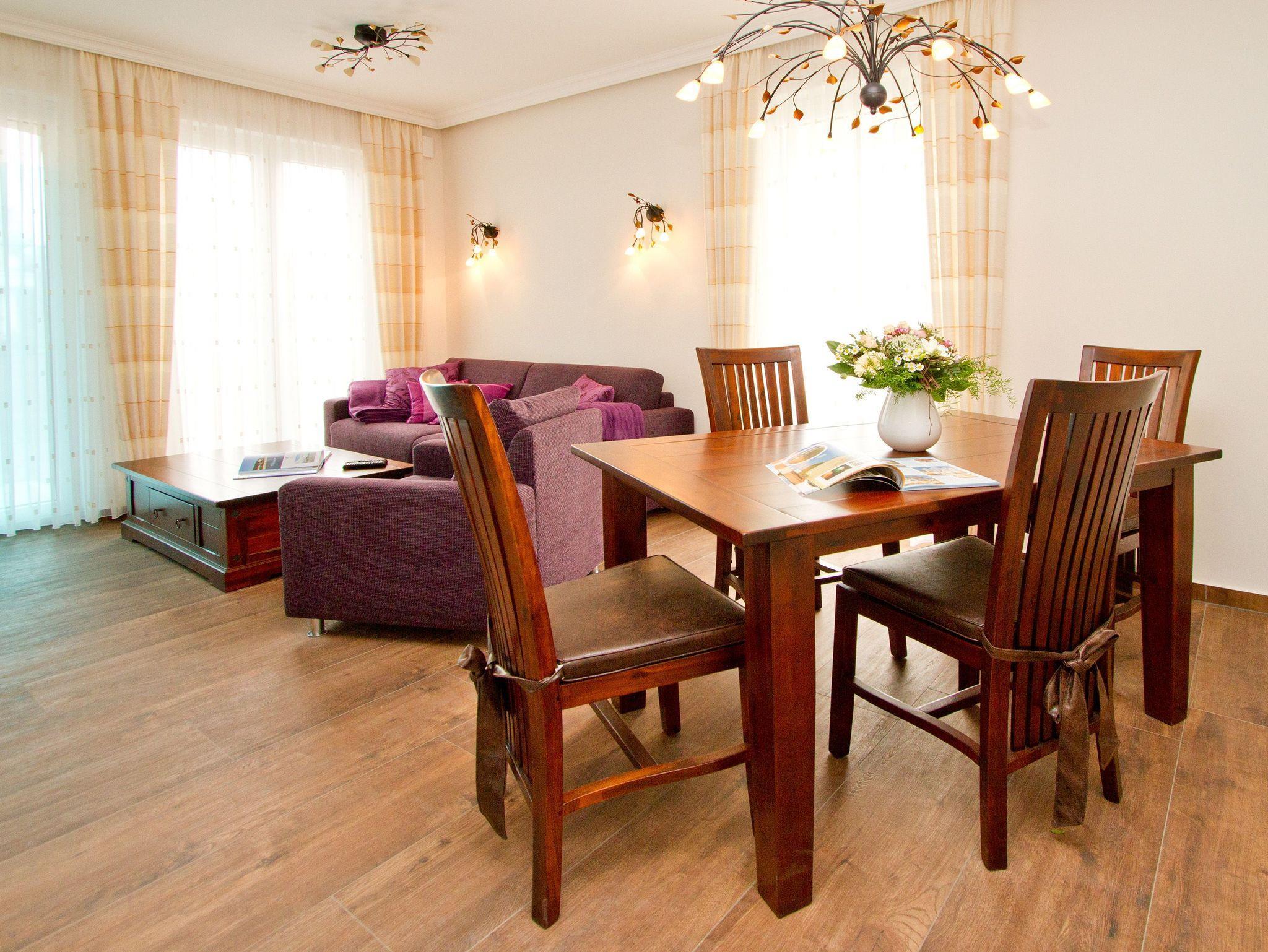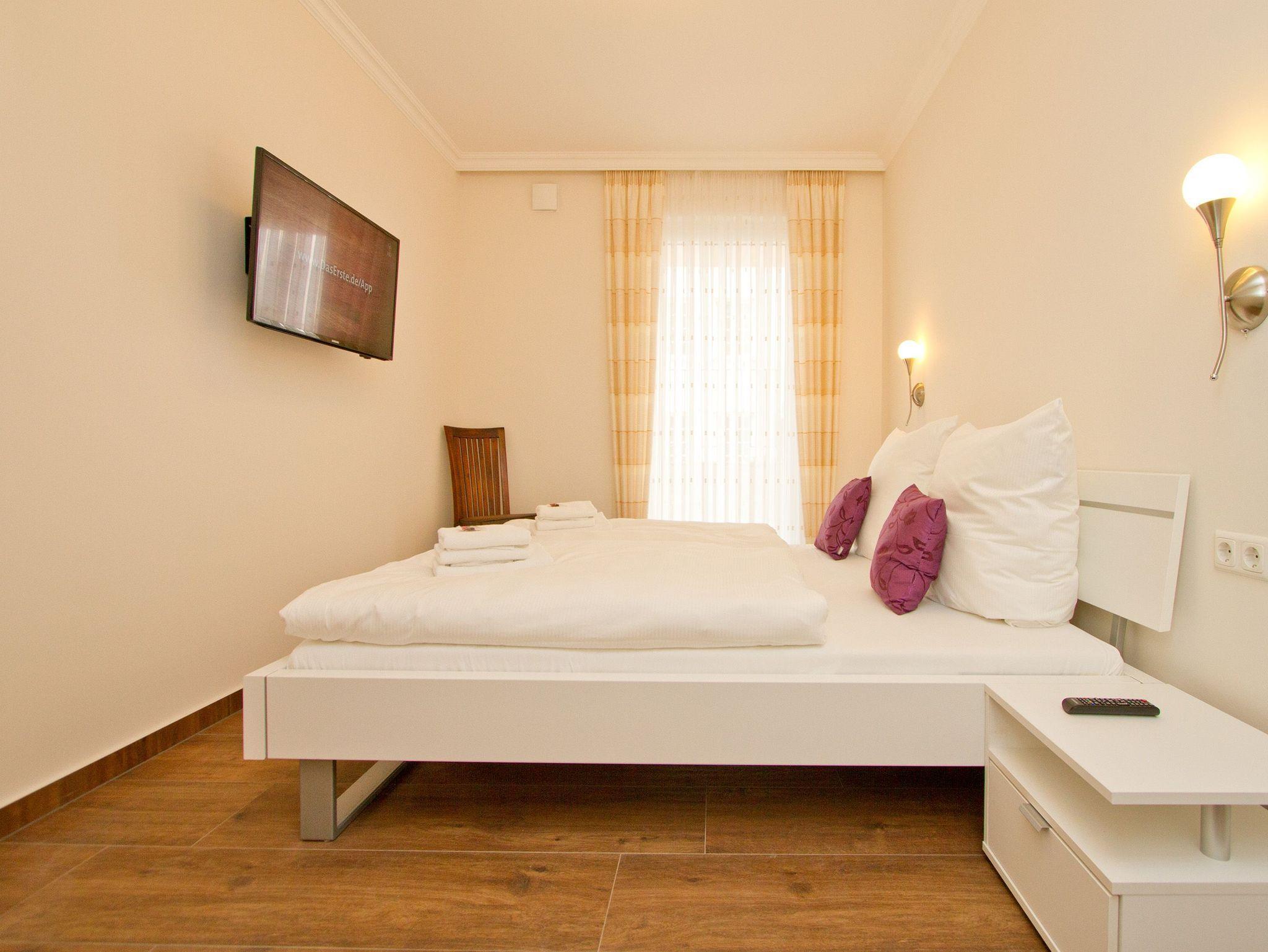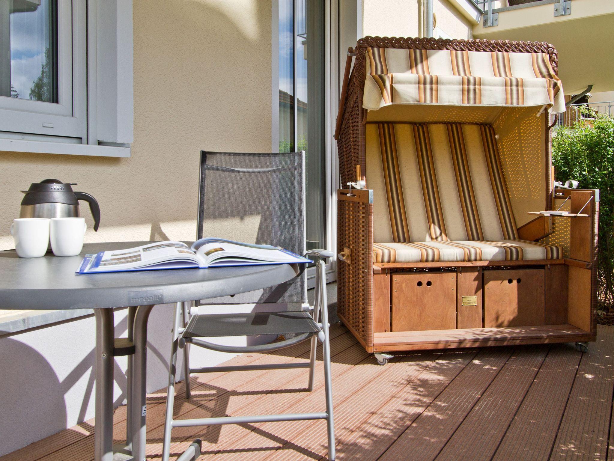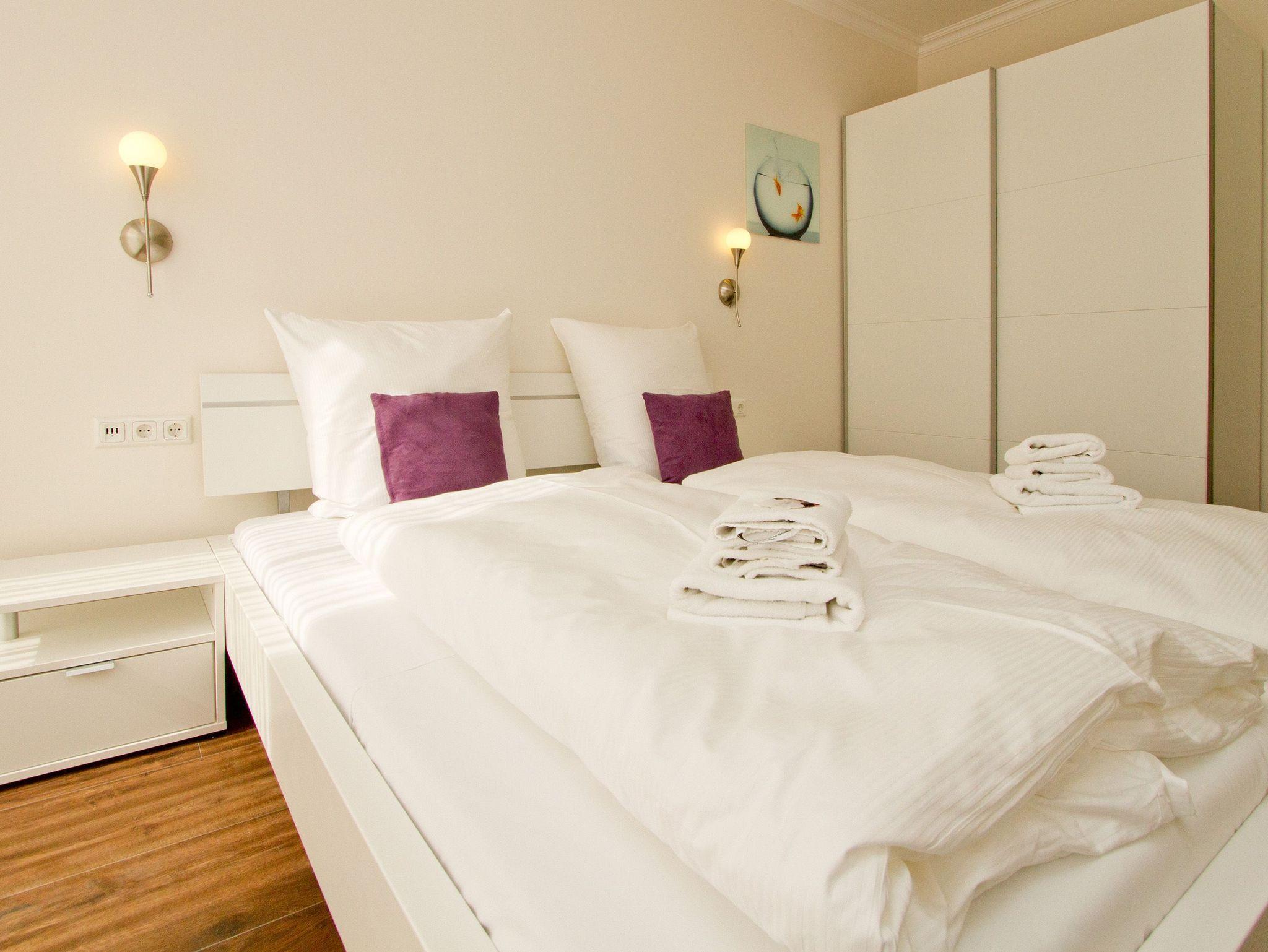 Dünenpalais Ferienwohnung 6: Im Erdgeschoss des Südhauses befindet sich dieses schöne 3-Raum-Appartement für 4 Personen und ein Kleinkind (bis 3 Jahre im Kinderreisebett). Der gemütliche Wohnraum wird ergänzt durch die moderne, komplett ausgestattete Küchenzeile mit Essbereich. Die beiden Schlafzimmer sind mit Doppelbetten (1,80 m x 2 m) und je einem Flat-TV ausgestattet, hier findet sich auch genug Platz für ein Kinderreisebett (kann im Vorwege ohne Matratze [&] Bettzeug gegen einen Aufpreis bestellt werden). Zum hellen Bad mit großer Echtglasdusche und WC gibt es zusätzlich ein Gäste-WC. Ein besonderes Highlight ist die wohnungseigene Sauna (ideal für 2 Personen) und der per Fernbedienung bedienbare Gaskamin. Wer keine Lust auf Strand hat, macht es sich wahlweise auf dem großen, sonnigen Südbalkon (teilweise überdacht) oder der schönen Terrasse gemütlich, bequeme Gartenmöbel und ein Strandkorb sowie Sonnenliege warten hier auf Sie. Für Ihren Komfort steht die Erstausstattung Wäsche für Sie bereit. Ein Pkw-Stellplatz befindet sich in der Tiefgarage.