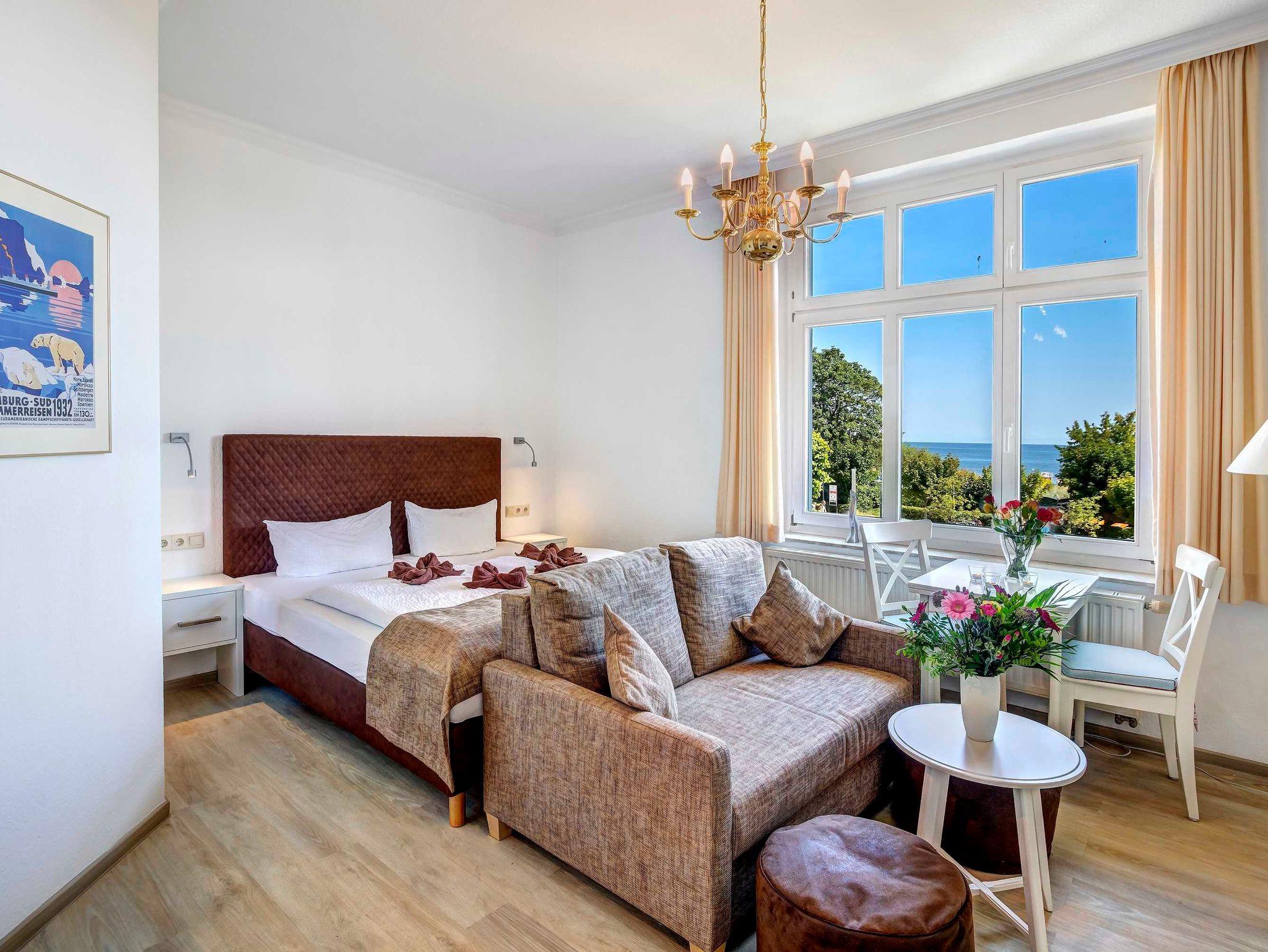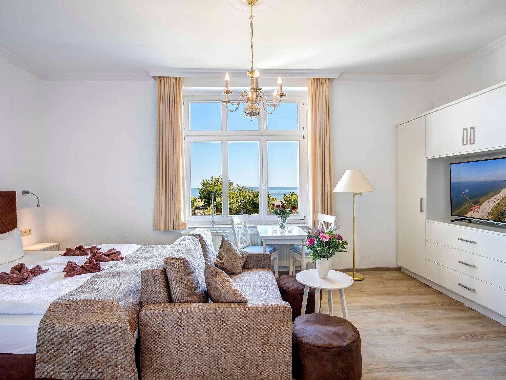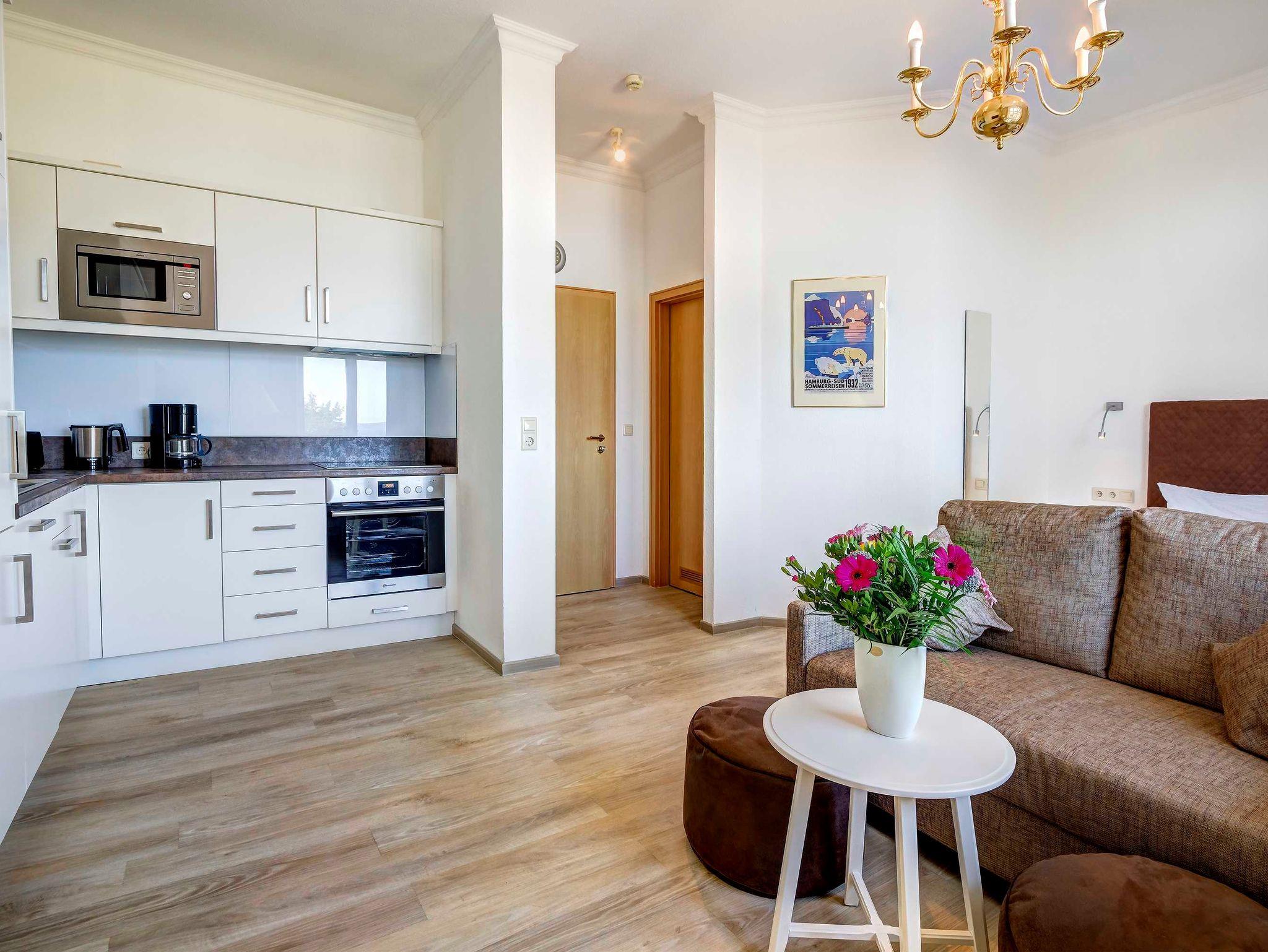 Das geräumige 1-Zimmer-Appartement OG 2 befindet sich im ersten Obergeschoss der Villa Germania nur 40 Meter vom Strand entfernt, direkt an der Strandpromenade. Es verfügt über einen Kombiraum mit einem Doppelbett, einem Essbereich und einer integrierten, voll ausgestatteten Küche mit Kaffeemaschine, Wasserkocher, Toaster, Mikrowelle sowie einer gemütlichen Sitzgruppe. Das Bad ist mit Dusche und WC ausgestattet. Aus dem Appartement haben Sie einen direkten, unverbauten Seeblick. Ein Pkw-Stellplatz steht Ihnen auf dem Grundstück kostenfrei zur Verfügung und Ihre Fahrräder können Sie ebenfalls auf dem Grundstück in einem separaten Abstellraum unterbringen. Alle Wohnungen in der Villa Germania haben passwortgeschütztem DSL-WLAN Internetzugang (gerätegebunden, Euro 1,50 pro Tag und Gerät). Eine Waschmaschine, einen Trockner und eine Sauna können Sie jeweils gegen Gebühr nutzen (Münzgeräte).
