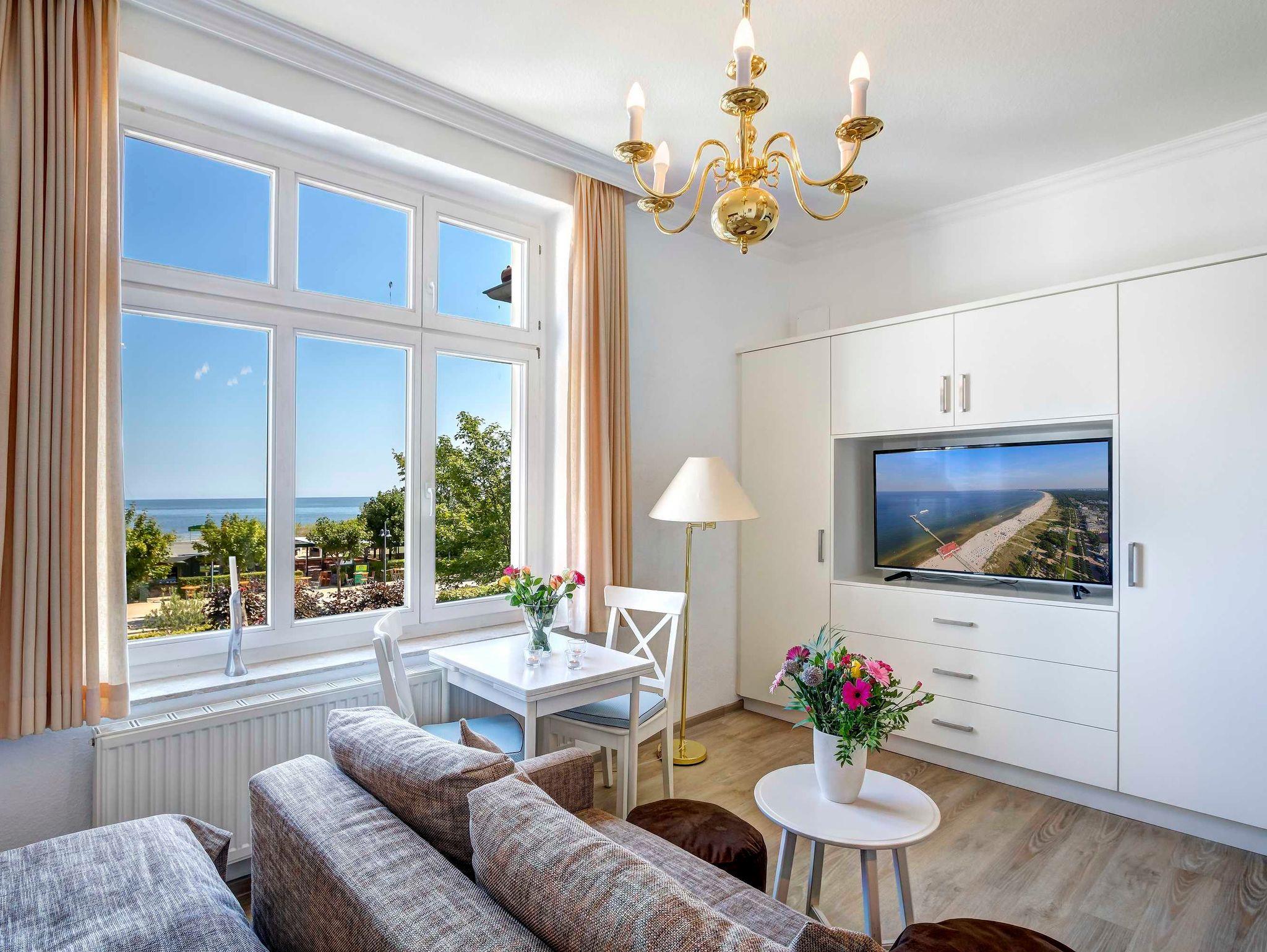 Direkt an der Strandpromenade mit direktem SEEBLICK! Schönes geräumiges 1 - Zimmer - Apartment im I. OG mit hübscher Möblierung und guter Ausstattung, Küchenzeile, Duschbad und Blick zur See. Die Wohnung verfügt über einen Pkw-Stellplatz. In der Garage können Fahrräder und ähnliches untergestellt werden. Im Haus gibt es eine Sauna. Von der Villa Germania aus können Sie das Ortszentrum und die bekannte Ahlbecker Seebrücke in ca. 3 Minuten zu Fuß erreichen. Zum Strand sind es 50 m. Von Mai bis September ist ein Strandkorb im Tagespreis enthalten im Jahr 2025, ab 2026 nicht mehr.