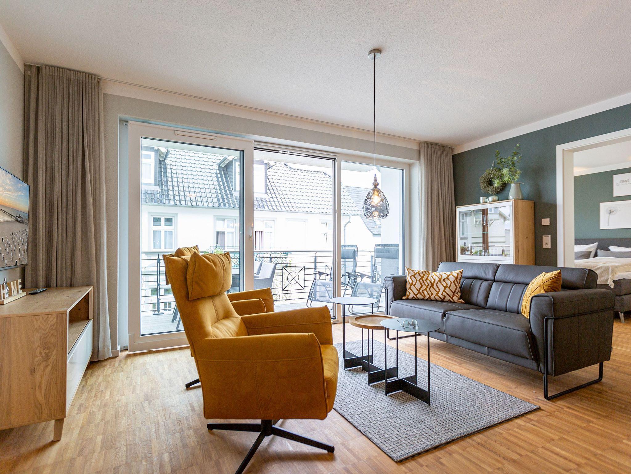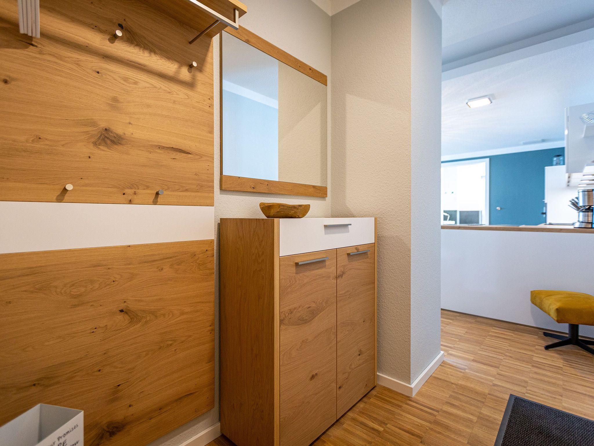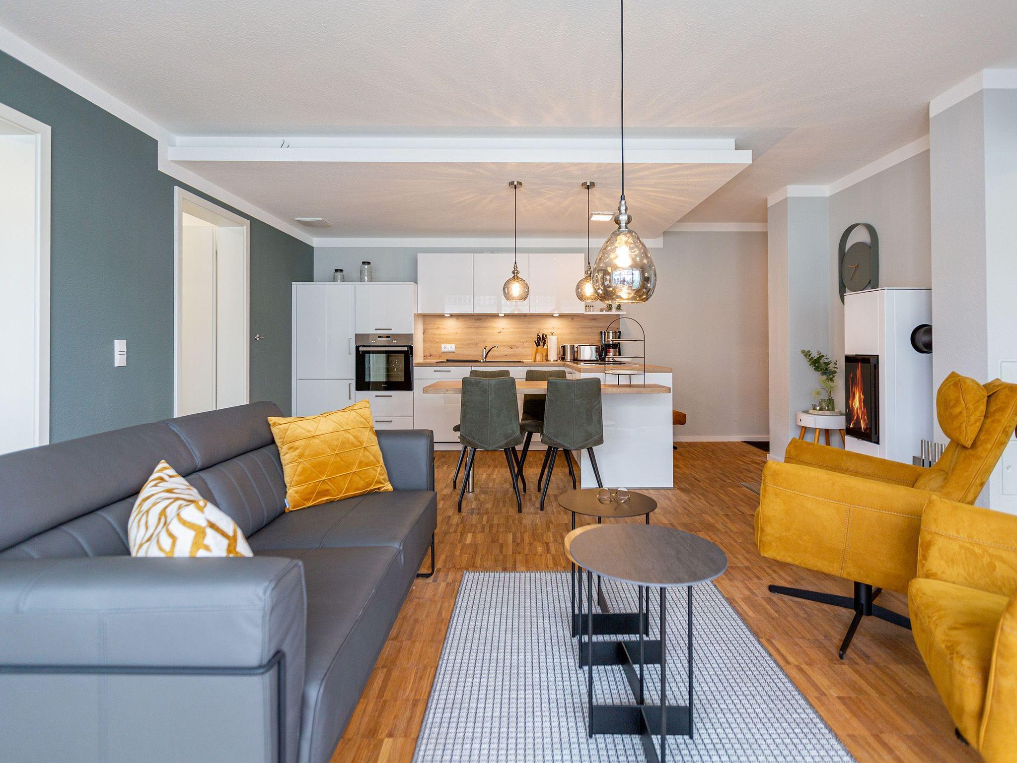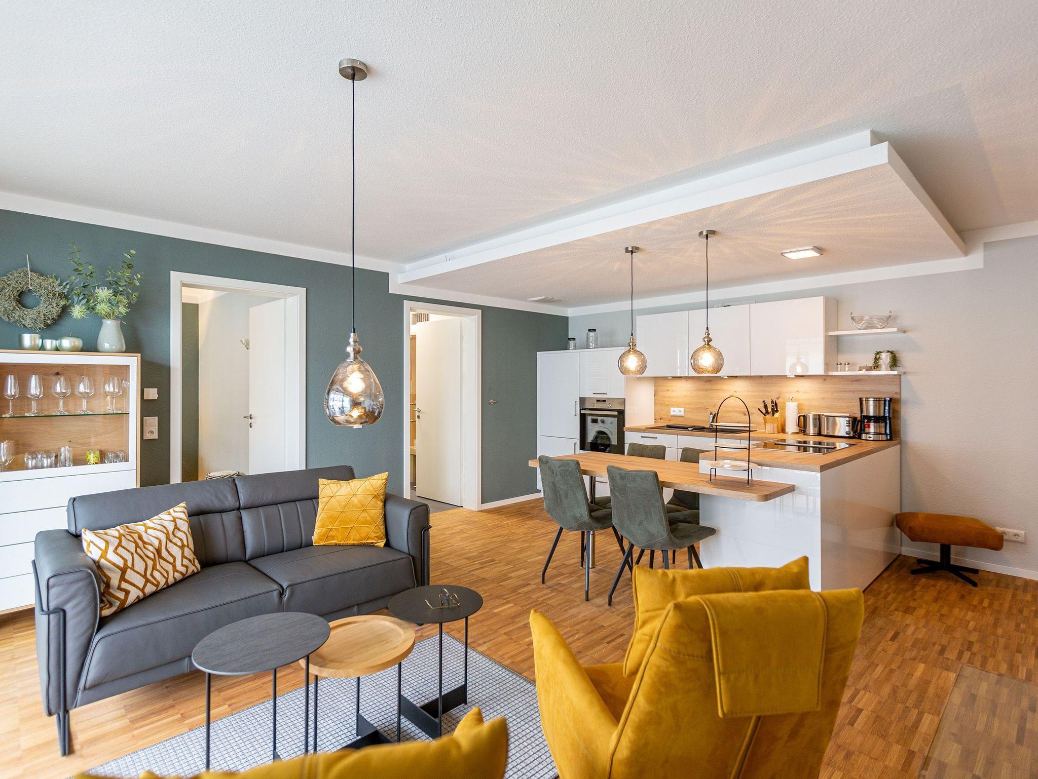 Bodentiefe Fenster lassen viel Licht in dieses moderne und gemütliche Drei-Zimmer-Appartement hinein. Die 76 Quadratmeter im ersten Obergeschoss bestechen mit stylischen Möbeln, mit viel Glas und Holz. Bis zu vier Personen und ein Kleinkind (im Babyreisebett) finden hier viel Platz für ihren Ostseeurlaub. Das Urlaubsdomizil hat ein offenes Wohn-Esszimmer mit einer bequemen Design-Landschaft aus Sofa und Sesseln, Smart-TV und einem Kaminofen. Vom Alltag abschalten? Das gelingt hier garantiert. Vom Wohnzimmer aus treten Sie auf einen West-Balkon mit Gartenmöbeln und zwei Sonnenliegen hinaus. Ob ein gemeinsames Essen unter freiem Himmel oder Entspannen in der Sonne ? hier geht beides. Sonne und Ostseeluft machen hungrig. Die Küche besitzt alles, was man sich für die Zubereitung eines ordentlichen Essens nur wünschen kann. Induktionsherd, Mikrowelle, Geschirrspüler… Alle Geräte sind hochwertig und auf dem neuesten Stand. Geschirr und Töpfe finden Sie in den Schränken. Die beiden Schlafzimmer sind identisch eingerichtet mit jeweils einem komfortablen Boxspringdoppelbett (1,80 m x 2,00 m), Smart-TVs und geräumigen Kleiderschränken. Es gibt zwei Bäder. Das Masterbad hat Tageslicht, Dusche, WC und eine kleine Finnische Sauna. Zudem ist es mit einer Waschmaschine ausgestattet. Das zweite Bad verfügt über eine Dusche und ein WC. Handtücher und Bettwäsche sind im Preis inbegriffen. Auch das WLAN ist kostenfrei. In der Tiefgarage ist für Sie ein Stellplatz reserviert. Im Keller gibt es einen separaten Fahrradraum.