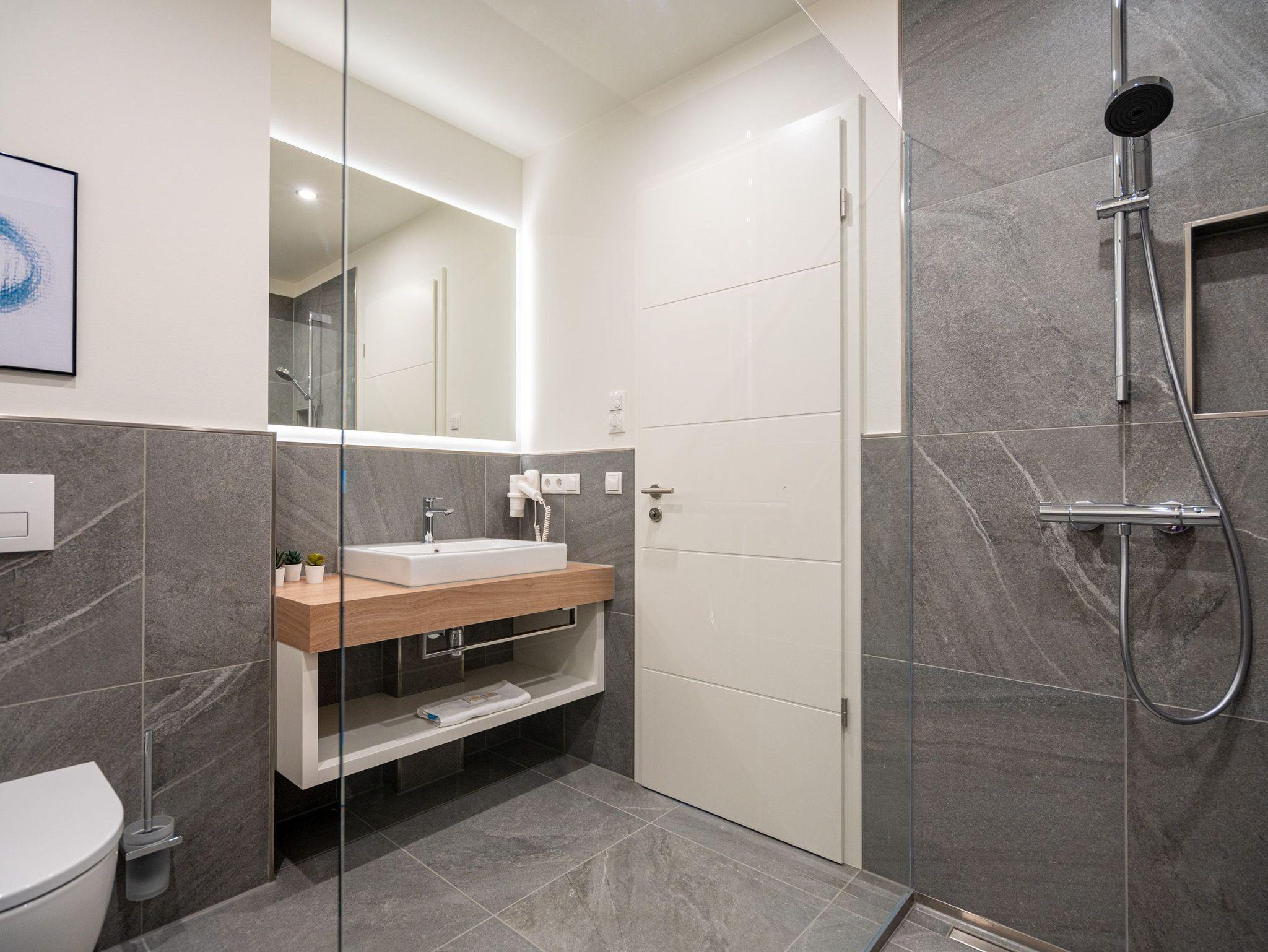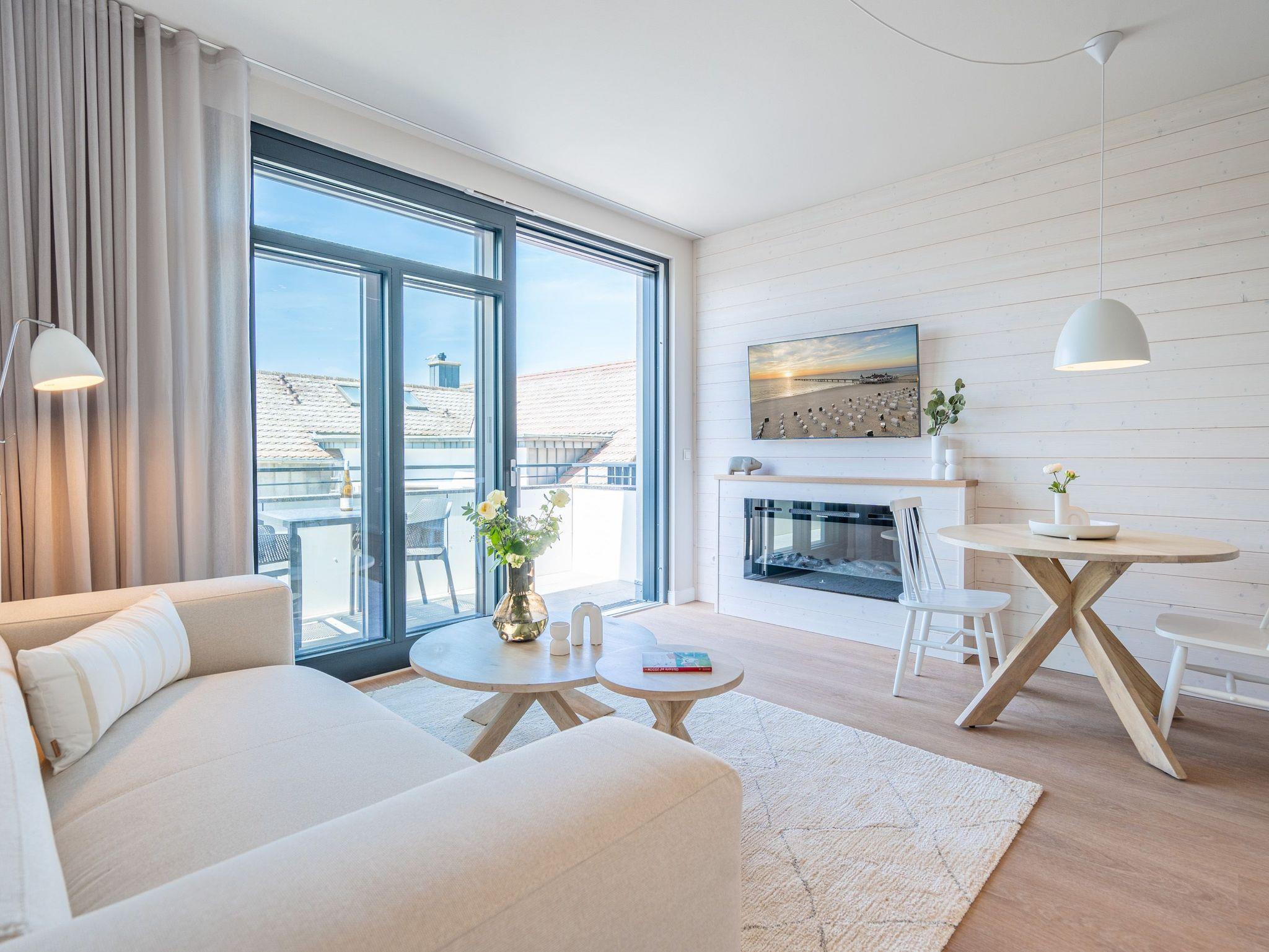 Die 2024 fertig gestellte Strandterrasse liegt direkt an der belebten Strandpromenade und bietet einen einzigartigen Ausblick auf die Grand Dame der historischen Seebrücken sowie die historische Konzertmuschel, einem beliebten Treffpunkt für Kunst und Kultur. Dahinter liegt die Ostsee ? ein Panorama, das zu den schönsten in den Kaiserbädern gehört. Es ist wie das Abtauchen in eine andere Zeit. In eine Zeit, in der man mit Stock, Sonnenschirm und Hut fürs „Sehen und gesehen werden“ über die Promenade schlenderte; aber auch in eine Zeit, in der ? damals wie heute ? Zeit einmal für eine kurze Weile keine Rolle spielt. Weil man angekommen ist im Loslassen, Entspannen und Genießen. Es ist dieser besondere Geruch nach Meeresluft und Freiheit, der in Erinnerung bleibt. Dazu die Bilder, die man mitnimmt. Von langen Strandspaziergängen, vom Lachen in fröhlich schäumenden Ostseewellen, von der Zeit in einem wunderschönen Urlaubsdomizil. Denn genau das ist die Strandterrasse mit ihren 56 modernen und exklusiven Ferienappartements direkt gegenüber der Ahlbecker Seebrücke. Die Ein-, Zwei- oder Dreizimmerwohnungen ? zwischen 40 und 70 Quadratmeter groß ? sind von einer Innenarchitektin gemeinsam mit unserem Erfahrungsschatz an Gästewünschen mit viel Liebe zum Detail und ganz individuell konzipiert worden. Entspannung und Wohlfühlen stehen an erster Stelle. Alles ist aufeinander abgestimmt und sorgt für eine gemütliche Atmosphäre. Wählen Sie zwischen einem Domizil in einem hellen, sandfarbenen Designkonzept oder einem Appartement mit anthrazitfarbenen Farbakzenten. Alle Appartements verfügen gleichermaßen über eine stilvolle und komfortable Einrichtung, die passgenau angefertigt worden ist, sowie über moderne Küchen und Bäder. Jedem Schlafzimmer ist ein eigenes Bad mit Dusche zugeordnet (außer App. B4.5). Die Appartements besitzen fast alle einen Balkon ? viele schauen sogar zur Ostsee hinaus. Die meisten Feriendomizile haben einen Elektrokamin und Infrarotsaunen. Im Erdgeschoss befindet sich ein separater Gemeinschaftsraum für Fahrräder. Außerdem besteht die Möglichkeit, im Gemeinschaftswaschraum 2 Waschmaschinen [&] Trockner zu nutzen. Ergänzt wird das Angebot durch eine Gemeinschaftssauna, die täglich von 11:00 bis 22:00 Uhr nutzbar ist. In der Tiefgarage (Einfahrtshöhe 2,03 Meter) steht für jede Wohnung 1 Pkw-Stellplatz zur Verfügung. Ist alles zur Zufriedenheit untergebracht? Dann kann der Urlaub ja beginnen. Und beim Blick vom Balkon über die Ostsee treffen sich zum Sonnenaufgang das Heute und das Damals. Gelassenheit legt sich beim Gang hinunter an den Strand auf die Seele. Jetzt darf die Zeit stehenbleiben.