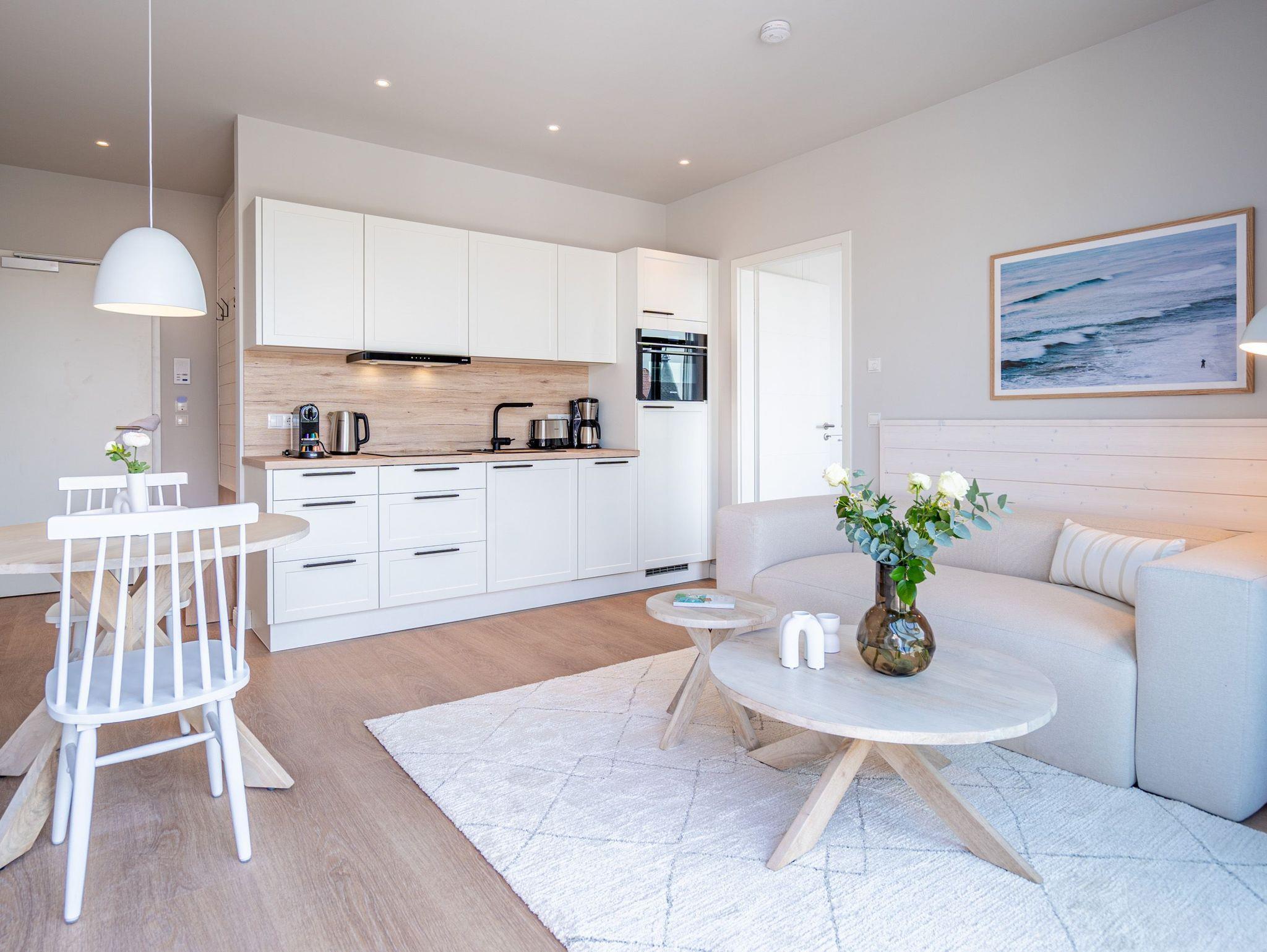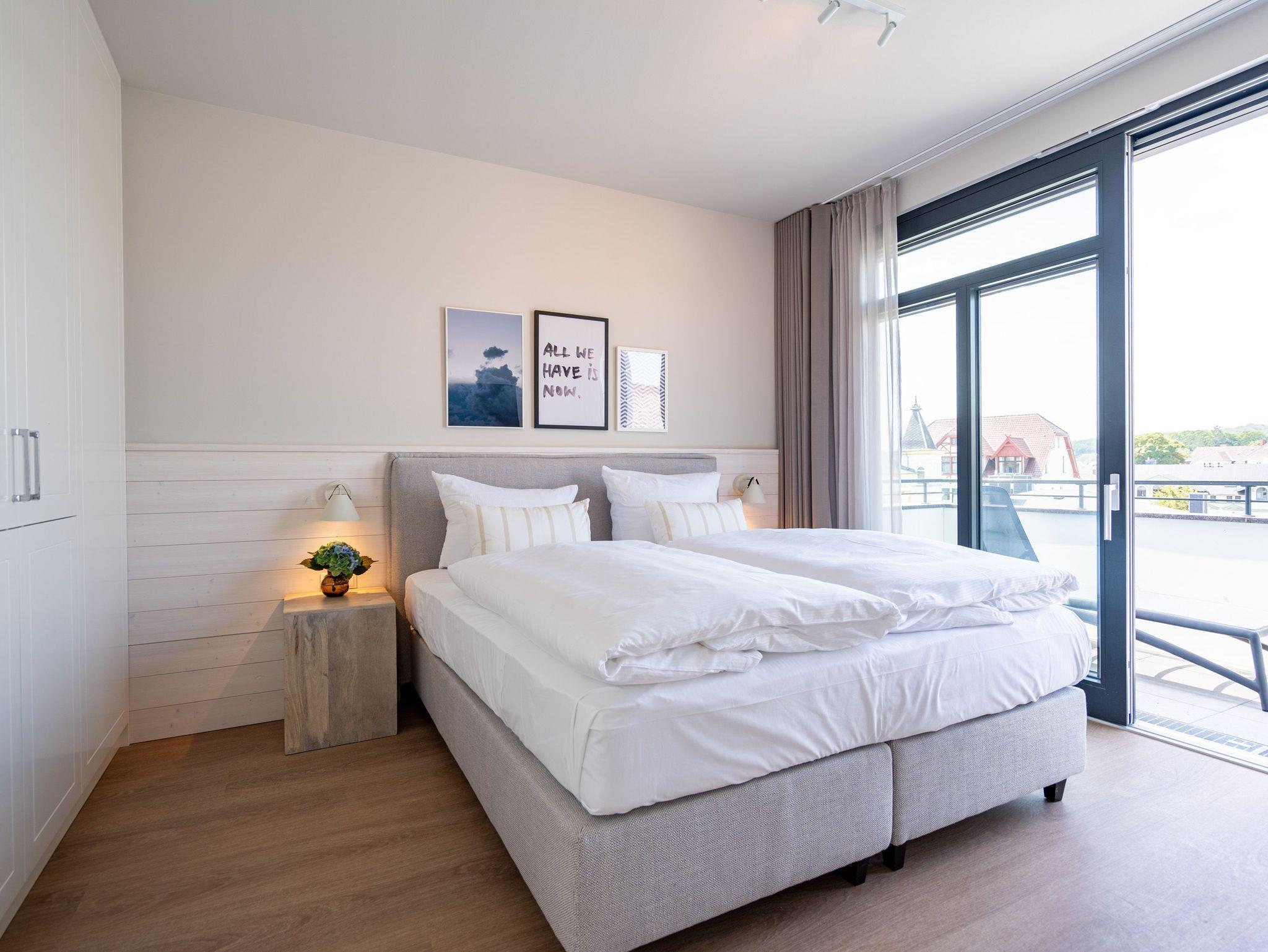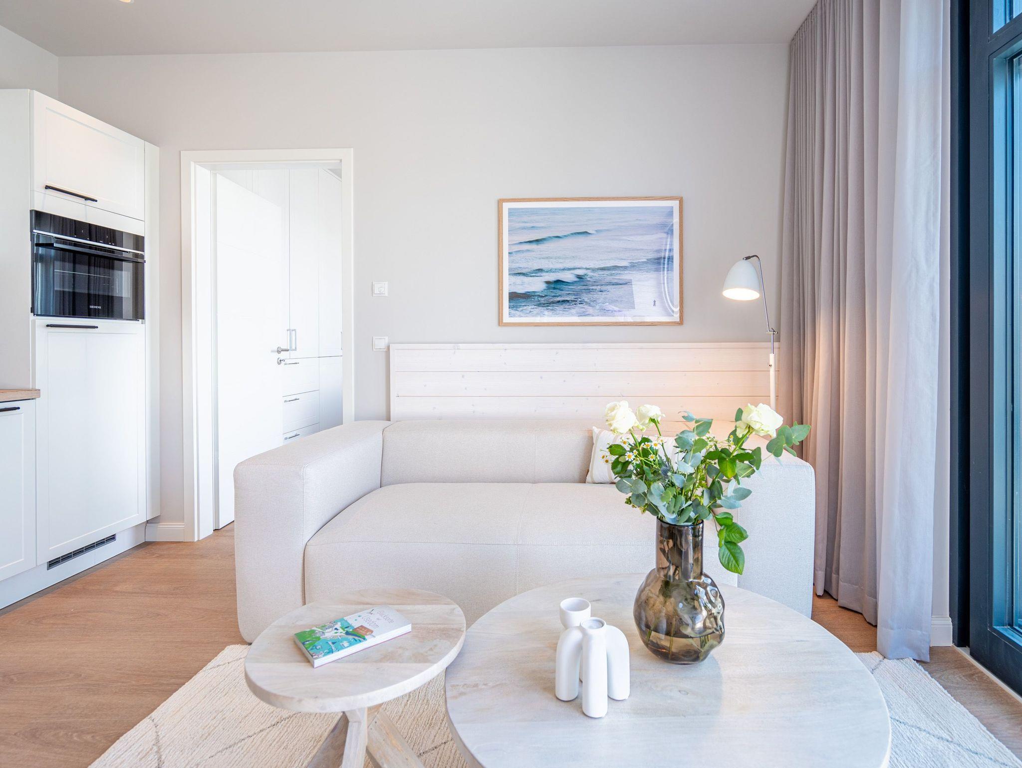 Willkommen im Strandterrasse-Appartement A3.1 (Haus A). Dieses charmante 2-Zimmer-Apartment lädt mit seinen 46 Quadratmetern in der 3. Etage zu einer entspannten Ostseeauszeit für 2 Personen ein. Die großen Fenster lassen viel Licht in dieses exklusive und elegant eingerichtete Feriendomizil der Extra-Klasse. Der offene Wohnbereich begrüßt Sie mit einem schönen, hellen Esstisch, einem kuscheligen Sofa und einem 50-Zoll-Flachbildfernseher. Ein Elektrokamin (ohne Wärmeabgabe) sorgt für eine gemütliche Atmosphäre. Der großzügige Nord-West-Balkon kann sowohl vom Wohnzimmer als auch vom Schlafzimmer aus betreten werden. Hier können Sie bei seitlichem Blick auf die Ostsee von der Sonnenliege oder den Gartenmöbeln aus, Ihre Gedanken bis zum blauen Horizont auf Reisen schicken. Atmen Sie die aerosolhaltige Seeluft tief ein, denn sie ist gesund für die Atemwege und das Immunsystem. In das Wohnzimmer ist eine offene Küche integriert. Die hochwertigen Siemensgeräte wie der Backofen, ein 3-Platten-Induktionskochfeld und eine Geschirrspülmaschine erleichtern das Kochen und anschließende Saubermachen ungemein. Da werden das Genießen und das Entspannen zum Erlebnis. Das Schlafzimmer bietet ein luxuriöses und vor allem äußerst bequemes Boxspringdoppelbett (1,80m x 2,00m), einen geräumigen Kleiderschrank und einen weiteren 43-Zoll-Flachbildfernseher. Das innenliegende Bad ist mit einer Dusche, einem WC und einem Waschtisch ausgestattet. Ein reservierter PKW-Stellplatz in der Tiefgarage sorgt dafür, dass Ihr Fahrzeug sicher untergebracht ist und Sie unbesorgt die Umgebung erkunden können. Erleben Sie unvergessliche Tage am Meer.