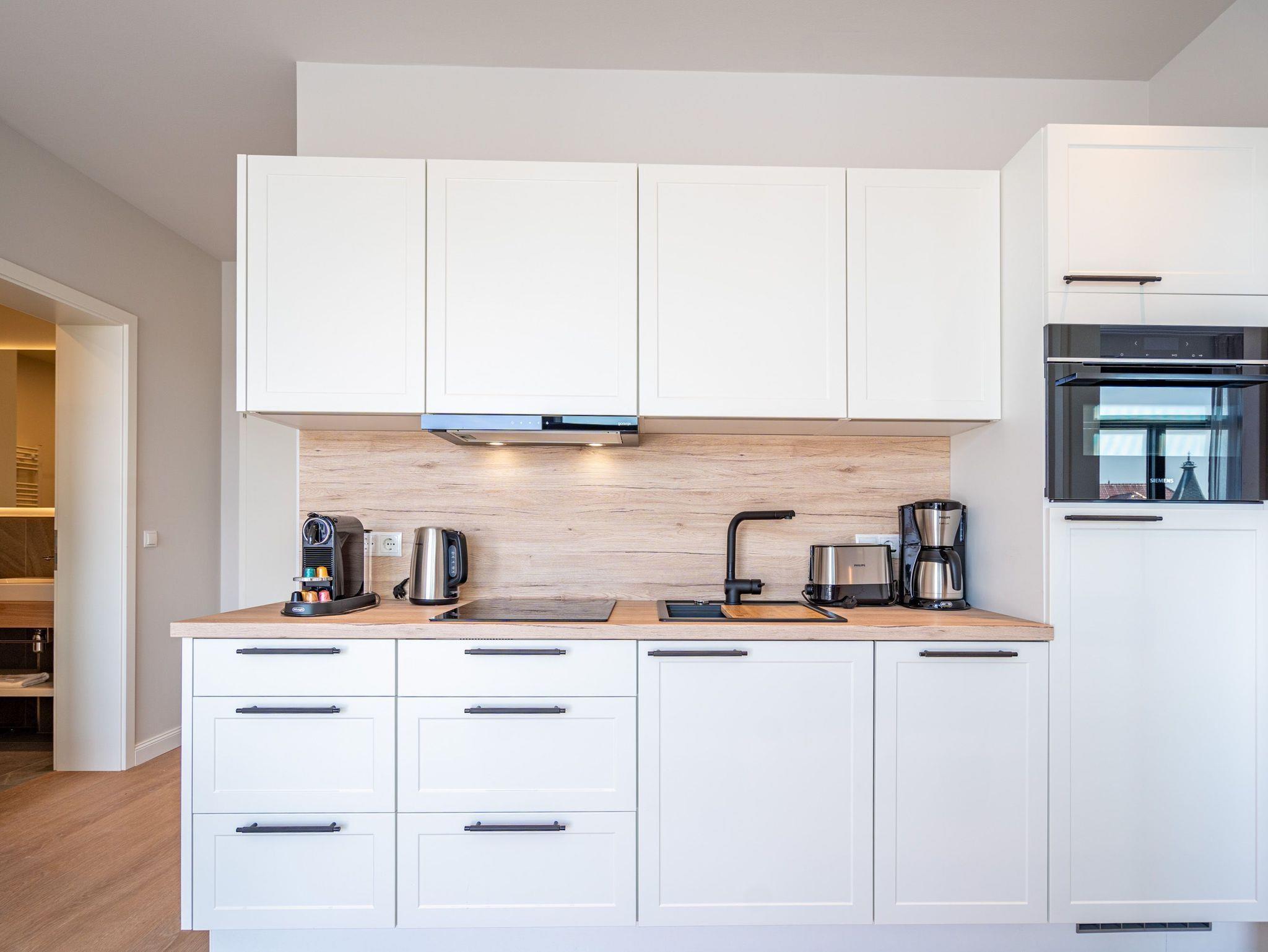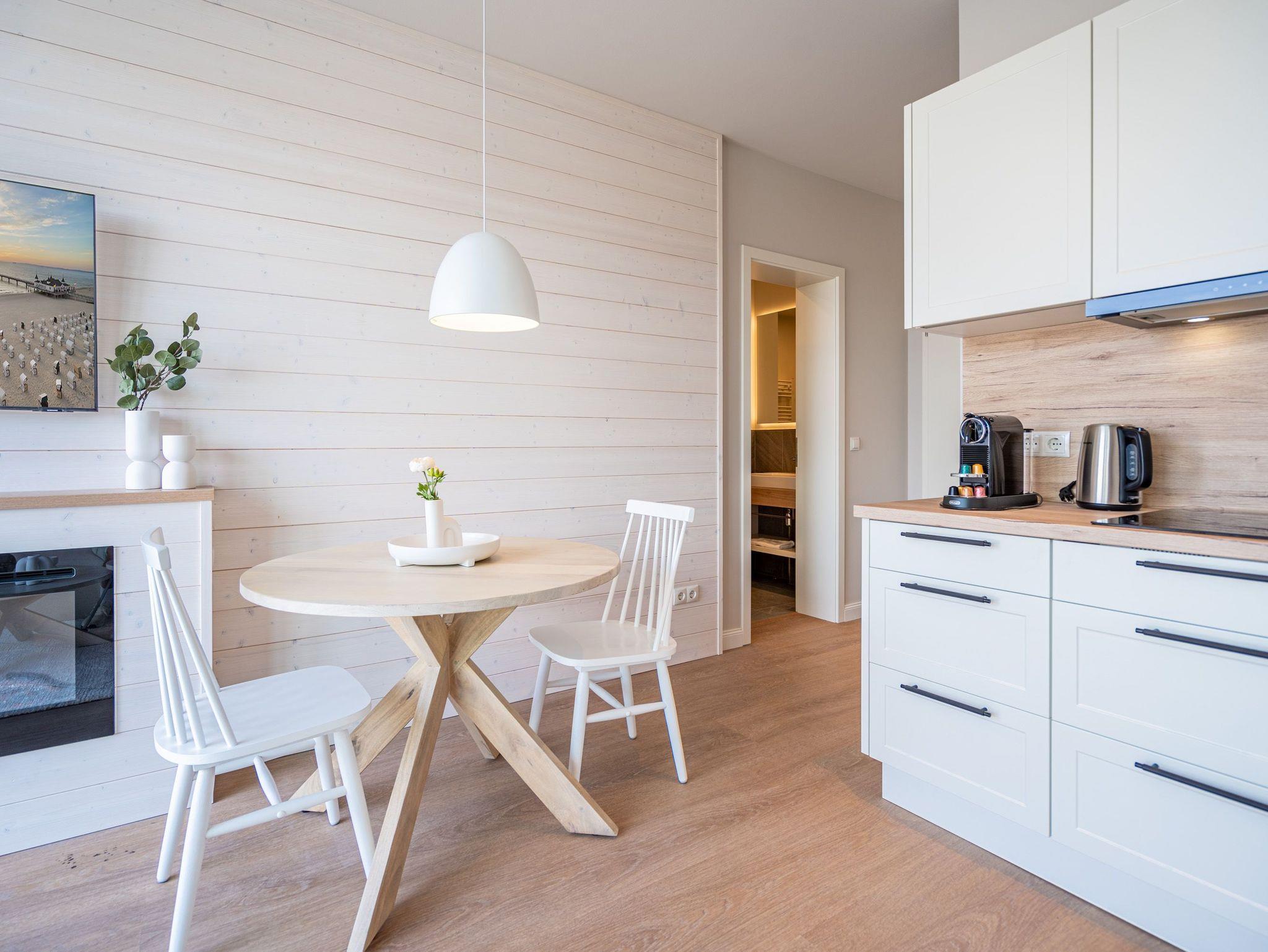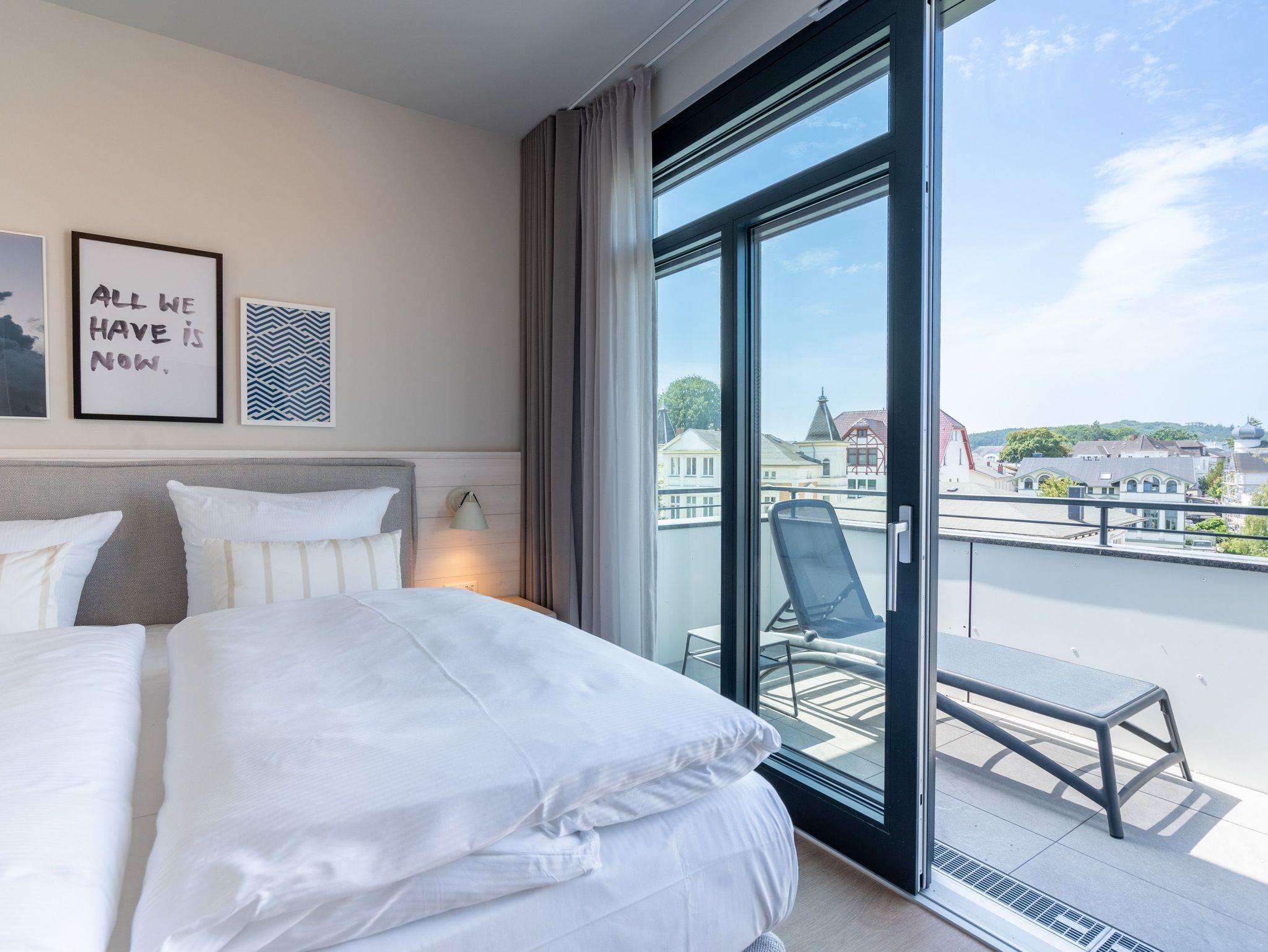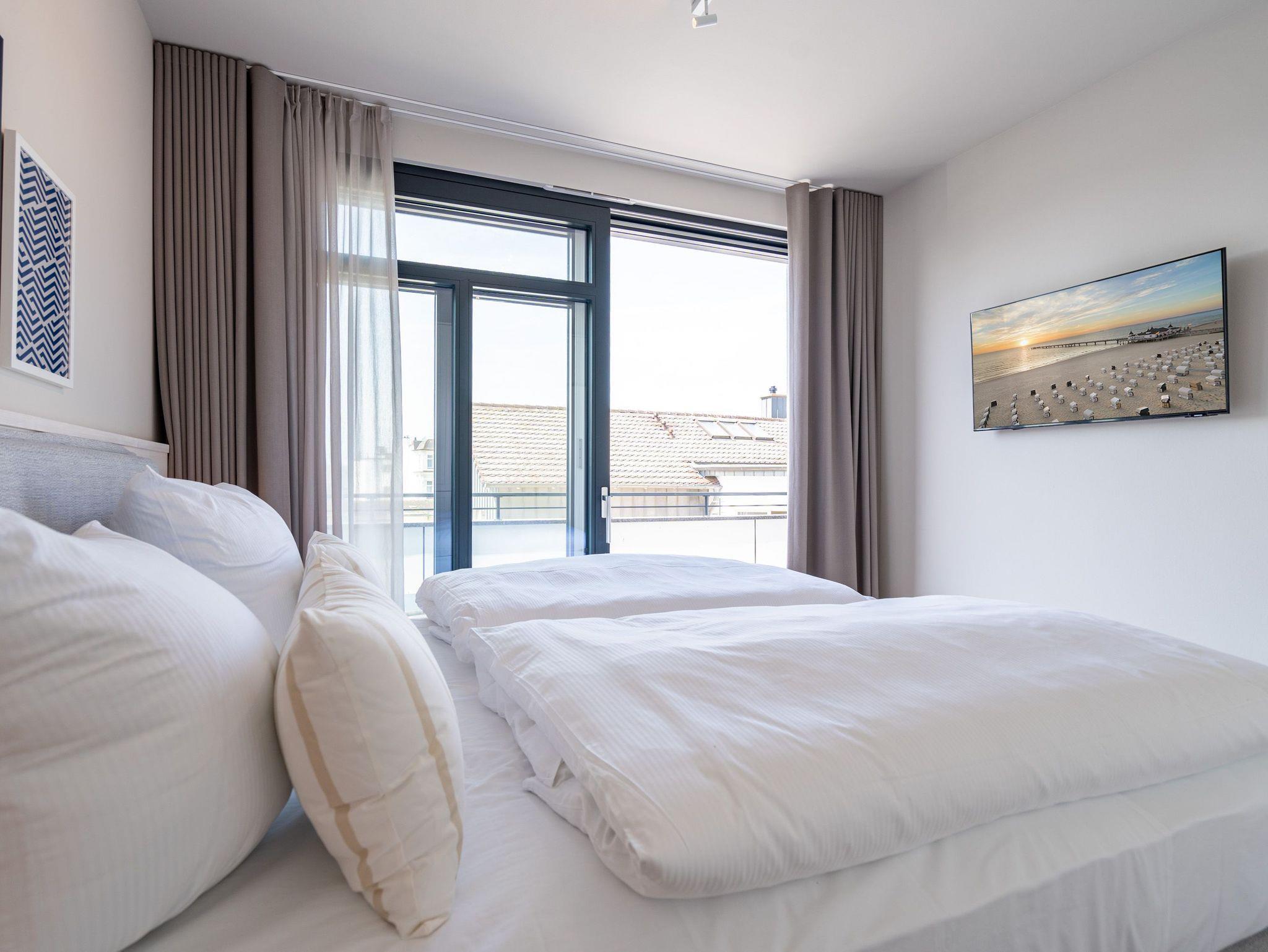 Willkommen im Strandterrasse-Appartement A3.1 (Haus A). Dieses charmante 2-Zimmer-Apartment lädt mit seinen 46 Quadratmetern in der 3. Etage zu einer entspannten Ostseeauszeit für 2 Personen ein. Die großen Fenster lassen viel Licht in dieses exklusive und elegant eingerichtete Feriendomizil der Extra-Klasse. Der offene Wohnbereich begrüßt Sie mit einem schönen, hellen Esstisch, einem kuscheligen Sofa und einem 50-Zoll-Flachbildfernseher. Ein Elektrokamin (ohne Wärmeabgabe) sorgt für eine gemütliche Atmosphäre. Der großzügige Nord-West-Balkon kann sowohl vom Wohnzimmer als auch vom Schlafzimmer aus betreten werden. Hier können Sie bei seitlichem Blick auf die Ostsee von der Sonnenliege oder den Gartenmöbeln aus, Ihre Gedanken bis zum blauen Horizont auf Reisen schicken. Atmen Sie die aerosolhaltige Seeluft tief ein, denn sie ist gesund für die Atemwege und das Immunsystem. In das Wohnzimmer ist eine offene Küche integriert. Die hochwertigen Siemensgeräte wie der Backofen, ein 3-Platten-Induktionskochfeld und eine Geschirrspülmaschine erleichtern das Kochen und anschließende Saubermachen ungemein. Da werden das Genießen und das Entspannen zum Erlebnis. Das Schlafzimmer bietet ein luxuriöses und vor allem äußerst bequemes Boxspringdoppelbett (1,80m x 2,00m), einen geräumigen Kleiderschrank und einen weiteren 43-Zoll-Flachbildfernseher. Das innenliegende Bad ist mit einer Dusche, einem WC und einem Waschtisch ausgestattet. Ein reservierter PKW-Stellplatz in der Tiefgarage sorgt dafür, dass Ihr Fahrzeug sicher untergebracht ist und Sie unbesorgt die Umgebung erkunden können. Erleben Sie unvergessliche Tage am Meer.