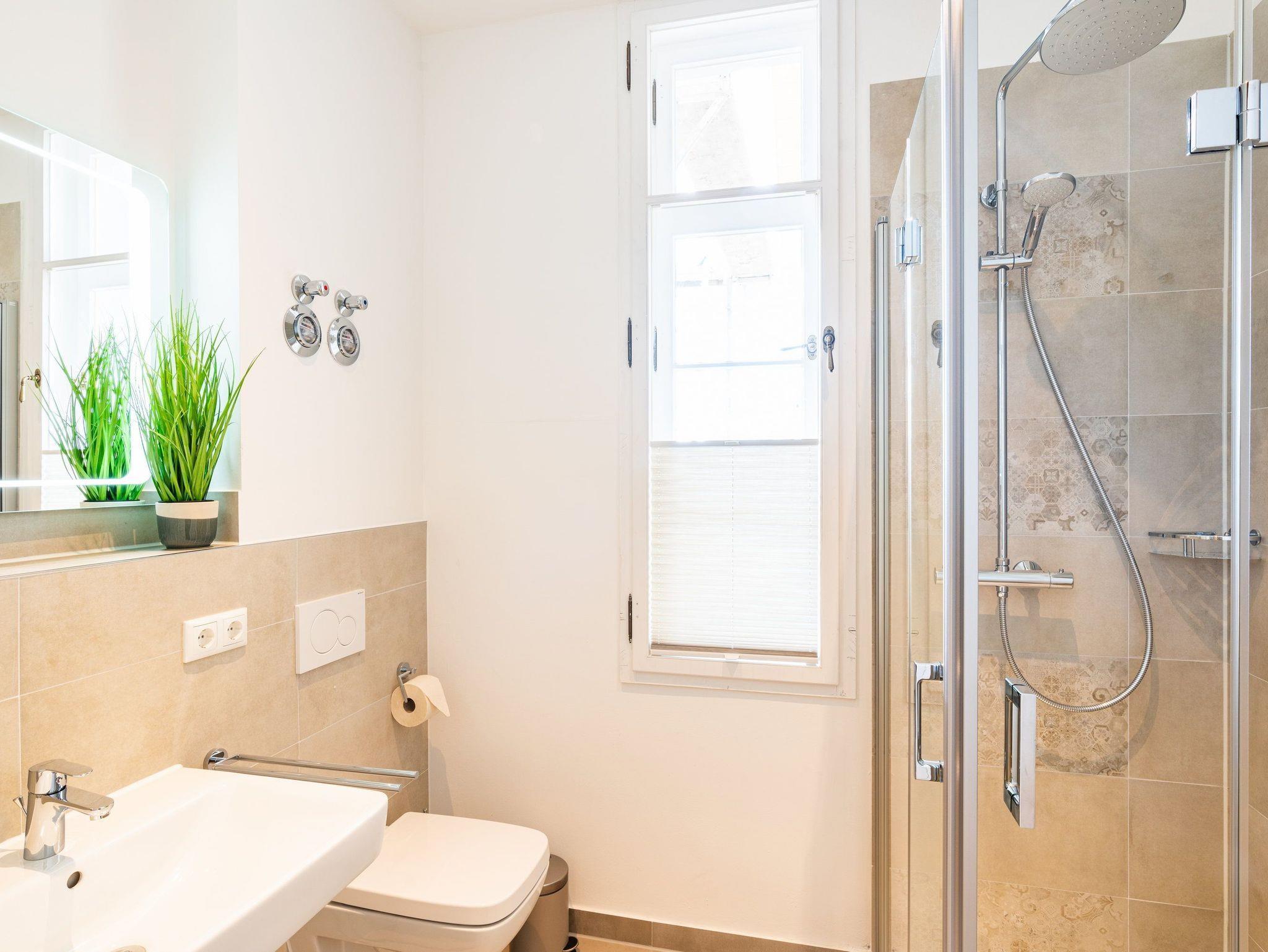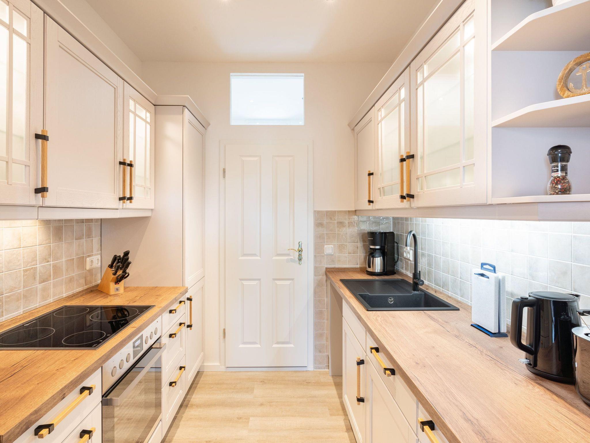 Der gemütliche Wohn- und Essbereich mit bequemen Sofa, Flat TV und separaten Esstisch lädt zu gemeinsamen Fernsehabenden und geselligem Beisammensein ein. Entspannen Sie nach einem erlebnisreichen Tag im angrenzenden Wintergarten mit Blick ins Grüne bei einer schönen Tasse Kaffee. Bereiten Sie gemeinsam in der großen Küche im Landhausstil Ihre Lieblingsspeisen zu. Diese ist komplett eingerichtet: Herd, Backofen, Kühlschrank mit Tiefkühlfach, Geschirrspülmaschine, Mikrowelle, Kaffeemaschine, Toaster und Wasserkocher. Die insgesamt 6 Schlafplätze verteilen sich auf 2 Schlafzimmer und das Sofa im Wohnbereich lässt sich im Handumdrehen zu einer gemütlichen Schlafstätte für 2 Personen verwandeln. Das erste Schlafzimmer ist mit einem bequemen Doppelbett ausgestattet. Im angrenzenden Wintergarten können Sie bei einem schönen Glas Wein den weitläufigen Blick über Ahlbeck genießen. Das zweite Schlafzimmer bietet ein komfortables Doppelbett für einen erholsamen Schlaf. Das Badezimmer ist mit Dusche, WC und einem Haartrockner ausgestattet.