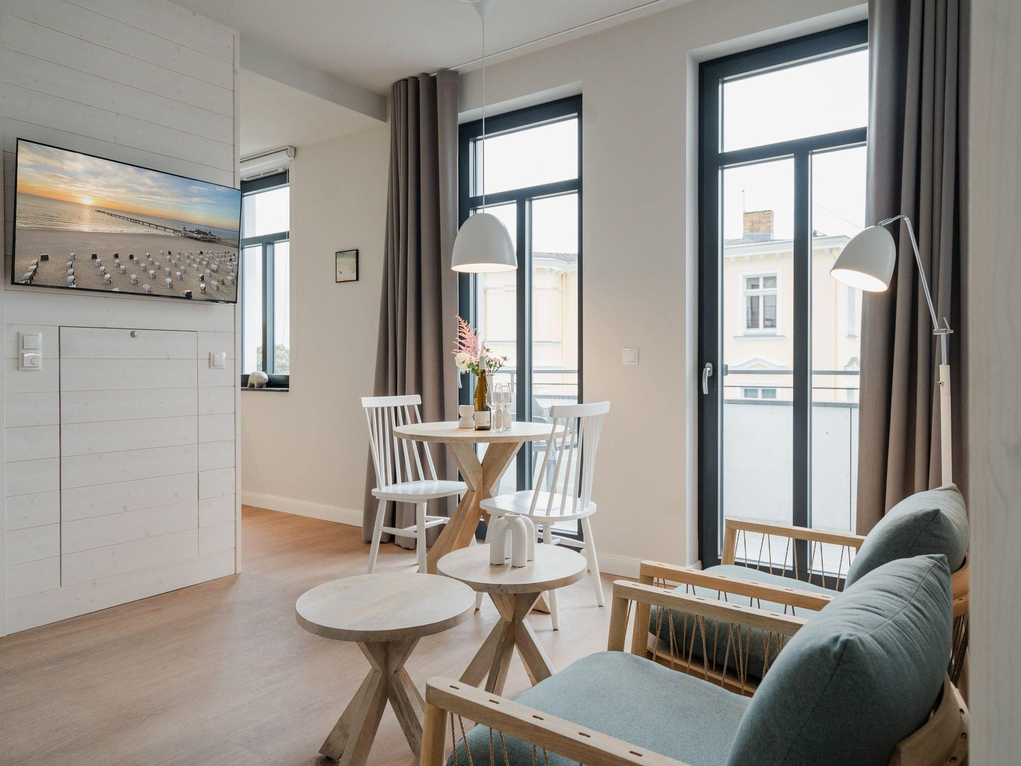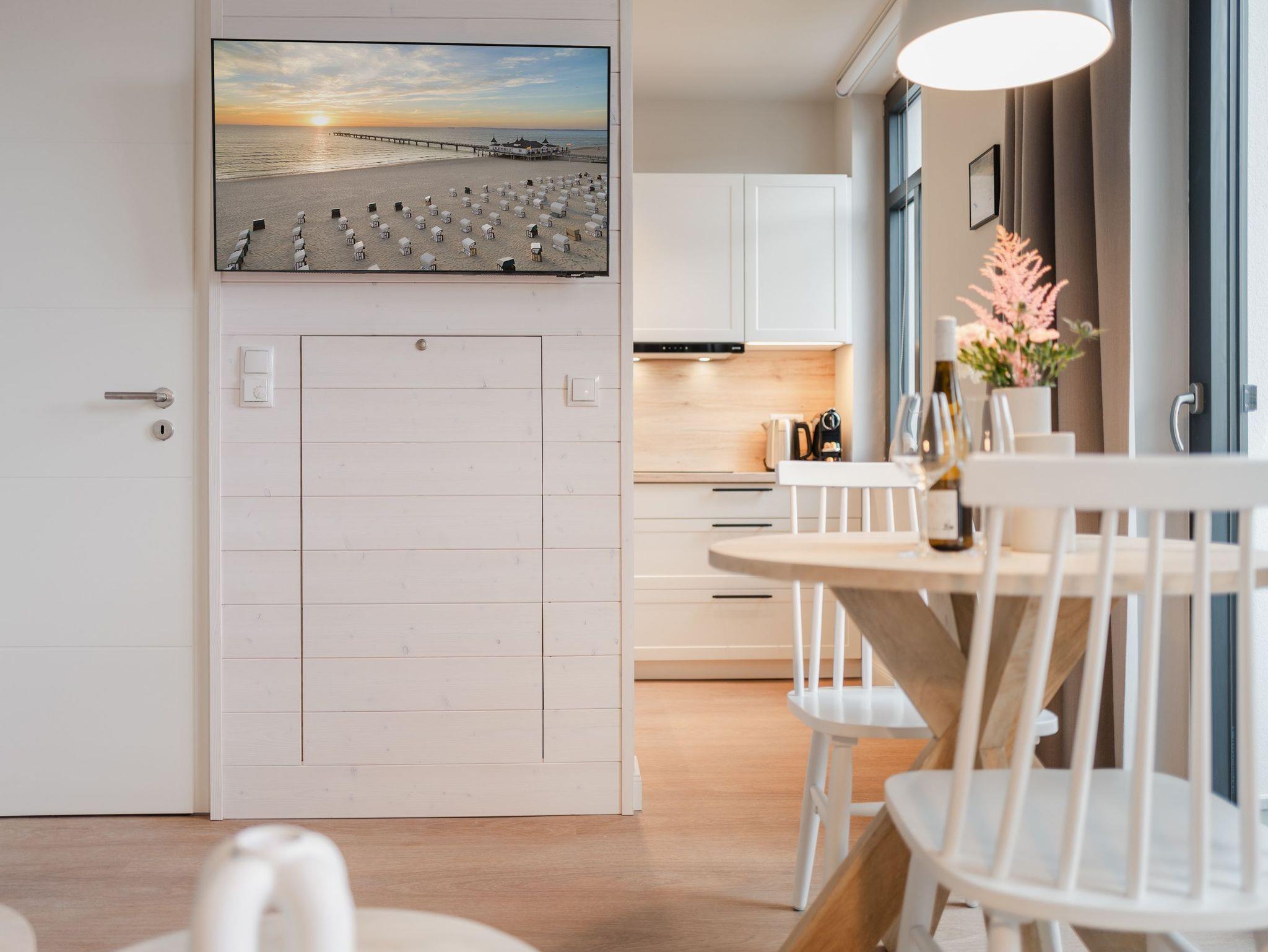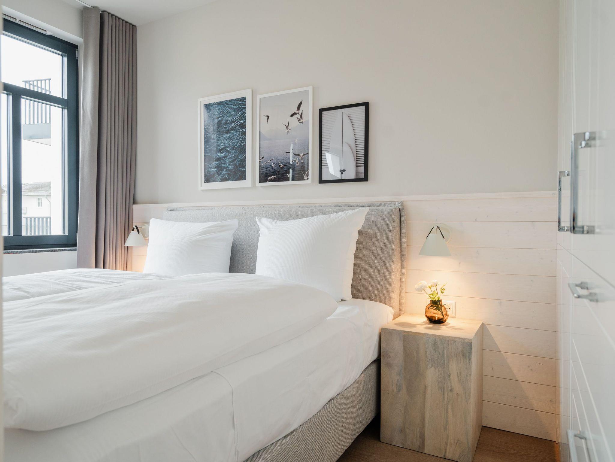 Klein, aber fein und absolut kuschelig ist das 31 Quadratmeter große 1-Raum-Appartement A 2.6 im Haus A im 2. Obergeschoss. Es ist für bis zu zwei Personen ein idealer Rückzugsort direkt am Meer. Ein Wohlfühlort, der durch seine liebevolle Einrichtung und das moderne, nordische Designkonzept aus hellen und warmen Farben besticht. In dem offenen Wohn-Essbereich, in den eine kleine, aber hochwertig und voll ausgestattete Küchennische integriert ist, besticht durch seine Behaglichkeit und den seitlichen Seeblick, den Sie vom Süd-Ost-Balkon aus genießen können. Ob vom Bett oder von den beiden Sesseln aus ? ein 43-Zoll-Flachbildfernseher sorgt für spannende Filmabende. Am schönen Esstisch oder am Tisch auf dem Balkon schmeckt das Frühstück bei Morgensonne und gesunder Seeluft gleich noch einmal so gut. Das komfortable Boxspringdoppelbett (1,80m x 2,00m) verspricht erholsame Nächte und schöne Urlaubsträume, und ein großer Kleiderschrank bietet ausreichend Stauraum für Ihre Kleidung und persönlichen Gegenstände. Für Erfrischung sorgt das innenliegende Bad mit einer Dusche, einem WC und einem Waschtisch. Zur Wohnung gehört ein PKW-Stellplatz in der Tiefgarage. Ankommen und wohlfühlen ? das wünschen wir Ihnen in diesem charmanten Feriendomizil.