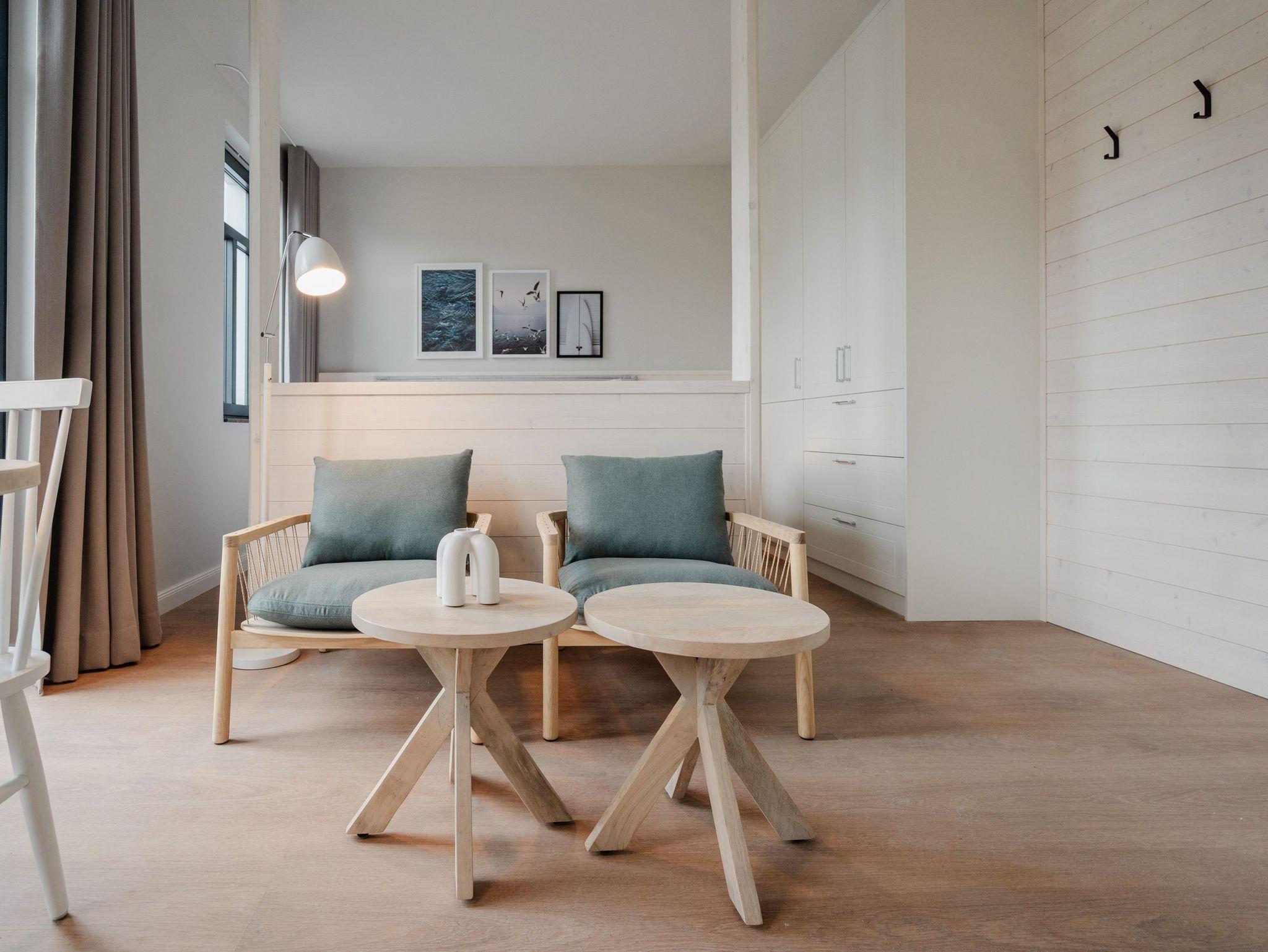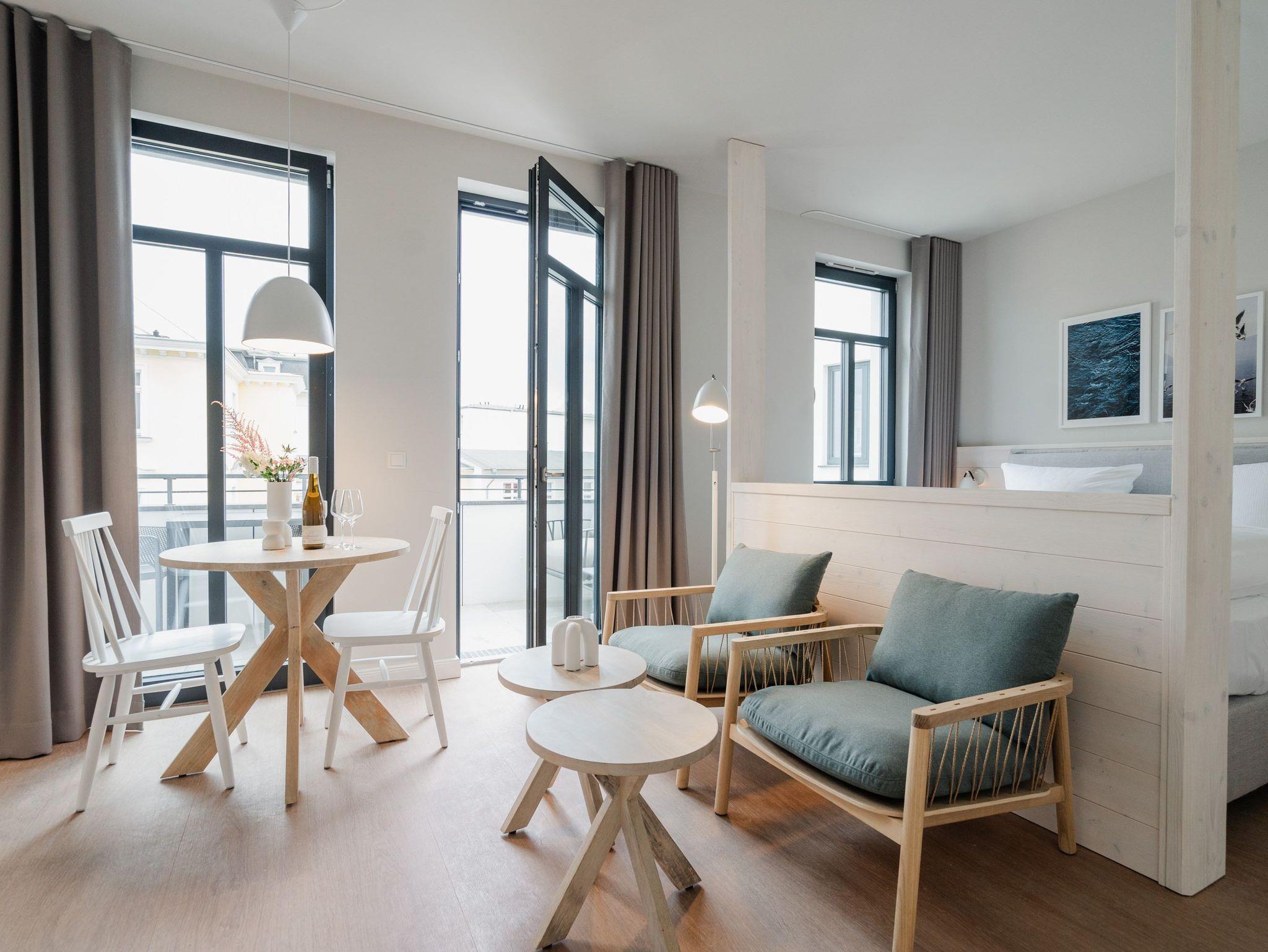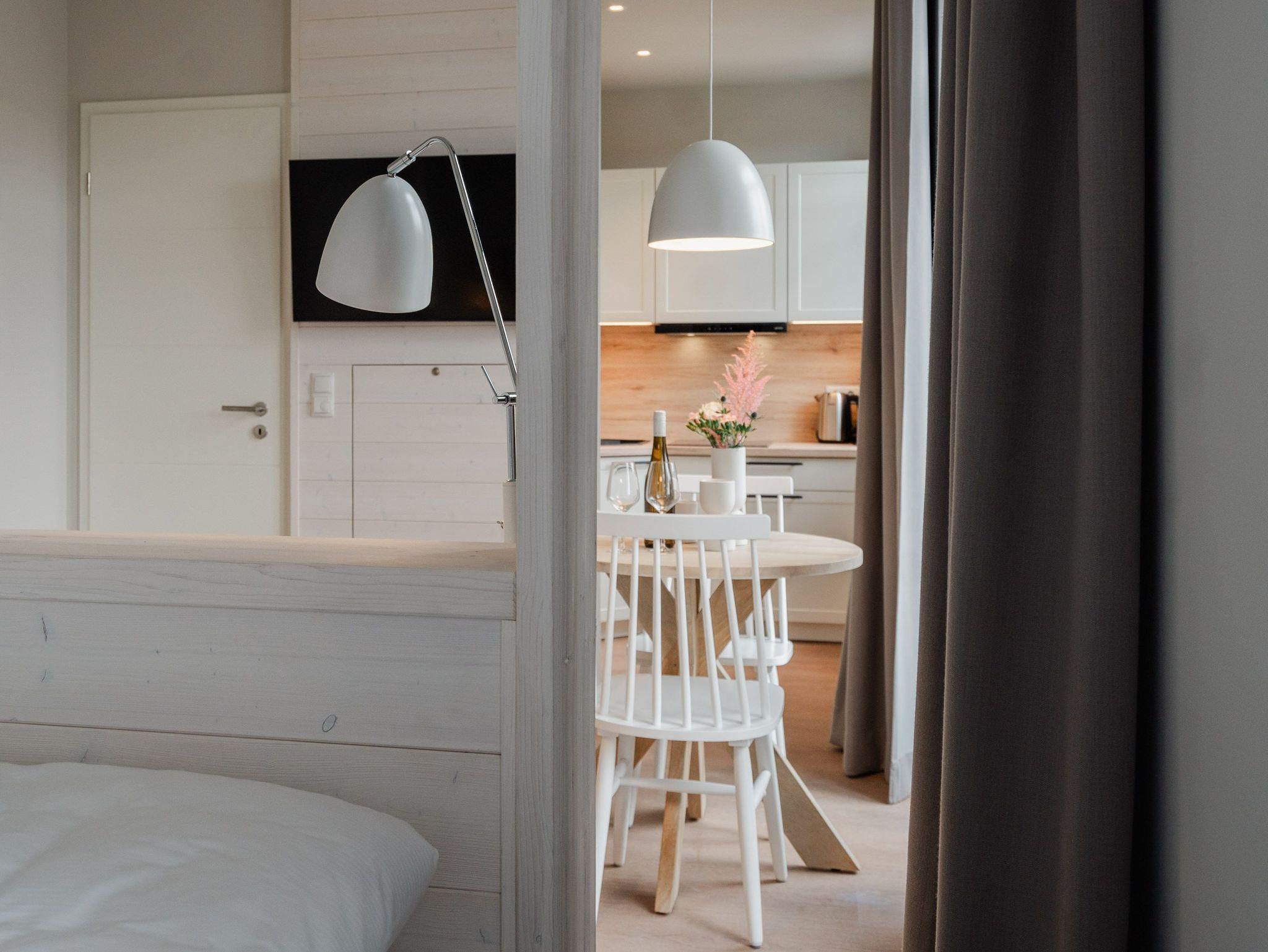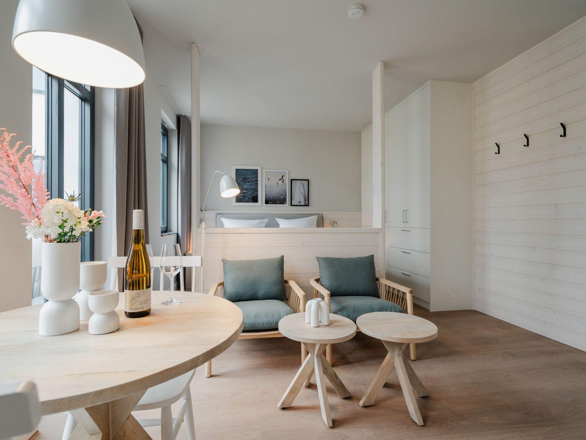Klein, aber fein und absolut kuschelig ist das 31 Quadratmeter große 1-Raum-Appartement A 2.6 im Haus A im 2. Obergeschoss. Es ist für bis zu zwei Personen ein idealer Rückzugsort direkt am Meer. Ein Wohlfühlort, der durch seine liebevolle Einrichtung und das moderne, nordische Designkonzept aus hellen und warmen Farben besticht. In dem offenen Wohn-Essbereich, in den eine kleine, aber hochwertig und voll ausgestattete Küchennische integriert ist, besticht durch seine Behaglichkeit und den seitlichen Seeblick, den Sie vom Süd-Ost-Balkon aus genießen können. Ob vom Bett oder von den beiden Sesseln aus ? ein 43-Zoll-Flachbildfernseher sorgt für spannende Filmabende. Am schönen Esstisch oder am Tisch auf dem Balkon schmeckt das Frühstück bei Morgensonne und gesunder Seeluft gleich noch einmal so gut. Das komfortable Boxspringdoppelbett (1,80m x 2,00m) verspricht erholsame Nächte und schöne Urlaubsträume, und ein großer Kleiderschrank bietet ausreichend Stauraum für Ihre Kleidung und persönlichen Gegenstände. Für Erfrischung sorgt das innenliegende Bad mit einer Dusche, einem WC und einem Waschtisch. Zur Wohnung gehört ein PKW-Stellplatz in der Tiefgarage. Ankommen und wohlfühlen ? das wünschen wir Ihnen in diesem charmanten Feriendomizil.