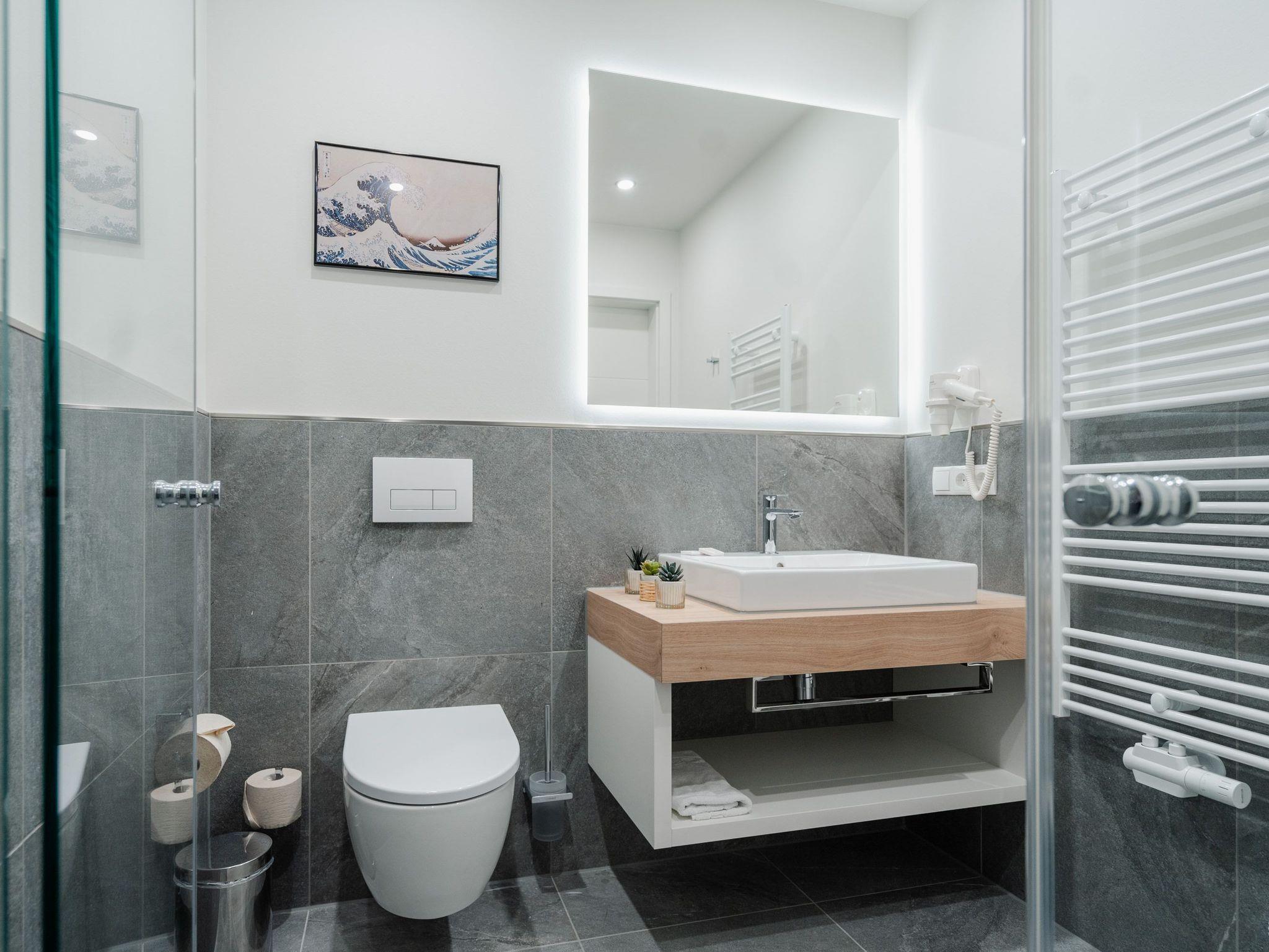 Die 2024 fertig gestellte Strandterrasse liegt direkt an der belebten Strandpromenade und bietet einen einzigartigen Ausblick auf die Grand Dame der historischen Seebrücken sowie die historische Konzertmuschel, einem beliebten Treffpunkt für Kunst und Kultur. Dahinter liegt die Ostsee ein Panorama, das zu den schönsten in den Kaiserbädern gehört. Es ist wie das Abtauchen in eine andere Zeit. In eine Zeit, in der man mit Stock, Sonnenschirm und Hut fürs Sehen und gesehen werden über die Promenade schlenderte; aber auch in eine Zeit, in der damals wie heute Zeit einmal für eine kurze Weile keine Rolle spielt. Weil man angekommen ist im Loslassen, Entspannen und Genießen. Es ist dieser besondere Geruch nach Meeresluft und Freiheit, der in Erinnerung bleibt. Dazu die Bilder, die man mitnimmt. Von langen Strandspaziergängen, vom Lachen in fröhlich schäumenden Ostseewellen, von der Zeit in einem wunderschönen Urlaubsdomizil. Denn genau das ist die Strandterrasse mit ihren 56 modernen und exklusiven Ferienappartements direkt gegenüber der Ahlbecker Seebrücke. Die Ein-, Zwei- oder Dreizimmerwohnungen zwischen 40 und 70 Quadratmeter groß sind von einer Innenarchitektin gemeinsam mit unserem Erfahrungsschatz an Gästewünschen mit viel Liebe zum Detail und ganz individuell konzipiert worden. Entspannung und Wohlfühlen stehen an erster Stelle. Alles ist aufeinander abgestimmt und sorgt für eine gemütliche Atmosphäre. Wählen Sie zwischen einem Domizil in einem hellen, sandfarbenen Designkonzept oder einem Appartement mit anthrazitfarbenen Farbakzenten. Alle Appartements verfügen gleichermaßen über eine stilvolle und komfortable Einrichtung, die passgenau angefertigt worden ist, sowie über moderne Küchen und Bäder. Jedem Schlafzimmer ist ein eigenes Bad mit Dusche zugeordnet (außer App. B4.5). Die Appartements besitzen fast alle einen Balkon viele schauen sogar zur Ostsee hinaus. Die meisten Feriendomizile haben einen Elektrokamin und Infrarotsaunen. Im Erdgeschoss befindet sich ein separater Gemeinschaftsraum für Fahrräder. Außerdem besteht die Möglichkeit, im Gemeinschaftswaschraum 2 Waschmaschinen [&] Trockner zu nutzen. Ergänzt wird das Angebot durch eine Gemeinschaftssauna, die täglich von 11:00 bis 22:00 Uhr nutzbar ist. In der Tiefgarage (Einfahrtshöhe 2,03 Meter) steht für jede Wohnung 1 Pkw-Stellplatz zur Verfügung. Ist alles zur Zufriedenheit untergebracht? Dann kann der Urlaub ja beginnen. Und beim Blick vom Balkon über die Ostsee treffen sich zum Sonnenaufgang das Heute und das Damals. Gelassenheit legt sich beim Gang hinunter an den Strand auf die Seele. Jetzt darf die Zeit stehenbleiben.