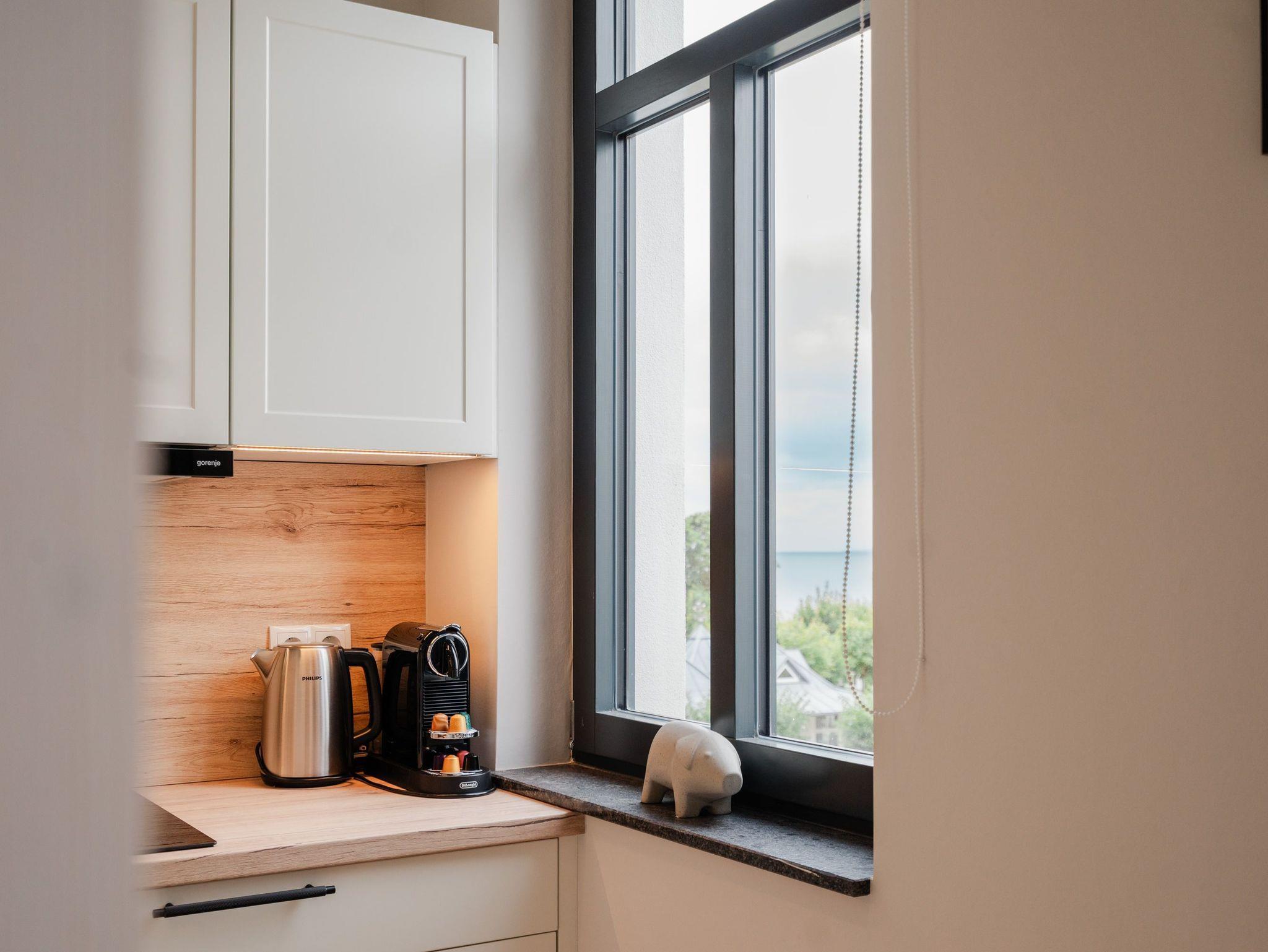 Klein, aber fein und absolut kuschelig ist das 31 Quadratmeter große 1-Raum-Appartement A 2.6 im Haus A im 2. Obergeschoss. Es ist für bis zu zwei Personen ein idealer Rückzugsort direkt am Meer. Ein Wohlfühlort, der durch seine liebevolle Einrichtung und das moderne, nordische Designkonzept aus hellen und warmen Farben besticht. In dem offenen Wohn-Essbereich, in den eine kleine, aber hochwertig und voll ausgestattete Küchennische integriert ist, besticht durch seine Behaglichkeit und den seitlichen Seeblick, den Sie vom Süd-Ost-Balkon aus genießen können. Ob vom Bett oder von den beiden Sesseln aus ein 43-Zoll-Flachbildfernseher sorgt für spannende Filmabende. Am schönen Esstisch oder am Tisch auf dem Balkon schmeckt das Frühstück bei Morgensonne und gesunder Seeluft gleich noch einmal so gut. Das komfortable Boxspringdoppelbett (1,80m x 2,00m) verspricht erholsame Nächte und schöne Urlaubsträume, und ein großer Kleiderschrank bietet ausreichend Stauraum für Ihre Kleidung und persönlichen Gegenstände. Für Erfrischung sorgt das innenliegende Bad mit einer Dusche, einem WC und einem Waschtisch. Zur Wohnung gehört ein PKW-Stellplatz in der Tiefgarage. Ankommen und wohlfühlen das wünschen wir Ihnen in diesem charmanten Feriendomizil.