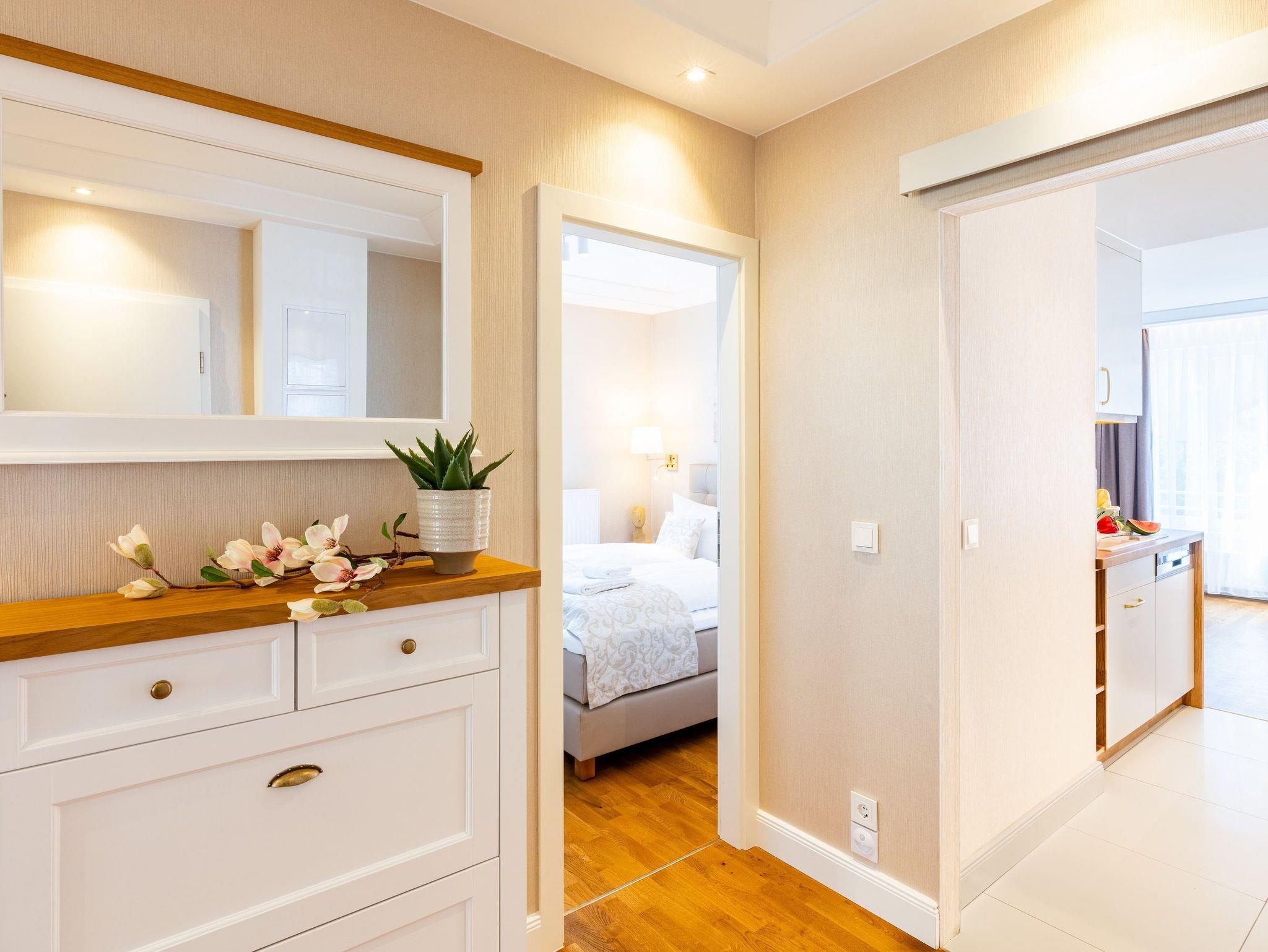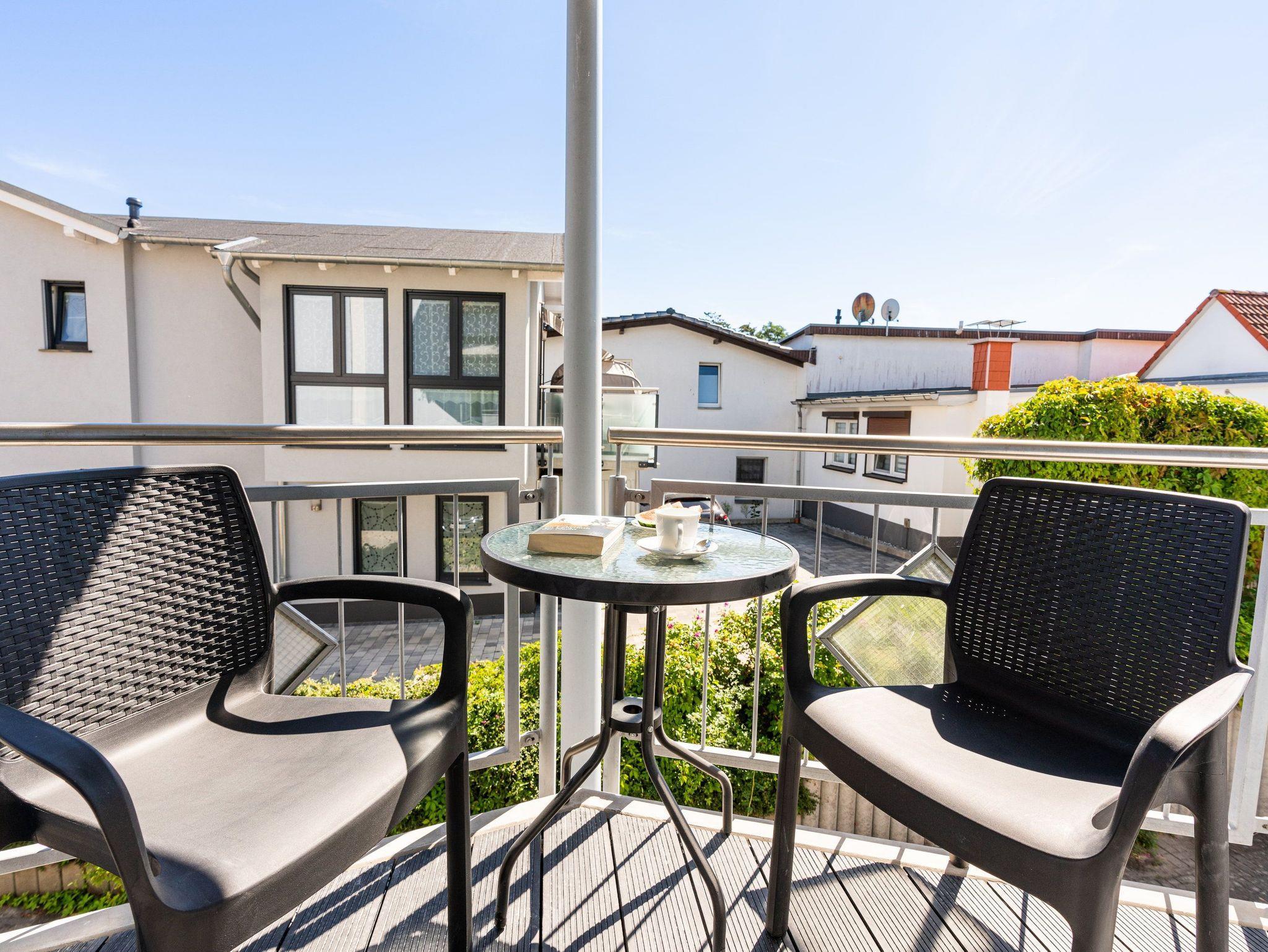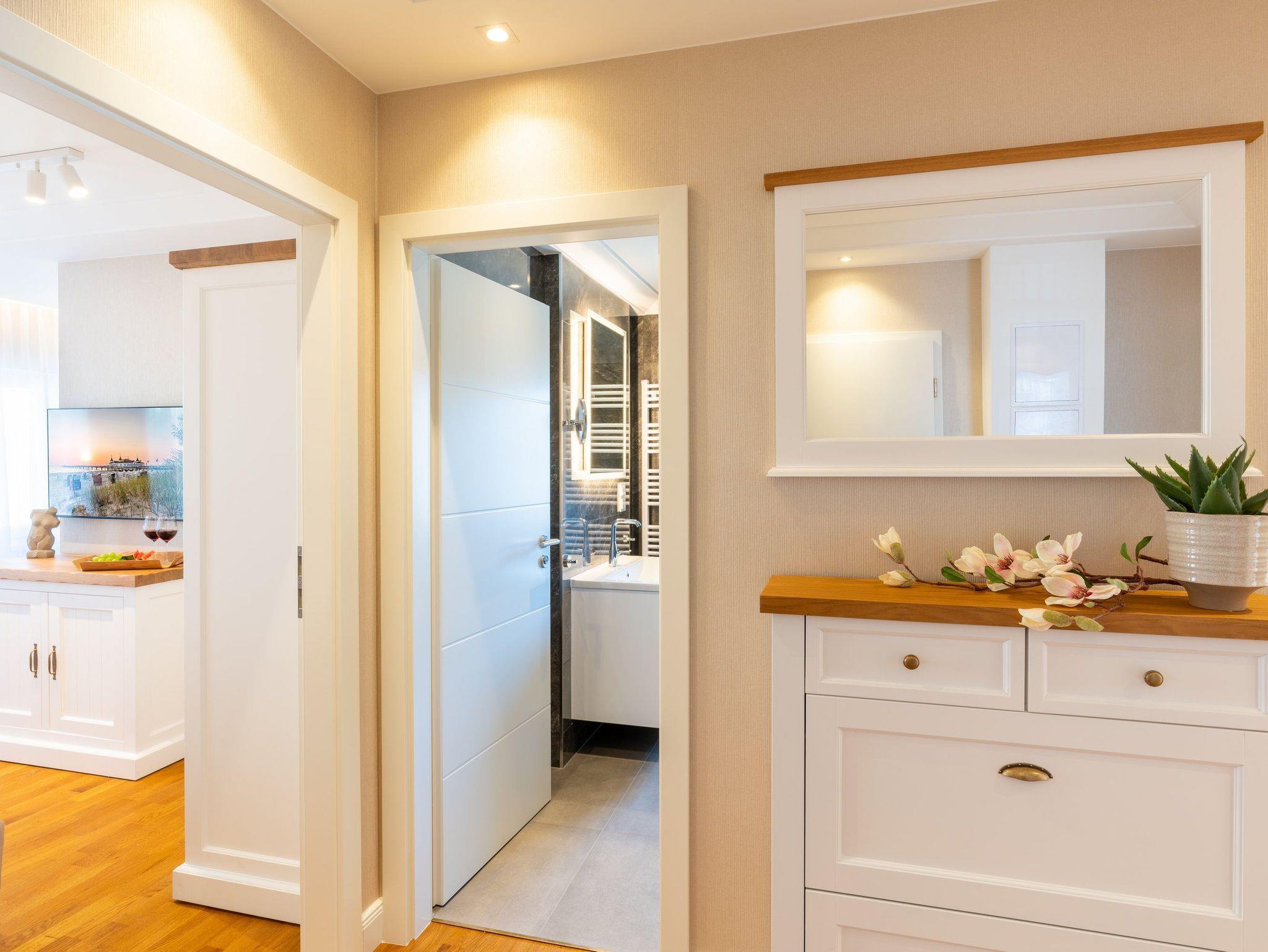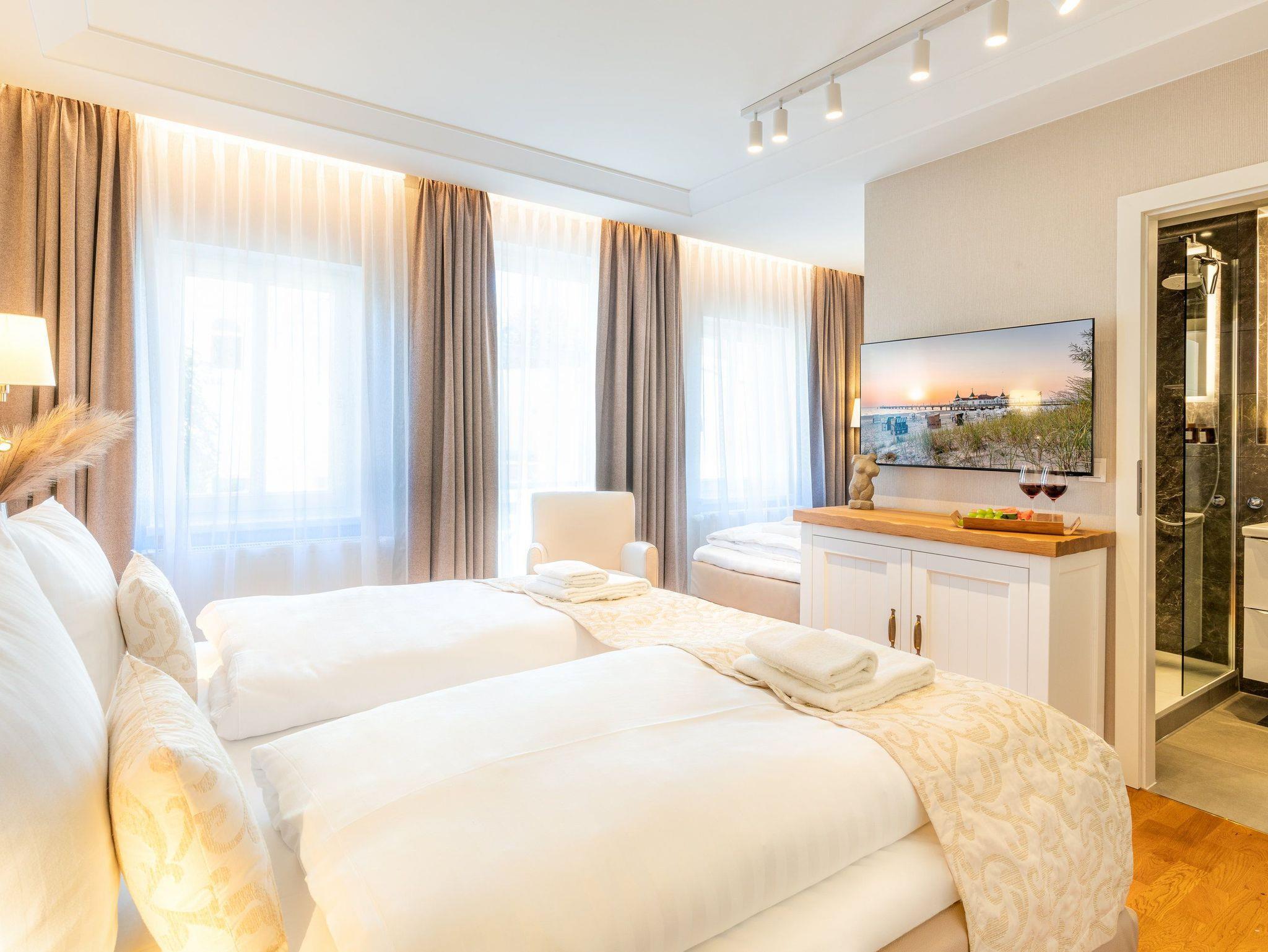 Das zweite Schlafzimmer verfügt ebenfalls über ein Boxspringbett (160 x 200cm / zwei getrennte Matratzen), TV und Staumöglichkeiten. Highlight hier ist der angrenzende Balkon. Genießen Sie von diesem die ersten Sonnenstrahlen des Tages bei einer guten Tasse Kaffee. Ein zweites Badezimmer mit bodengleicher Dusche und WC rundet den Urlaubskomfort für dieses Appartement hervorragend ab. Damit Sie Ihre wohlverdiente Urlaubszeit bereits am Anreisetag in vollen Zügen genießen können, haben wir das Bett für Sie und das für Ihre lieben Mitreisenden bereits bezogen und ein Duschtuch sowie ein kleines Handtuch bereitgelegt.