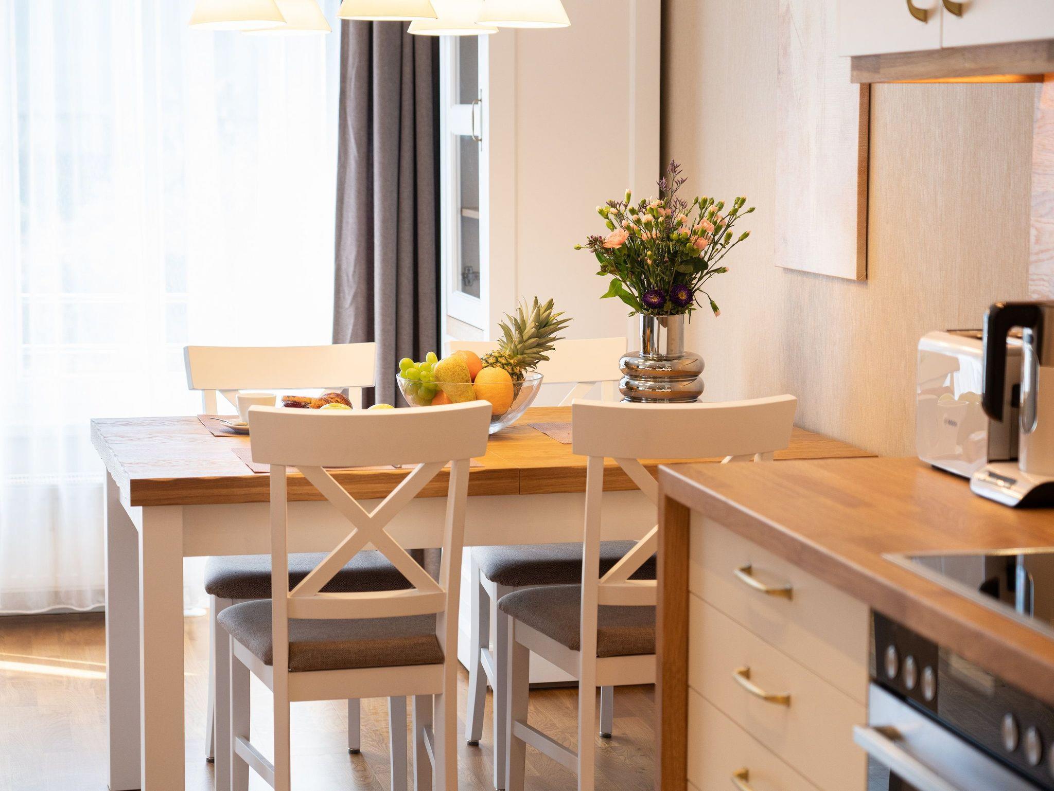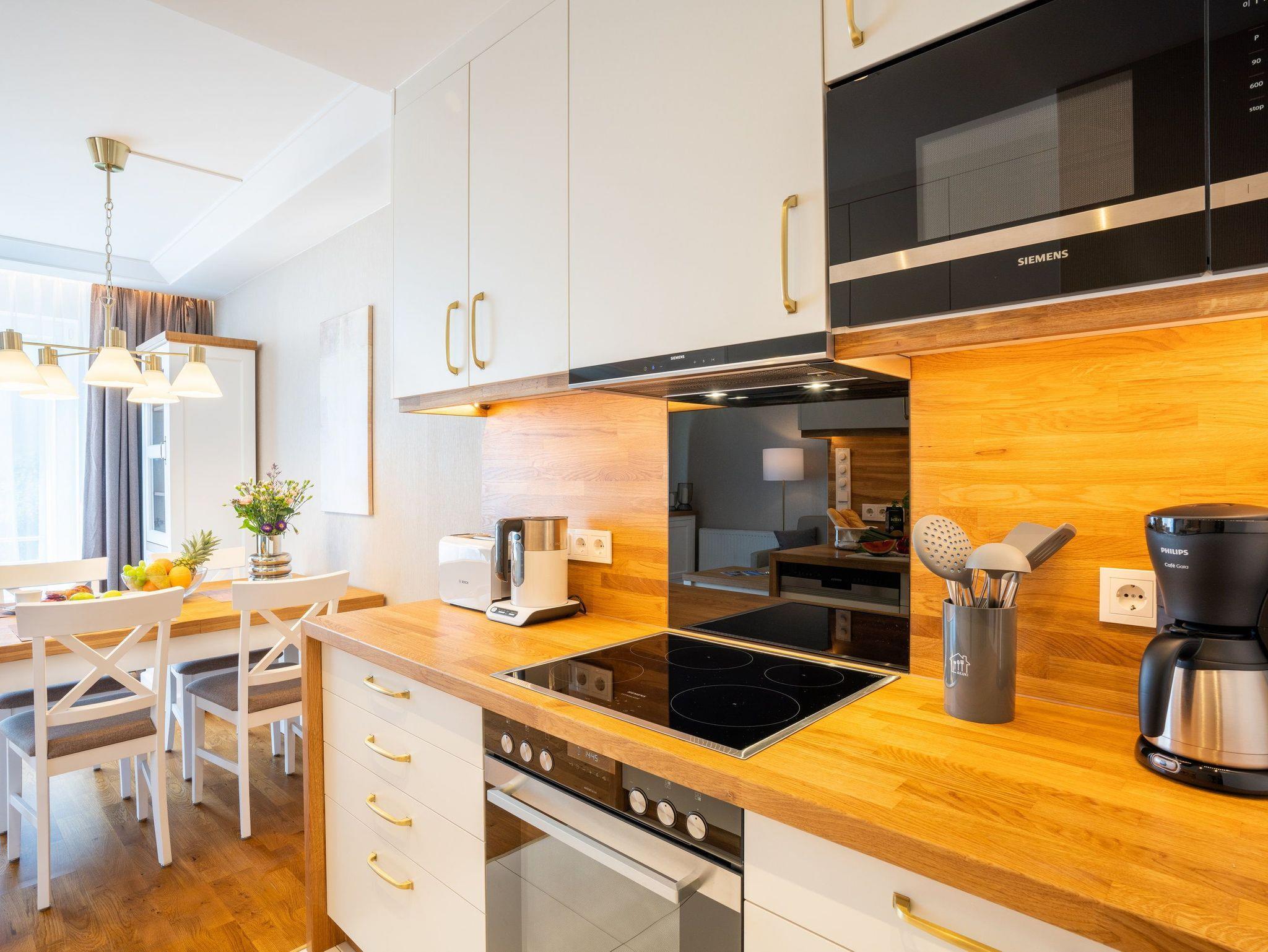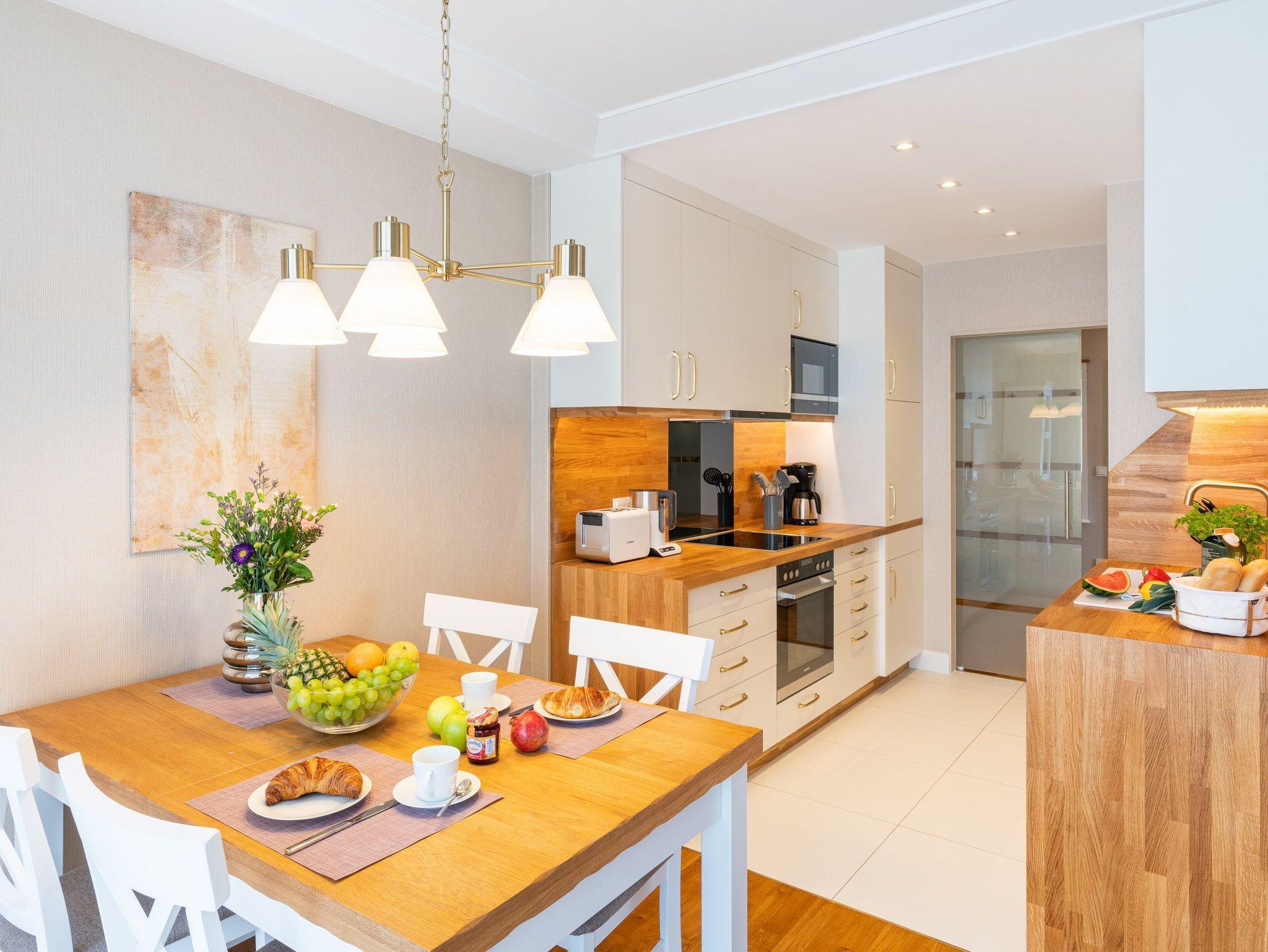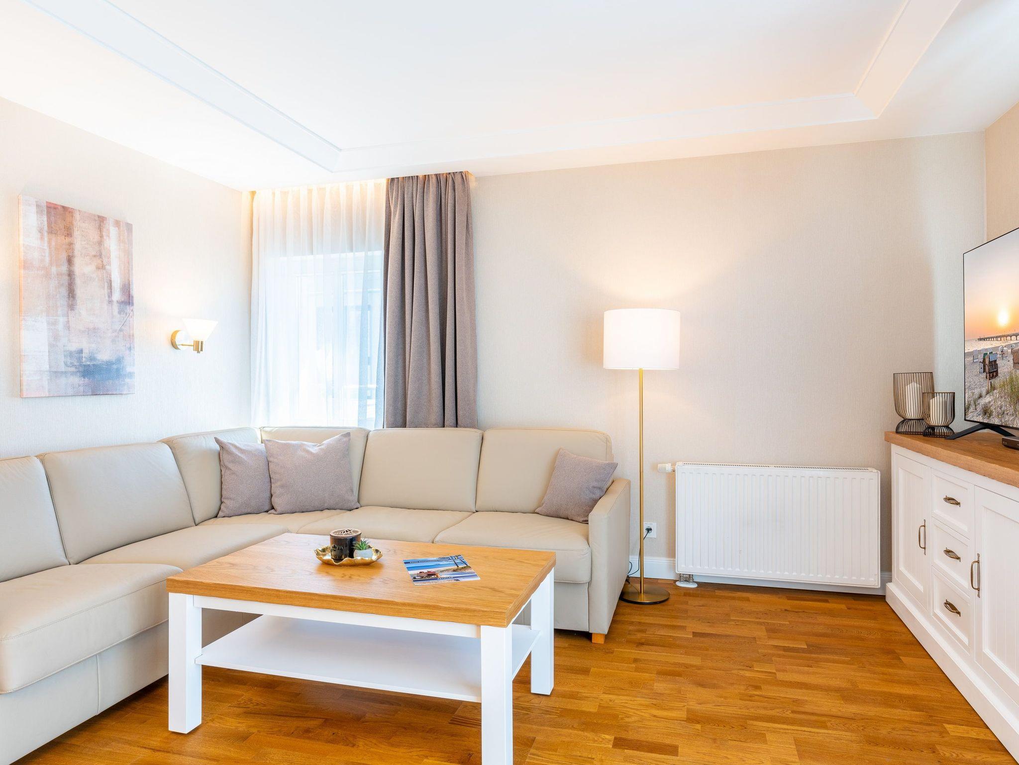 Gemütlichkeit Pur im Urlaub! Das großzügig geschnittene 3-Zimmer-Appartement liegt im Hochparterre in einer sehr ruhigen Seitenstraße Ahlbecks. Mit seinen 70 Quadratmetern Wohnfläche bietet dieses viel Platz für einen erholsamen Urlaub mit bis zu fünf Personen. Bei der Einrichtung des Appartements wurde nichts dem Zufall überlassen: Mobiliar, Dekoration und farbliche Gestaltung sind perfekt aufeinander abgestimmt. Das Ambiente lädt einfach zu erholsamen Urlaubstagen auf Usedom ein! Der Wohnbereich ist mit einer großen Sitzlandschaft aus Echtleder und TV ausgestattet. Die Küche ist von einem einheimischen Tischler gefertigt worden und bietet jeglichen Komfort (Ceranfeld, Backofen, Kühlschrank mit Gefrierfach, Geschirrspüler, Mikrowelle, Wasserkocher, Toaster, Kaffeemaschine), den Sie für die Zubereitung Ihrer Lieblingsspeisen benötigen. Für die Nachtruhe steht ein komfortables Boxspringbett (180 x 200cm / zwei getrennte Matratzen), ein Einzelbett (80x200) sowie Kleiderschränke mit genug Stauraum für Sie bereit. Lassen Sie hier den Tag ausklingen oder genießen Ihre Lieblingsserie vor dem TV. Das Bad en Suite ist mit bodengleicher Dusche und WC ausgestattet.