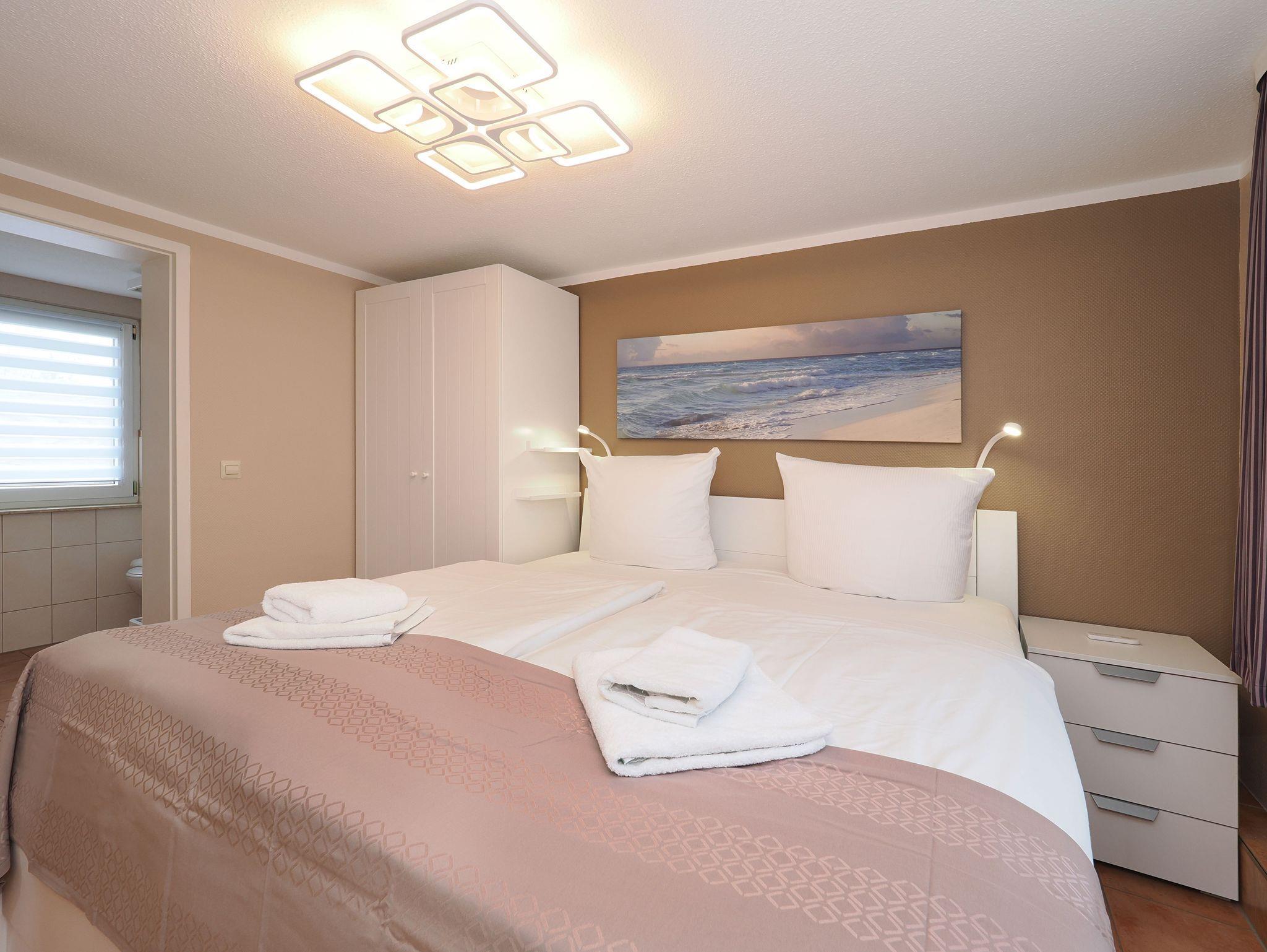 Im Schlafzimmer finden Sie ein großes gemütliches Doppelbett, in dem Sie nach einem langen Tag am Strand Erholung finden und zur Ruhe kommen können. Ein großer Kleiderschrank für Ihre persönlichen Sachen, steht Ihnen ebenfalls zur Verfügung.