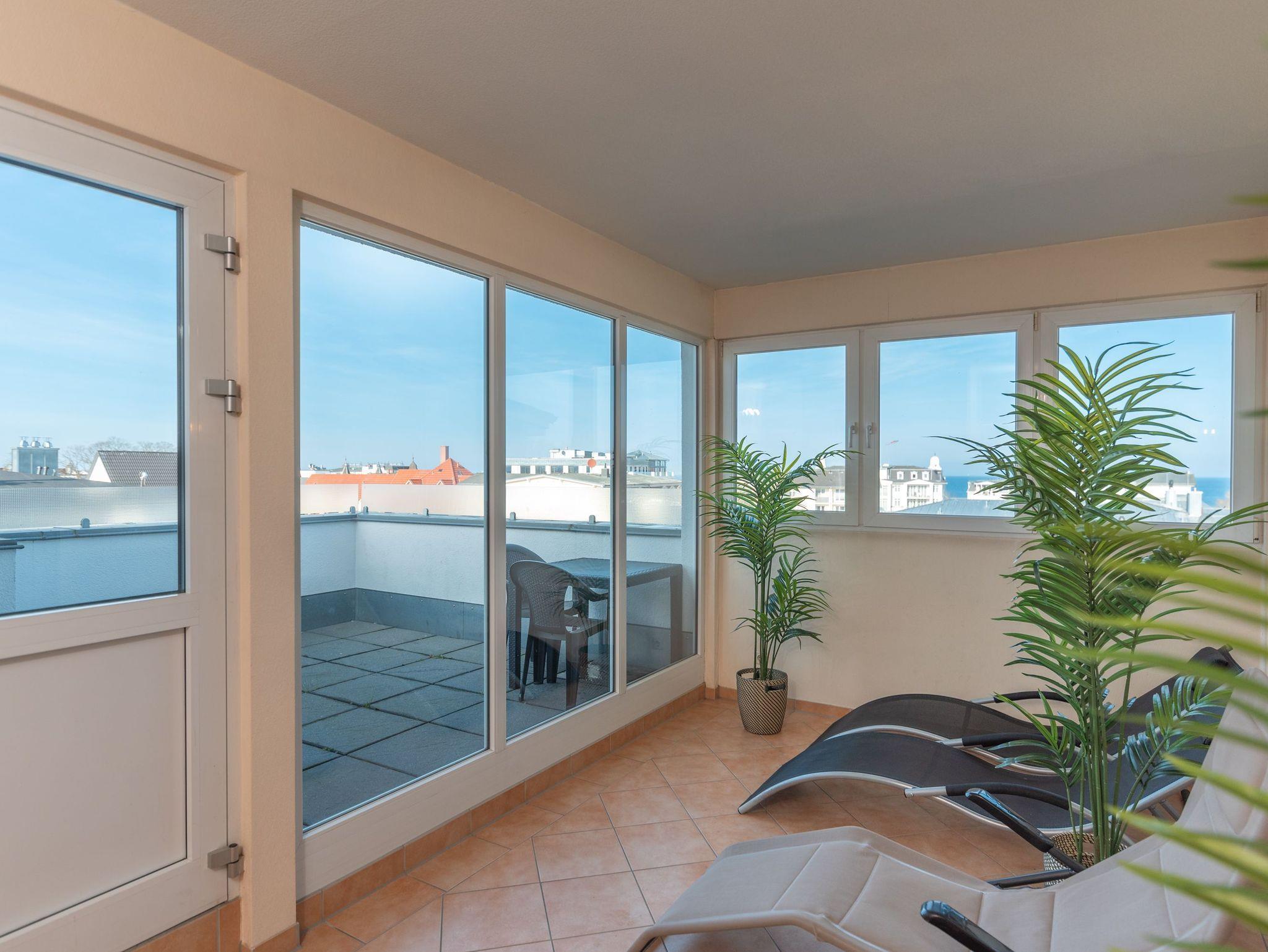 Alle Gäste des Hauses haben Zugang zur Gemeinschaftssauna und der Dachterrasse im Dachgeschoss, die einen atemberaubenden Blick über Ahlbeck und die Ostsee bietet. Für Komfort sorgen die im Haus gegen Gebühr nutzbare Waschmaschine und der Trockner. Zudem kann ein persönlicher Strandkorb am Meer dazugebucht werden, um die Urlaubstage am Strand noch genussvoller zu gestalten.