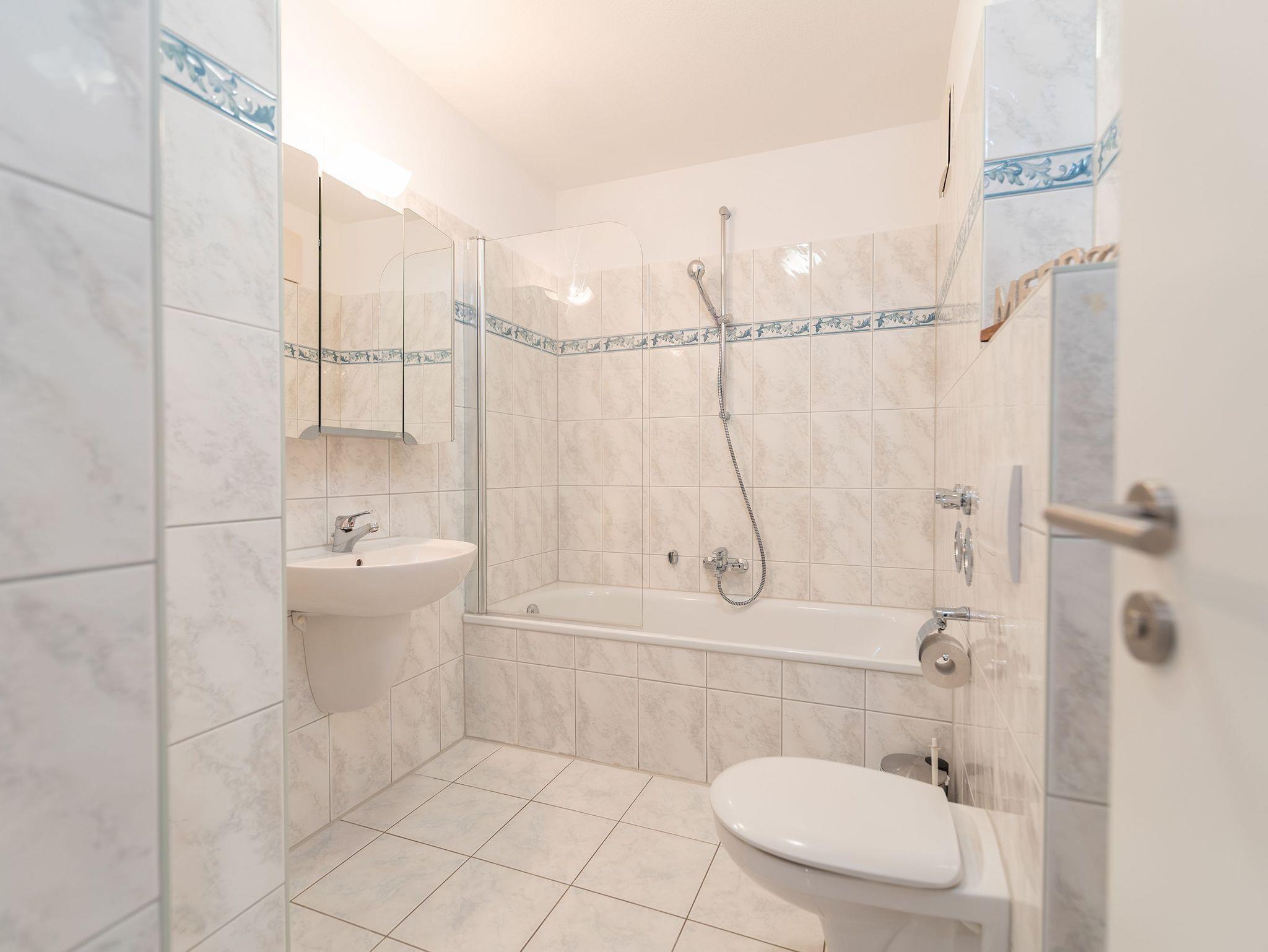 Im Erdgeschoss gelegen, umfasst die Wohnung ein Wohnzimmer mit einer bequemen Schlafcouch, einen Essbereich, eine voll ausgestattete Küchenzeile, ein Schlafzimmer mit einem hochwertigen Boxspringbett und Zugang zu einer kleinen Terrasse sowie ein Badezimmer mit Badewanne. Zu den Annehmlichkeiten gehören kostenfreies WLAN und ein kostenfreier Parkplatz in der abgeschlossenen Tiefgarage, wo auch Fahrräder sicher abgestellt werden können.