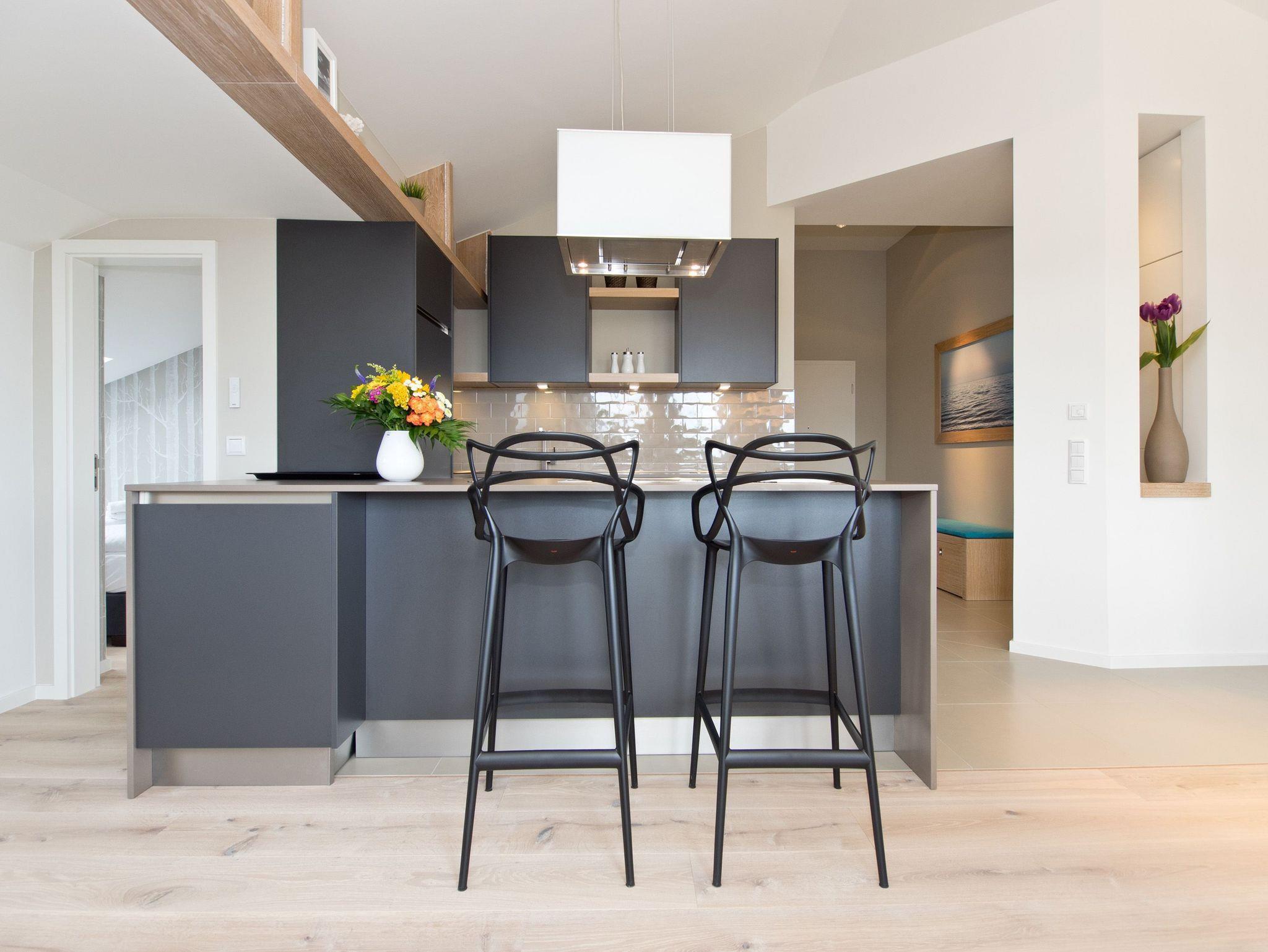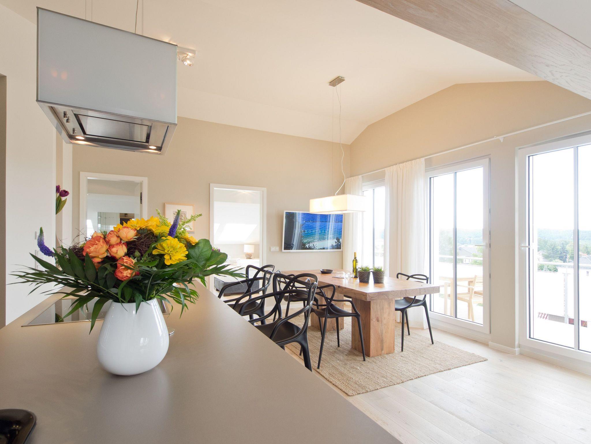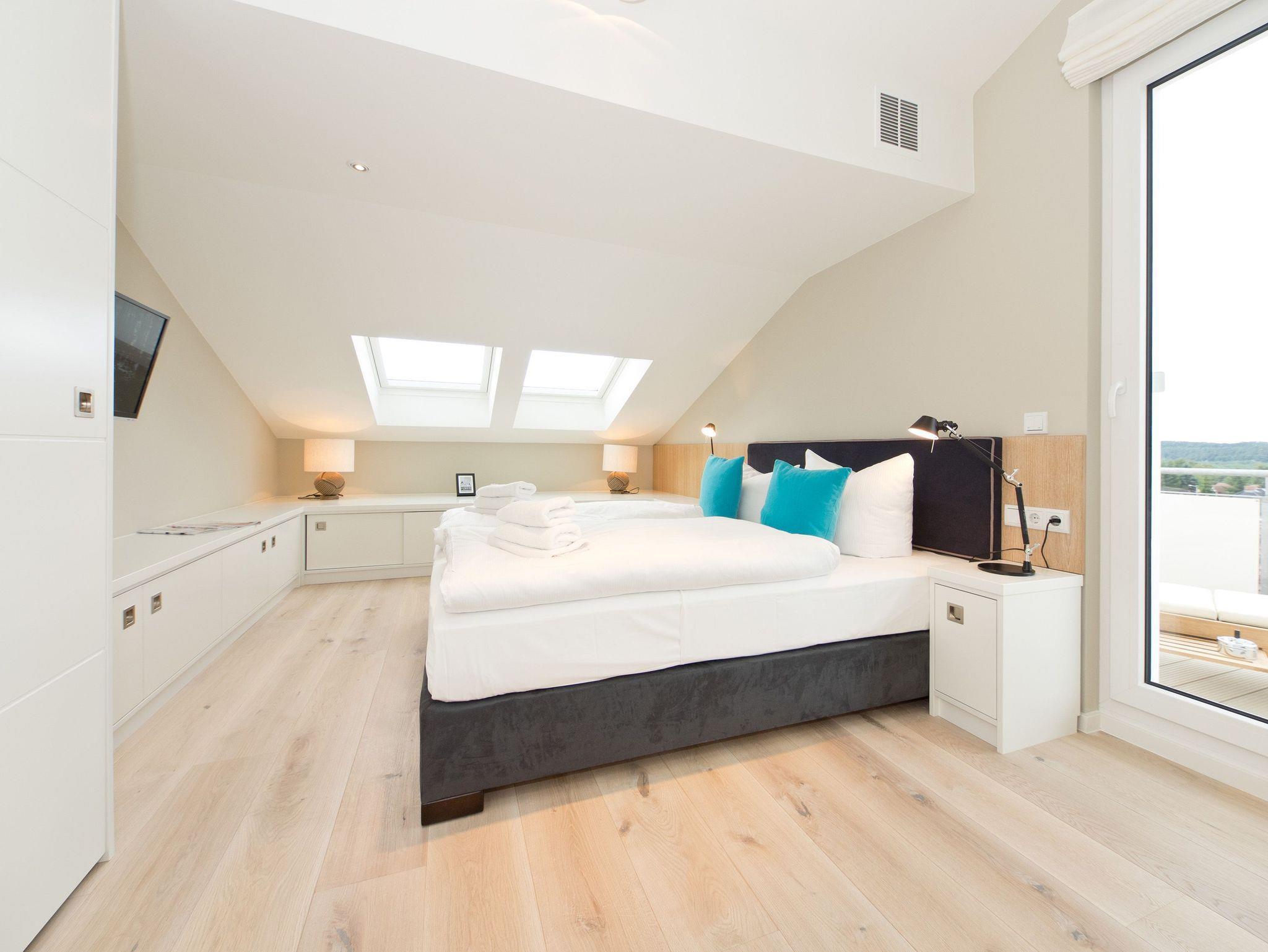 Eine Ferienwohnung zum Verlieben! Direkt unterm Dach des Südhauses im Dünenpalais empfängt Sie unser neues 2,5 Raum-Appartement (75 qm) für 2 Personen und ein Kind bis 14 Jahre. Wunderschönes Innenarchitekten-Design, stimmige Farben und Stoffe und hochwertige Einbauten, die jeden Raum perfektionieren, machen dieses Appartement so besonders. Die offen gestaltete Küche mit Tresen schließt sich an den Wohnbereich mit gemütlicher Sitzgruppe, Flat-TV und Design-Gaskamin (per Fernbedienung zu nutzen) an. Ergänzt wird dies durch den schönen Essplatz an der großzügigen Fensterfront. Von hier hat man Zugang zum sonnigen Südbalkon, der mit Gartenmöbeln und einem XL-Strandkorb ausgestattet ist und einen schönen Blick auf das Seebadhinterland bietet. Das Schlafzimmer mit Doppelboxspringbett (1,80m x 2,10m) und tollen Einbauten verspricht ruhige Stunden (hier kann auch ein Kinderbett aufgestellt werden). Ein kleines, schnuckliges Extrazimmer mit einem Einzelbett (0,80m x 2,00m) kann als Schlafgelegenheit für ein Kind genutzt werden. Für Ihren Komfort sind die Betten bei der Anreise bezogen und Handtücher liegen bereit. Ein Pkw-Stellplatz (whg.25) steht in der Tiefgarage zur Verfügung. Auf Wunsch stellen wir ein Kinderreisebett (ohne Matratze [&] Bettzeug) und einen Kinderhochstuhl gegen einen Aufpreis zur Verfügung. Das WLAN-Netz kann kostenfrei genutzt werden.