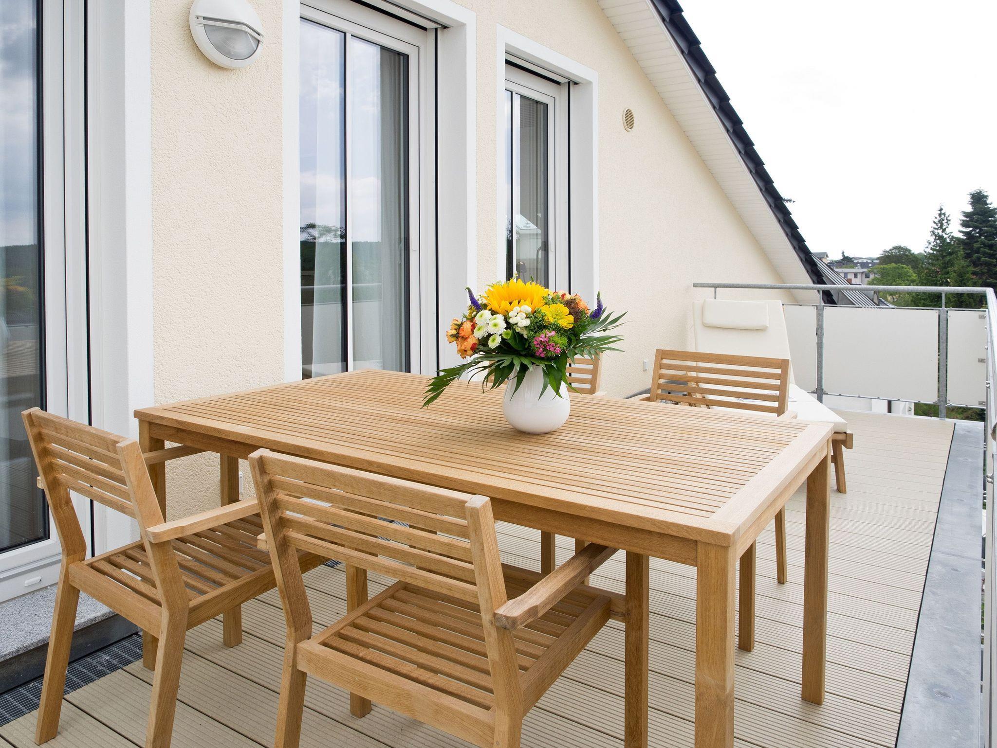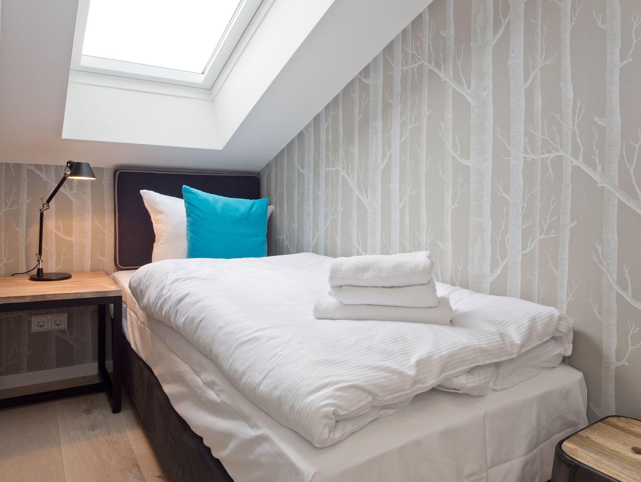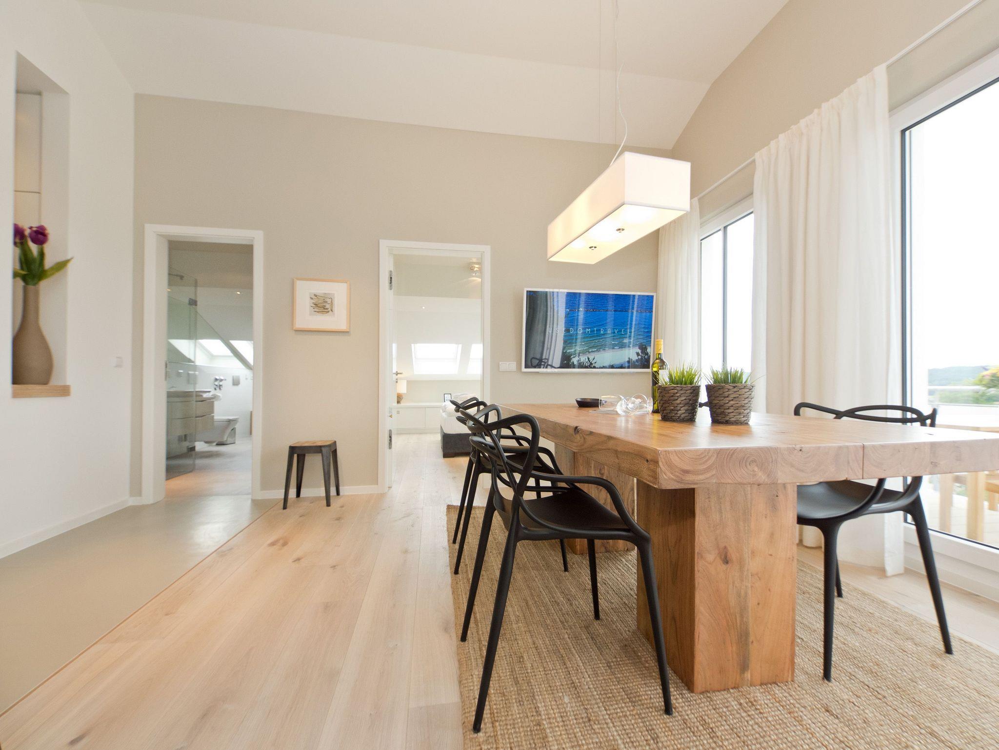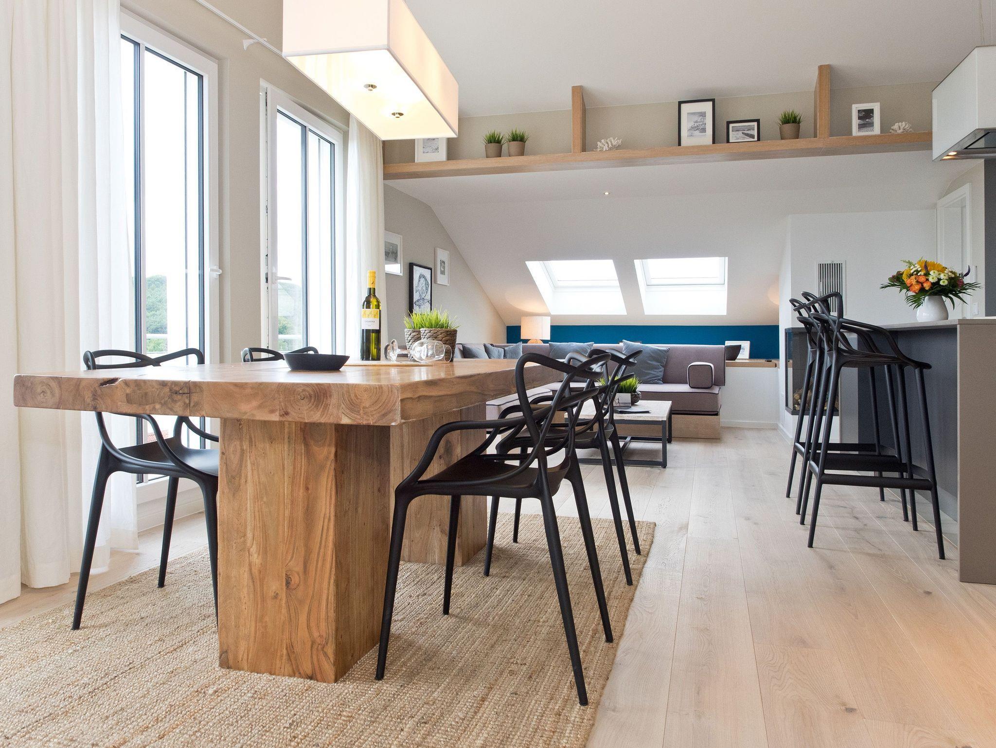 Eine Ferienwohnung zum Verlieben! Direkt unterm Dach des Südhauses im Dünenpalais empfängt Sie unser neues 2,5 Raum-Appartement (75 qm) für 2 Personen und ein Kind bis 14 Jahre. Wunderschönes Innenarchitekten-Design, stimmige Farben und Stoffe und hochwertige Einbauten, die jeden Raum perfektionieren, machen dieses Appartement so besonders. Die offen gestaltete Küche mit Tresen schließt sich an den Wohnbereich mit gemütlicher Sitzgruppe, Flat-TV und Design-Gaskamin (per Fernbedienung zu nutzen) an. Ergänzt wird dies durch den schönen Essplatz an der großzügigen Fensterfront. Von hier hat man Zugang zum sonnigen Südbalkon, der mit Gartenmöbeln und einem XL-Strandkorb ausgestattet ist und einen schönen Blick auf das Seebadhinterland bietet. Das Schlafzimmer mit Doppelboxspringbett (1,80m x 2,10m) und tollen Einbauten verspricht ruhige Stunden (hier kann auch ein Kinderbett aufgestellt werden). Ein kleines, schnuckliges Extrazimmer mit einem Einzelbett (0,80m x 2,00m) kann als Schlafgelegenheit für ein Kind genutzt werden. Für Ihren Komfort sind die Betten bei der Anreise bezogen und Handtücher liegen bereit. Ein Pkw-Stellplatz (whg.25) steht in der Tiefgarage zur Verfügung. Auf Wunsch stellen wir ein Kinderreisebett (ohne Matratze [&] Bettzeug) und einen Kinderhochstuhl gegen einen Aufpreis zur Verfügung. Das WLAN-Netz kann kostenfrei genutzt werden.