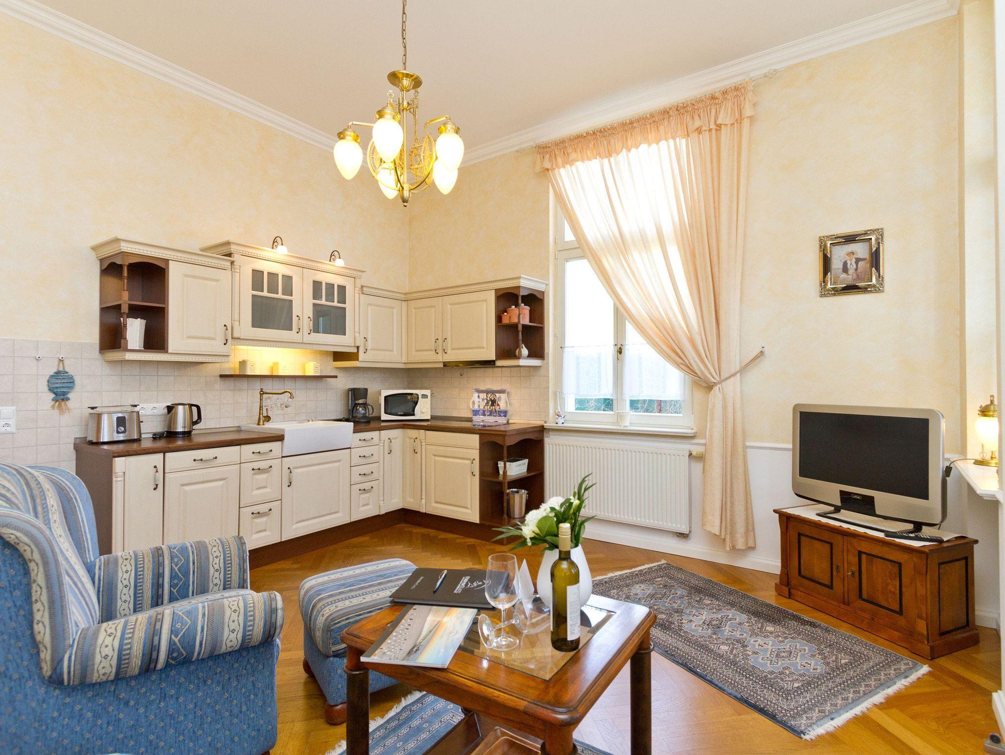 Sie suchen Flair und den Charme alter Zeiten - dann bietet Ihnen diese Ferienwohnung ein besonderes Wohnerlebnis. Aufwendig rekonstruierte Stuckelemente, Marmoranmutende Wandveredelungen und die harmonierenden Stoffe und Farben werden Sie begeistern. Ein Wohnzimmer mit Küchenzeile, die historische Veranda mit Essbereich, ein Schlafzimmer mit Doppelbett (zusätzlichen zweiten Fernseher) und ein zur Seeseite gelegener Balkon bieten Platz für 2 Erwachsene und ein Kleinkind (bis 3 Jahre) im Kinderreisebett.[nbsp] Für Ihren Komfort sind die Betten bei der Anreise bezogen und Handtücher liegen bereit. Auf Wunsch stellen wir für unsere kleinen Gäste ein Kinderreisebett und einen Kinderhochstuhl ( kostenfrei) zur Verfügung. Der Stellplatz für ihren PKW befindet sich auf dem Grundstück außerhalb des Carports. Ein offener (ohne Überdachung), abschließbarer Stellplatz für Fahrräder ist am Carport vorhanden. Für den Tag am Meer steht Ihnen als besonderes Bonbon von Mitte Mai bis Oktober (je nach Witterung) ausschließlich in der Saison 2024 ein Strandkorb am Strand (in nächste Nähe) kostenlos zur Verfügung.