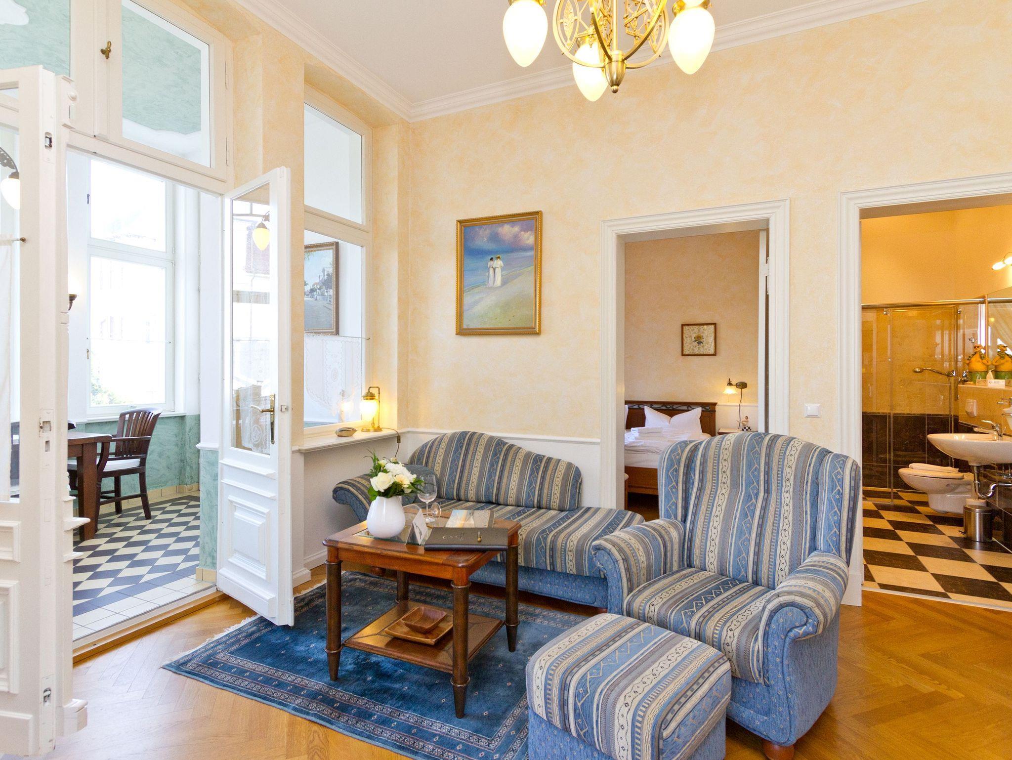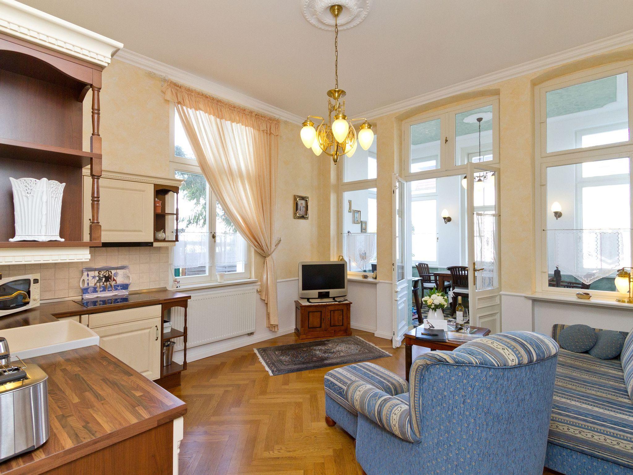 Mit diesem Domizil entscheiden Sie sich für eine exklusive Möglichkeit, Ihren Urlaub in den Kaiserbädern zu verbringen. Die 1898, im wilhelminischen Baustil errichtete Villa, präsentiert Ihnen seit Januar 2005 hochherrschaftliches Wohnen in ruhiger Lage. Großzügige Räumlichkeiten, historische Veranden und Balkone sorgen für rundherum gelungene Urlaubstage. Der große Saunabereich (kostenfrei) im Untergeschoss der Villa bietet Ihnen an kälteren Tagen eine angenehme Abwechslung. Für jede Wohnung steht ein PKW-Stellplatz am Haus zur Verfügung (größtenteils überdacht), für Fahrräder gibt es teilweise separate Abstellräume (abschließbar). Waschmaschine und Trockner (im Untergeschoss) im Haus sind gegen eine Gebühr nutzbar. Das WLAN-Netz steht kostenfrei zur Verfügung.