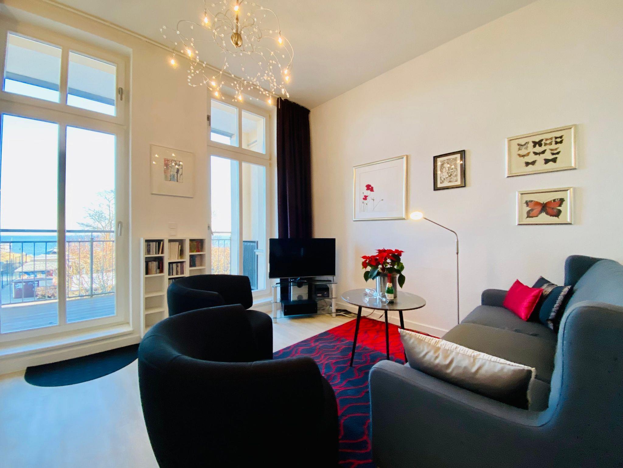Das moderne Appartement 7 befindet sich im ersten Obergeschoss der Villa Anna und über eine Treppezu erreichen. Die 2 Raumwohnung begeistert seine Gäste durch den tollen Seeblick aus dem Wohnbereich und vom überdachten Balkon. Alle Räume sind hell, freundlich und mit Liebe zum Detail eingerichtet: Im Wohnzimmer sind die komplette Küchenzeile und der Esstisch integriert. Erholen Sie sich in der gemütlichen Sitzecke oder genießen Sie das Leben im Freien auf dem Balkon. Selbst vom Boxspringbett in Komforthöhe und aus der Badewanne können Sie aufs Meer schauen. Zu Appartement 7 gehört ein Platz in der Doppelparkgarage für PKW bis 1,50m Höhe, 5m Länge,(kein Kombi)
