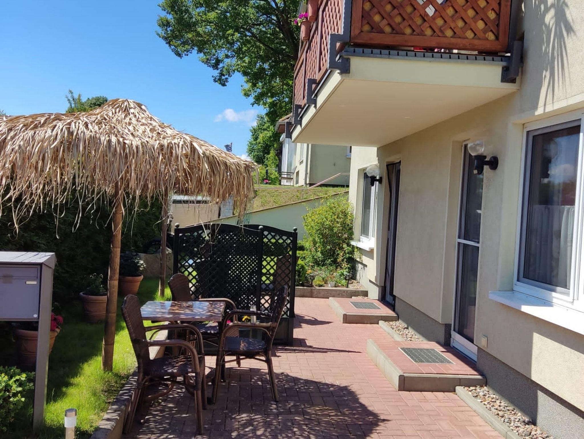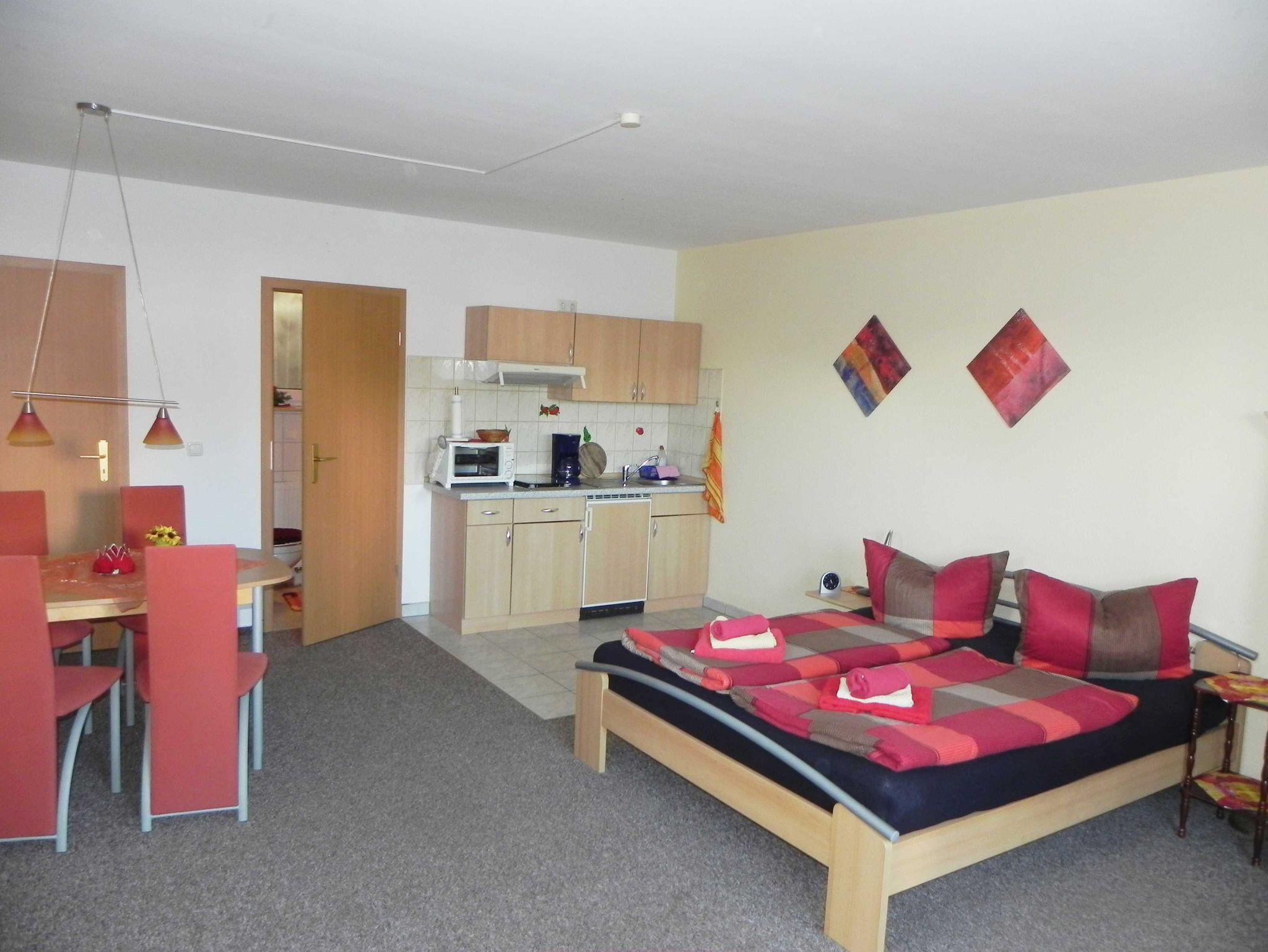 Die kleine und feine 1-Raum-Ferienwohnung im Erdgeschoss bietet mit seinen 35 qm einen idealen Rückzugsort für bis zu 4 Erwachsenen. Der helle Wohn-/Schlafbereich verfügt über ein bequemes Doppelbett, Kleiderschrank, Flachbild-TV und eine gemütliche Couch (ausziehbar, kann als Aufbettungsmöglichkeit für 2 Personen genutzt werden). Mit einer Pantry-Küche mit 2 Kochfeldern, Kühlschrank, Mini-Backofen, Kaffeemaschine, Wasserkocher, Geschirr sowie einem Essplatz für 4 Personen bietet diese Wohnung gute Voraussetzungen für das gemütliche Frühstück oder das kleine Abendessen. Das Badezimmer ist funktional gestaltet: mit Dusche und WC. Eine Terrasse direkt vor der Wohnung lädt schon morgens dazu ein Ihren Kaffee zu genießen oder den Abend bei einem Glas Wein ausklingen zu lassen.