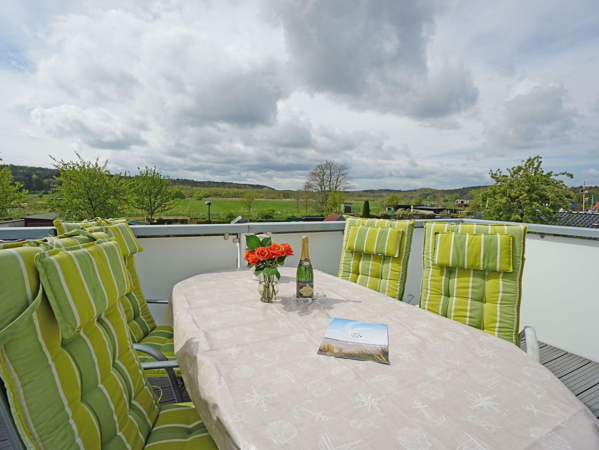 Ruhige Lage mit wunderschönem Blick in die Ahlbecker Wiesen. Die moderne Ferienwohnung Wiesenblick (75qm) verfügt über 2 Schlafzimmer für max. 3 Personen. Vom großen Wohnzimmer mit offener Küche im ersten OG gelangt man auf die großzügige möblierte Sonnenterrasse. Das Grundstück ist komplett umzäunt. Für Ihren PKW gibt es einen Außenstellplatz.