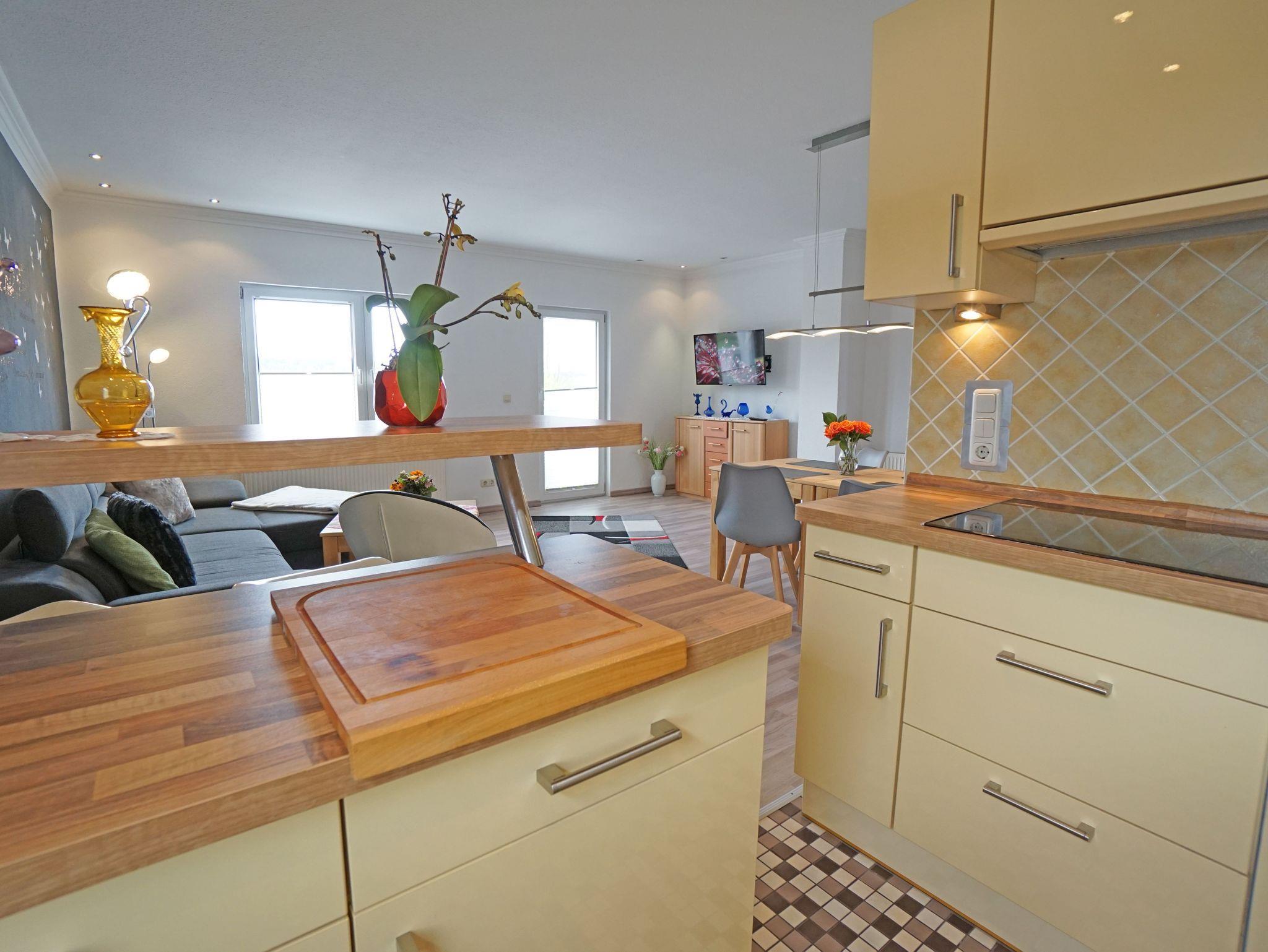 Die moderne Ferienwohnung (75qm) verfügt über 2 Schlafzimmer für max. 3 Personen. Vom großen Wohnzimmer mit offener Küche und Esstisch im ersten Obergeschoss gelangt man auf die großzügige möblierte Sonnenterrasse. Weiterhin verfügt die Wohnung über ein Duschbad. Das Grundstück ist komplett umzäunt. Für Ihren PKW gibt es einen Außenstellplatz.