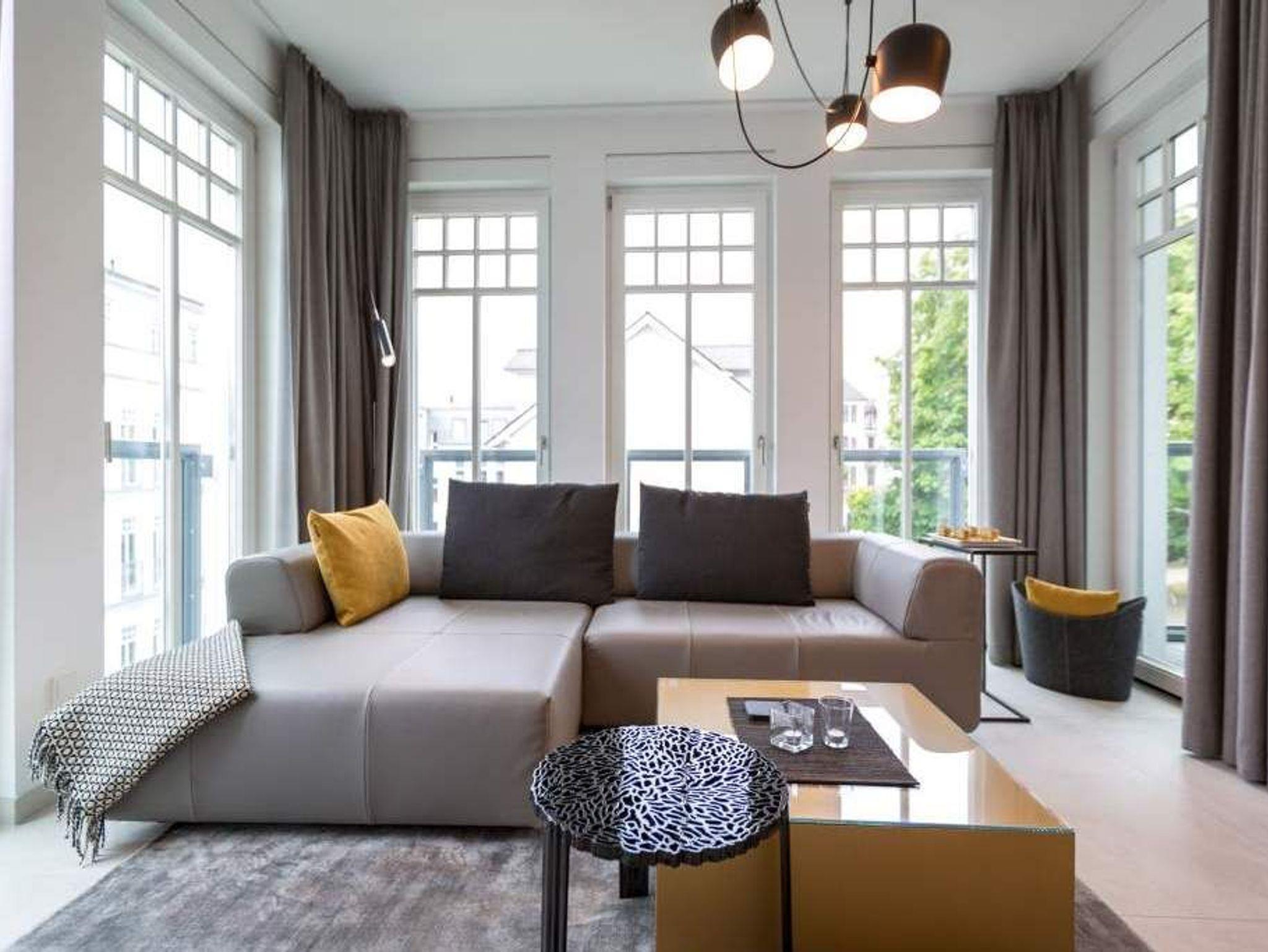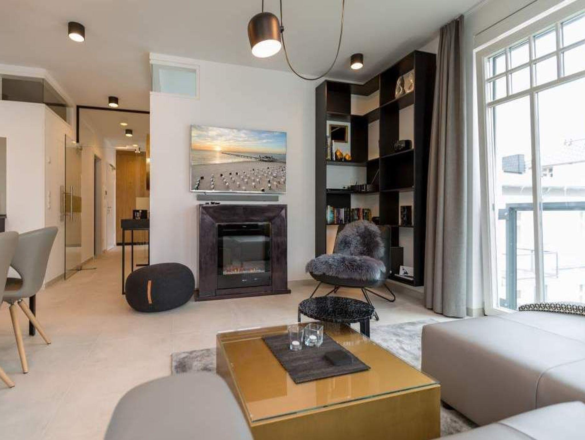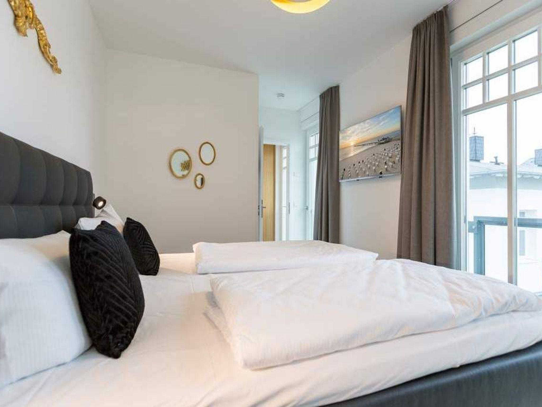 Im zweiten Oberschoss des Westendpalais zur Seeseite genießen Sie nicht nur einen herrlichen Blick auf die Ostsee, sondern es erwartet Sie zudem ein Luxusquartier. Konsequent, bis ins kleinste Detail durchdacht, offeriert sich Ihnen diese luxuriöse 2-Raum-Ferienwohnung auf großzügigen 70 qm (buchbar für 2 Personen [&] 1 Kleinkind bis 3 Jahre im Kinderreisebett). Eine Lounge von Rolf Benz, ein Essplatz von Molteni [&] C. mit Tonon Chairs, Stoffe von Gucci, Leuchten von Marchetti, Möbel von Lambert, Außenmöbel von Dedon, kombiniert mit auserlesenen Accessoires machen dieses Urlaubsnest zu einer Besonderheit. Für Multimedia ist gesorgt ? zwei große Flat-Screen-TV´s und Blue-Ray-Player lassen nichts vermissen. Der traumhafte Süd/Ost Balkon bietet Ihnen bereits zum Frühstück die Gelegenheit, die Kraft der Sonne zu tanken. Eine gemütliche Atmosphäre in der kalten Jahreszeit erweckt der Elektrokamin durch einen beruhigenden Blick in das Feuer. Das großzügige Schlafzimmer (abdunkelbar) mit Boxspring-Doppelbett inkl. Meerblick sogar im Liegen und die Diele mit geräumigem Einbauschrank befinden sich im westlichen Teil der Wohnung. Dieser Bereich wurde zusätzlich durch eine Glastür vom offenen Apartment abgetrennt und bietet Ihnen jederzeit die Möglichkeit zum Zurückziehen und Abschalten.[nbsp] Erleben Sie hier, wie unkompliziert und komfortabel sich das eigene Bad mit besonderen Wasseranwendungen zum Home Spa aufwerten lässt ? und so zu einem wesentlichen Bestandteil Ihrer persönlichen Gesundheits- und Wellness-Strategie wird. Durch das exklusive Konzept-Duschbad mit Dornbracht-Armaturen, Waterfall-Schwallbrause, Water-Points Seitenbrausen, großer ebenerdiger Walk-In Dusche, Keuco Design Badmöbeln, puristische Formen bei Waschtisch und WC und einer angrenzenden Sauna mit Farblichtanwendung möchten wir Ihre Urlaubserwartungen an Wellness und Gesundheit (Healthness) erfüllen. Zudem bieten wir Ihnen vital [&] köstlich exklusiv in diesem Appartement belebtes GRANDER Trinkwasser für mehr Lebensenergie und gesteigertes Wohlbefinden an. Für Ihren Komfort sind die Betten bei der Anreise bezogen und Handtücher liegen bereit. Ein überaus großzügiger Pkw-Stellplatz steht in der Tiefgarage zur Verfügung. Eine Waschmaschine in der Wohnung ist gegen Gebühr nutzbar. Auf Wunsch stellen wir ein Kinderreisebett (ohne zusätzliche Matratze [&] Bettzeug) und einen Kinderhochstuhl gegen einen Aufpreis zur Verfügung.