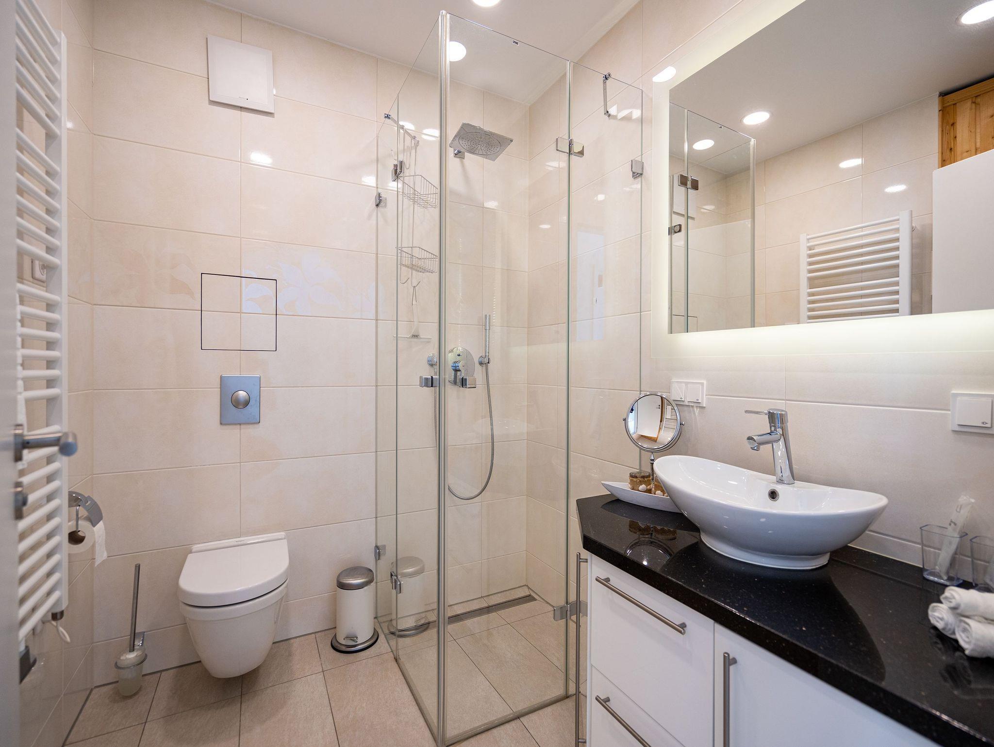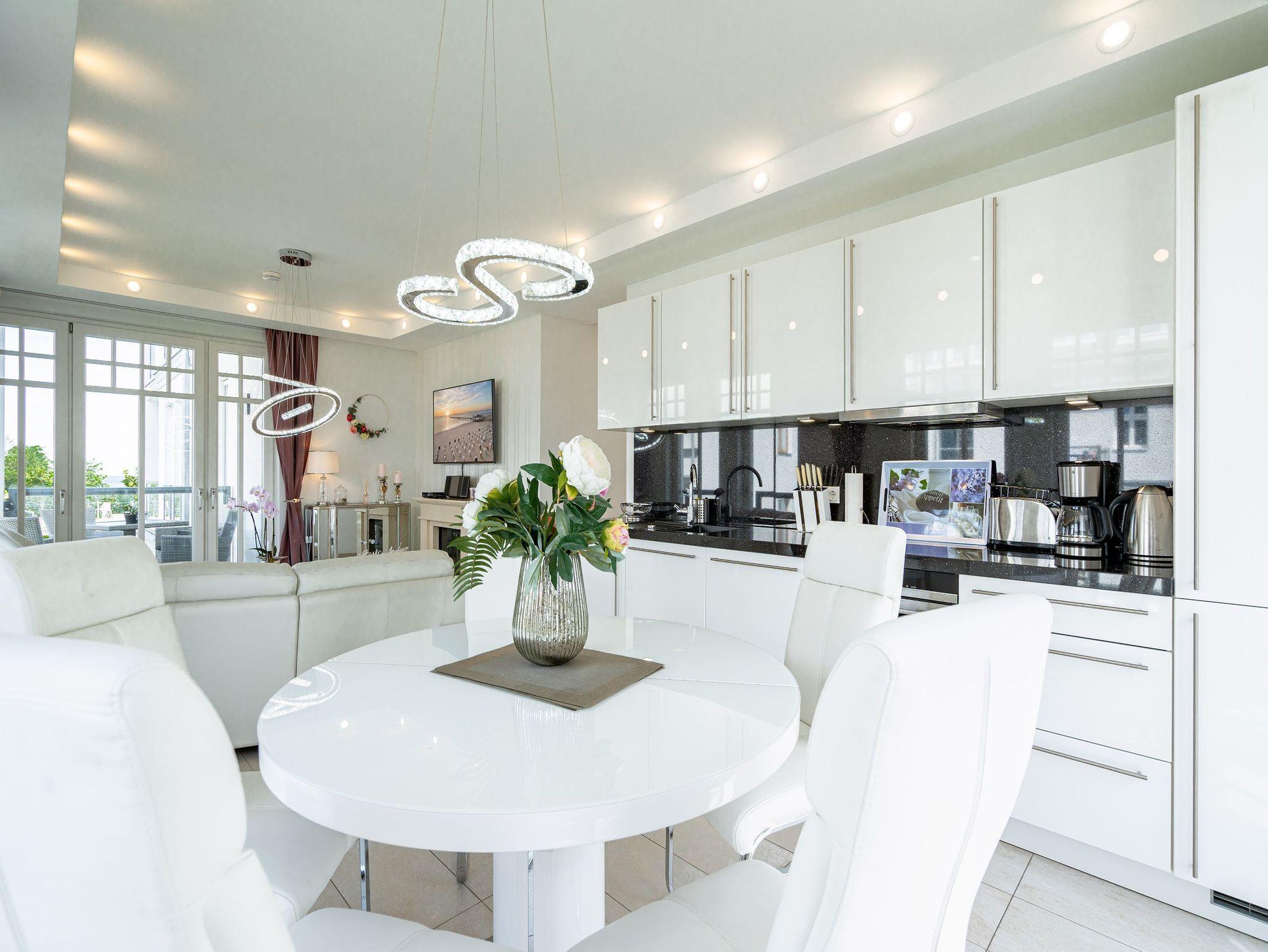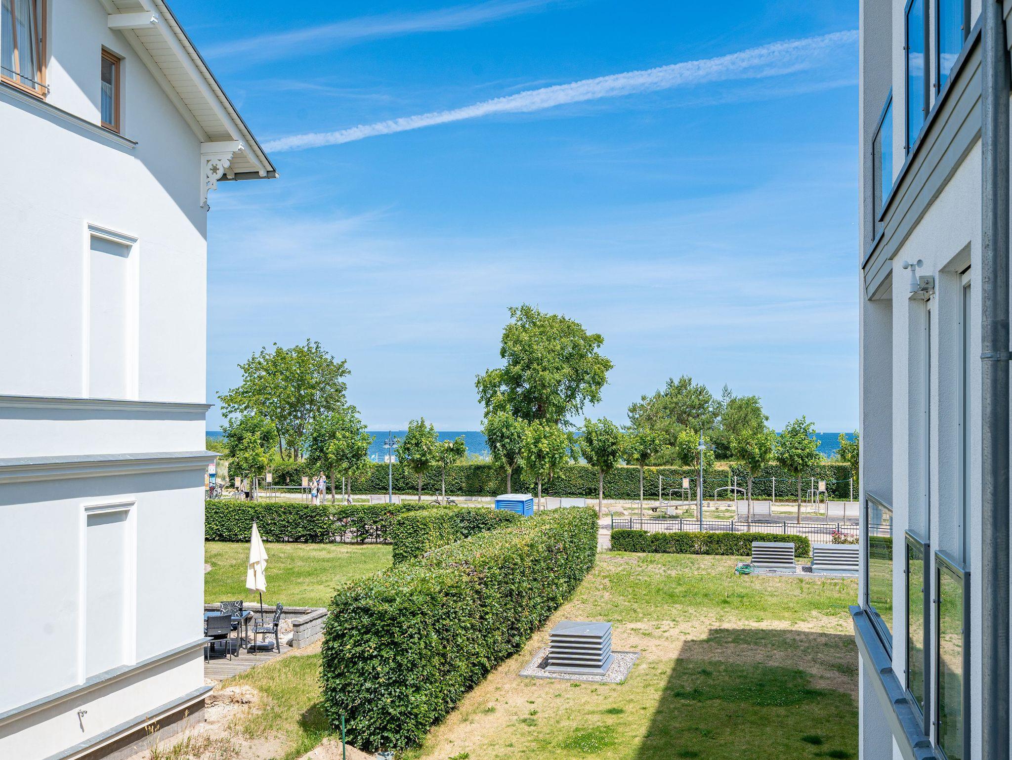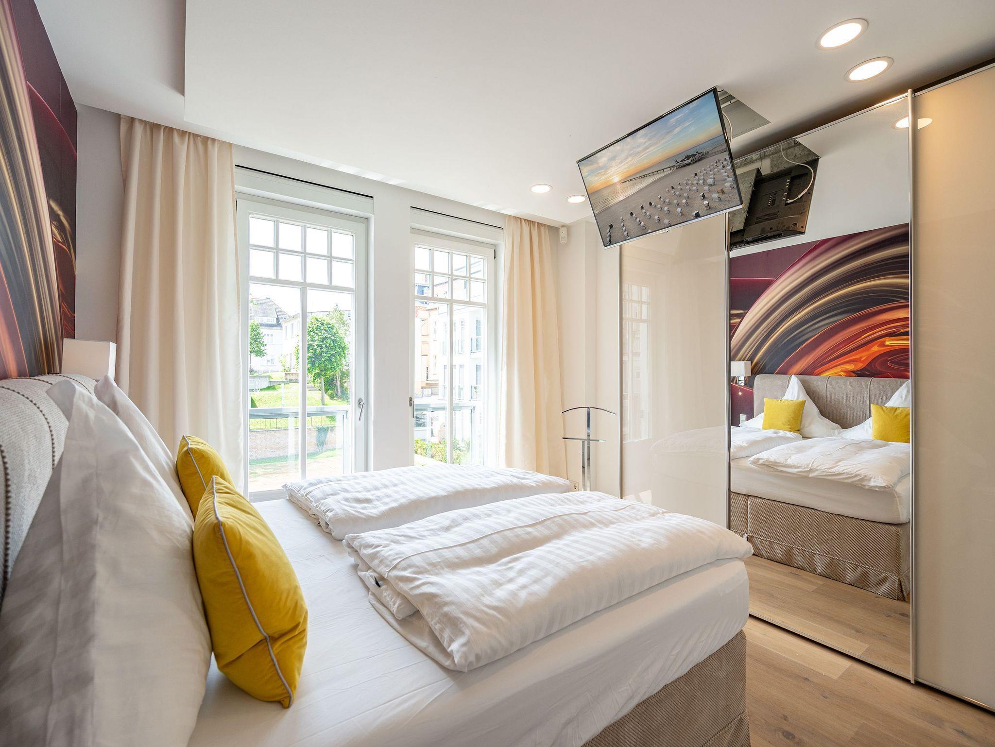 Willkommen in der Villa Westend - Appartement 10! Diese geräumige 3-Raum-Ferienwohnung im 1. Obergeschoss bietet Ihnen auf 84 Quadratmetern Platz für bis zu 4 Personen und 1 Kleinkind (bis 2 Jahre im Kinderreisebett). Der offene, helle Wohnbereich lädt mit einer gemütlichen Sitzgruppe, einem Flat-TV, Blue Ray Player, DVD Player, Radio und einem Elektrokamin mit Fernbedienung zum Entspannen ein. Die voll ausgestattete Küchenzeile verfügt über einen Backofen, ein Induktionsfeld, ein Mikrowellenkombigerät mit Grill, eine Spülmaschine, eine Kühlschrank- Gefrierkombination und eine Nespresso-Kapselmaschine. Hier können Sie Ihre Lieblingsgerichte zubereiten und diese am Essplatz genießen. Die Wohnung bietet zwei Schlafzimmer mit komfortablen Boxspringdoppelbetten (1,80 m x 2,00 m), Kleiderschrank und Flat-TV. Für Ihre Erholung stehen Ihnen zwei innenliegende Bäder zur Verfügung, jeweils mit Dusche, Waschtisch und WC. Ein Bad ist zusätzlich mit einer Finnischen Sauna ausgestattet, in der Sie wunderbar entspannen können. Als zusätzlichen Komfort können Sie den Waschtrockner kostenfrei nutzen. Die Ferienwohnung bietet Ihnen einen Nord-Ost-Balkon mit Meerblick, auf dem Sie den Tag mit einer Tasse Kaffee beginnen können, sowie einen kleinen Süd-West-Balkon. Ein PKW-Stellplatz in der Tiefgarage (Nr. 36) steht Ihnen ebenfalls zur Verfügung. Das WLAN-Netz in der Wohnung ist kostenfrei nutzbar.