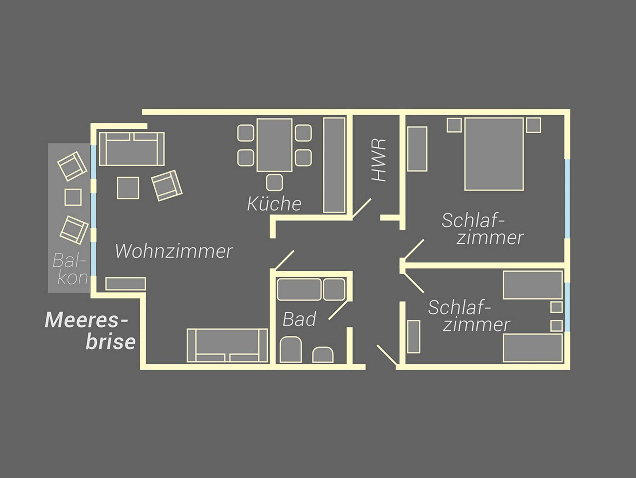 Das ca 72 qm große Appartement Meeresbrise verfügt über zwei Schlafzimmer (ein Doppelbett und zwei Einzelbetten), ein Bad mit Waschtisch, Dusche und WC sowie über ein Wohnzimmer mit offener Küche.