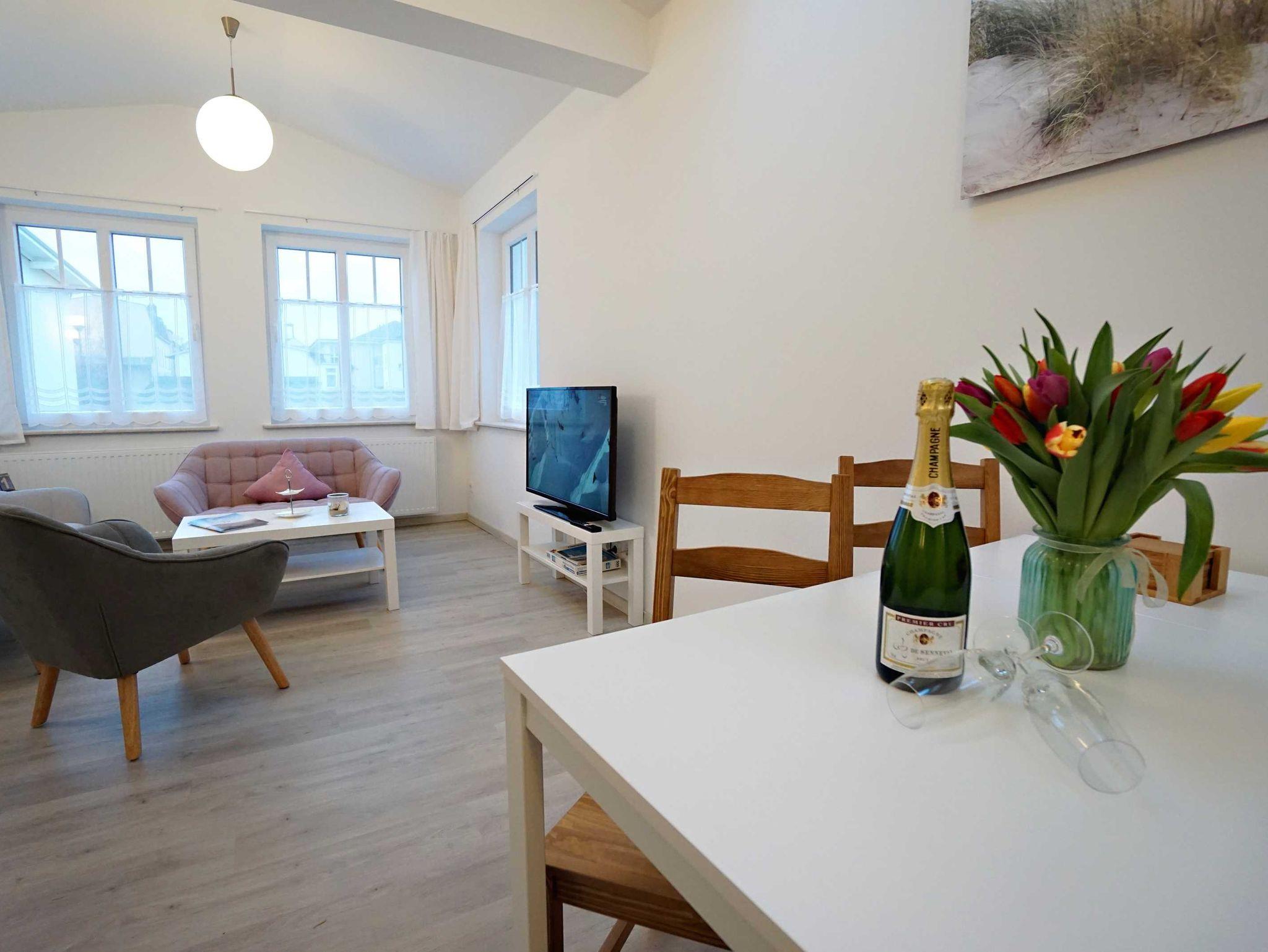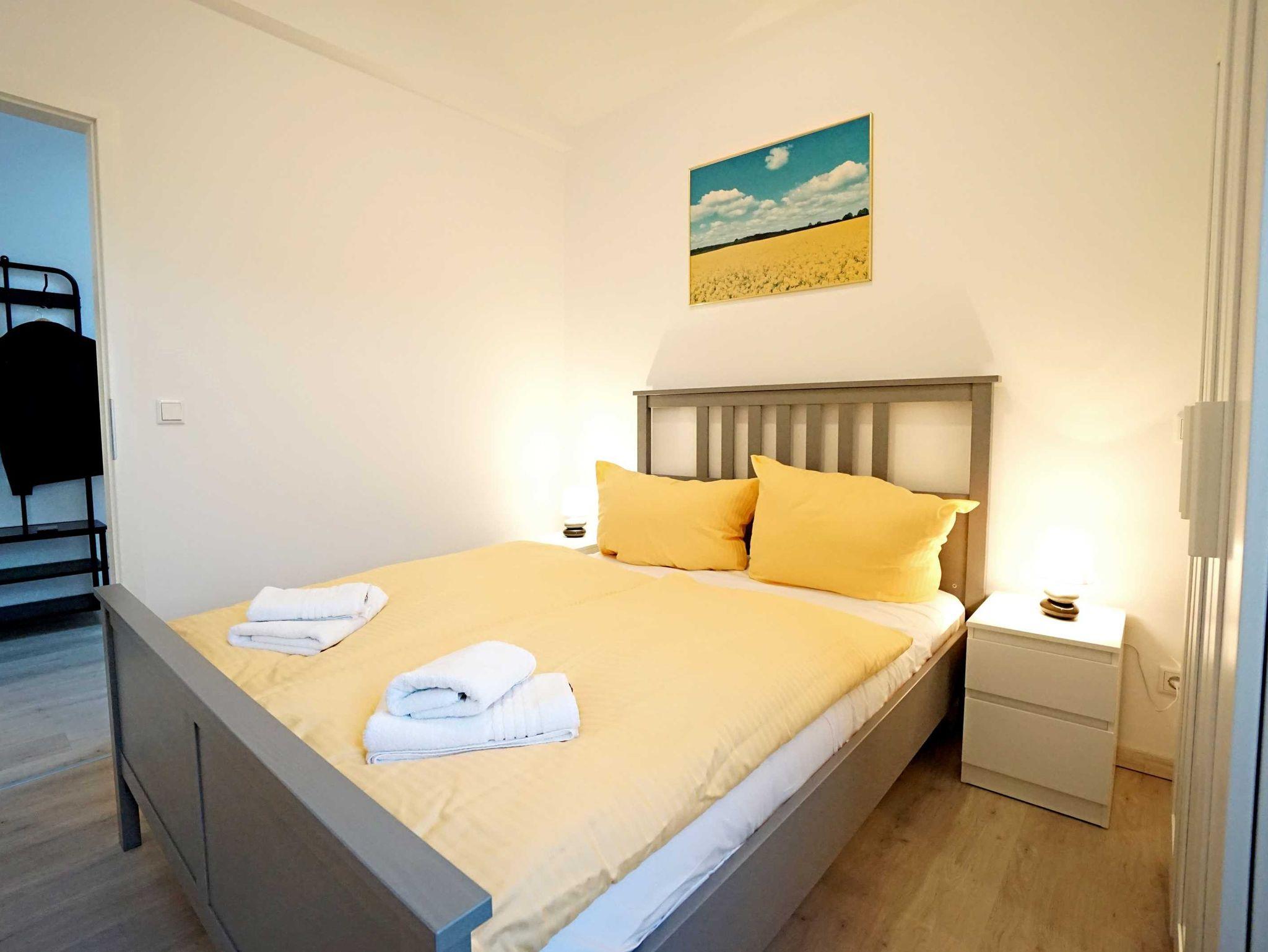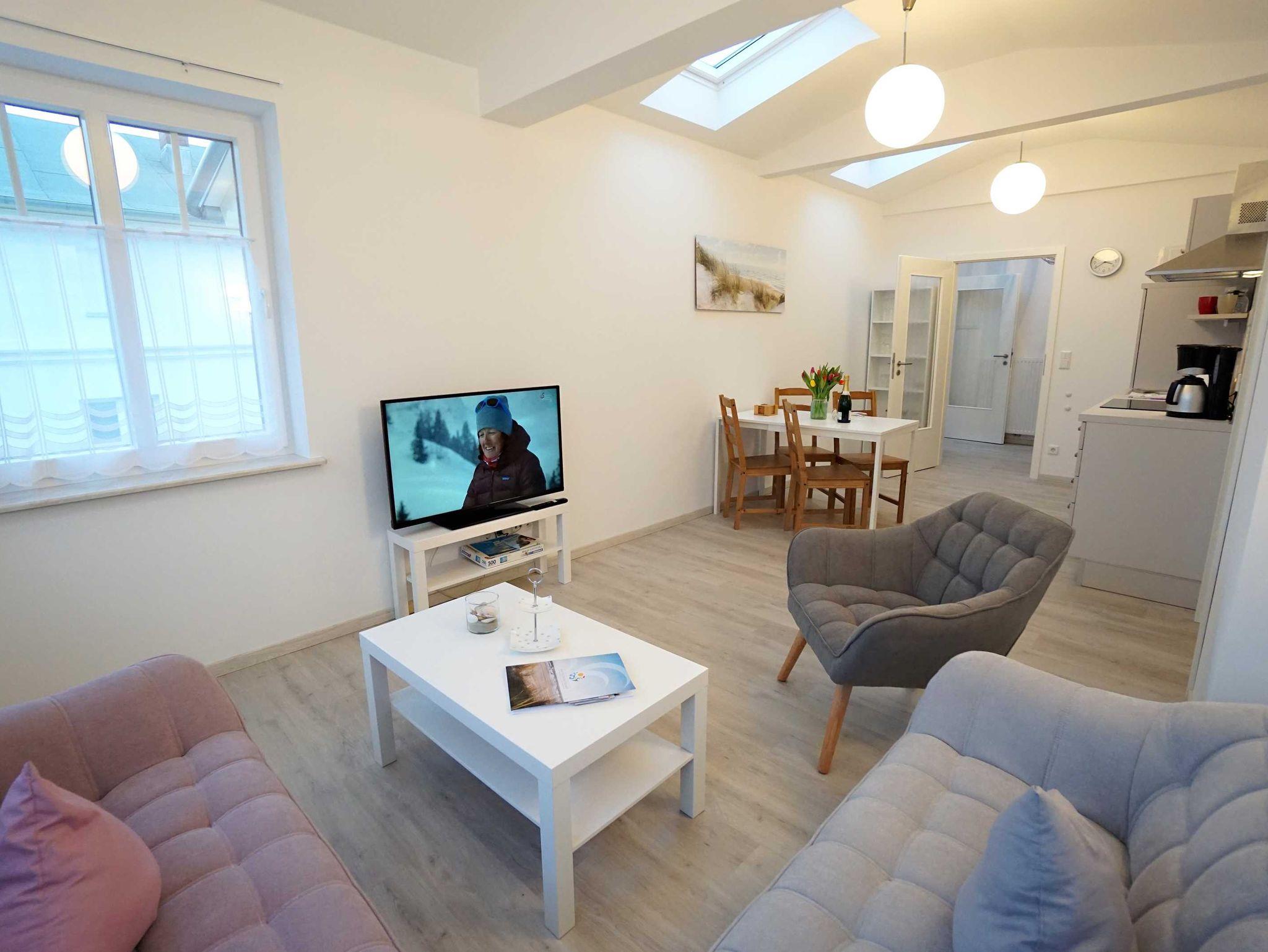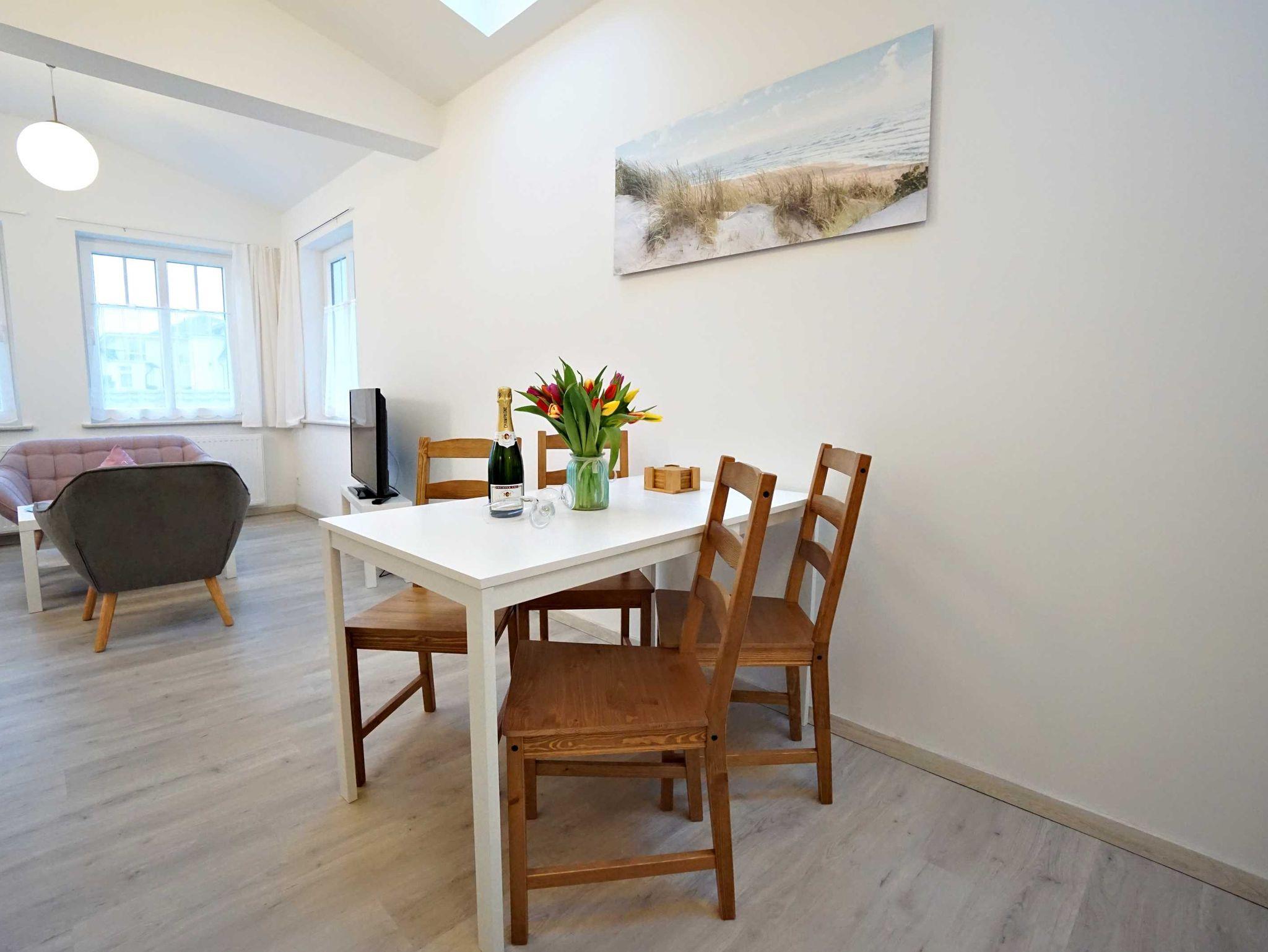 Die großzügige, lichtdurchflutete Ferienwohnung im ersten Obergeschoss verfügt über zwei Schlafzimmer, einen kombinierten Wohn- und Kochbereich sowie ein großzügiges Duschbad. Das große Schlafzimmer ist mit einem Doppelbett (160cm breit) ausgestattet und bietet genügend Platz für ein zusätzliches Kinderbett. Das zweite Schlafzimmer verfügt auch über ein Doppelbett (140cm breit). Der kombinierte Wohn- Kochraum verfügt über eine komplett ausgestattete Küchenzeile, einen Esstisch und eine gemütliche Fernsehecke im Erkerbereich. Die Wohnung besticht durch ihre komfortable, moderne Ausstattung, die Größe und die direkte Nähe zum feinen Ostseestrand und der Promenade.