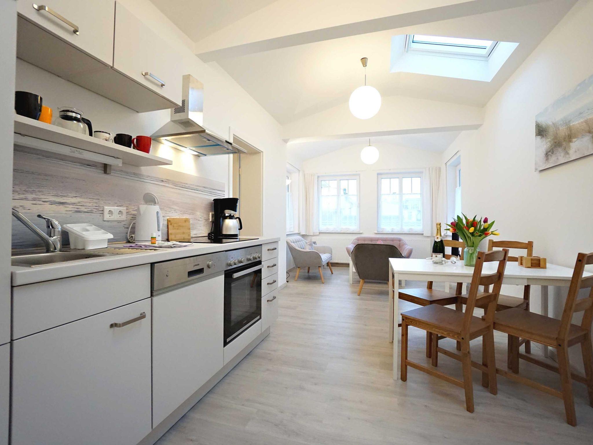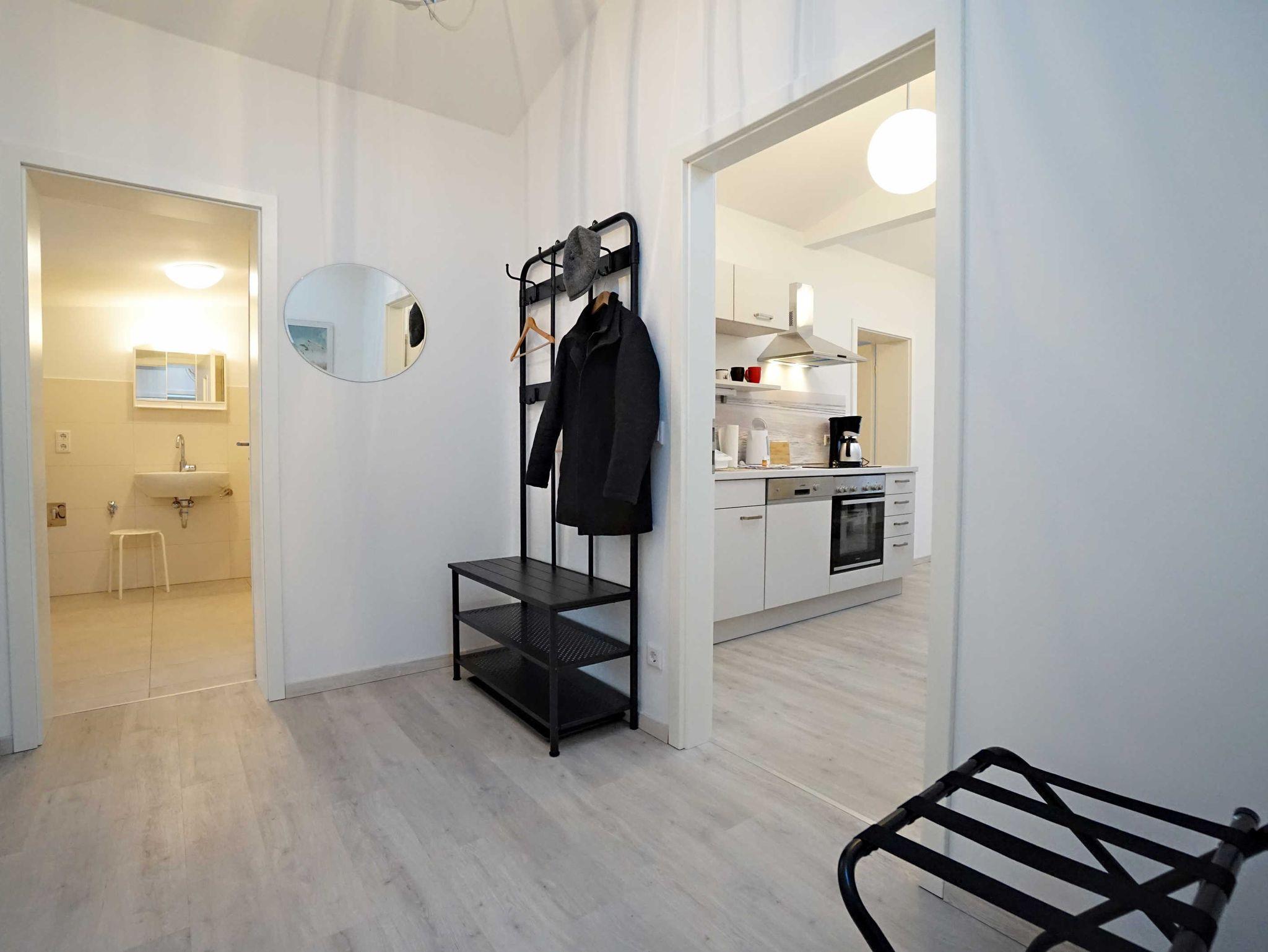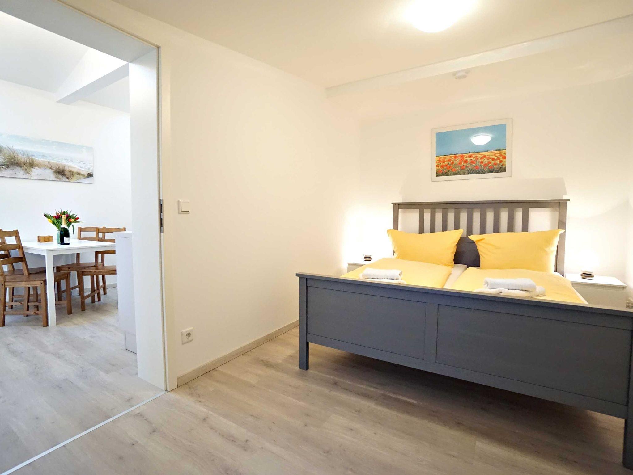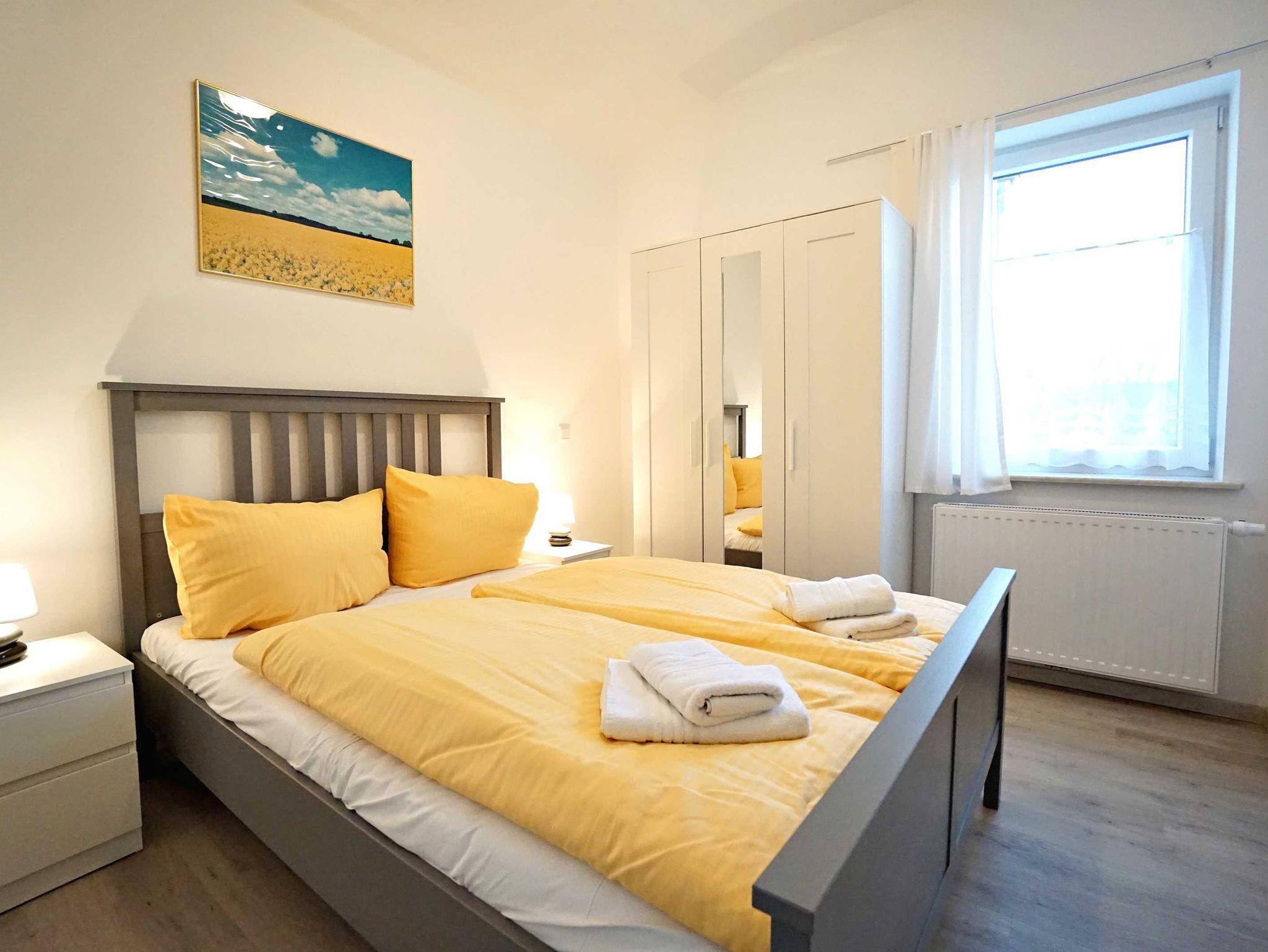 Die großzügige, lichtdurchflutete Ferienwohnung im ersten Obergeschoss verfügt über zwei Schlafzimmer, einen kombinierten Wohn- und Kochbereich sowie ein großzügiges Duschbad. Das große Schlafzimmer ist mit einem Doppelbett (160cm breit) ausgestattet und bietet genügend Platz für ein zusätzliches Kinderbett. Das zweite Schlafzimmer verfügt auch über ein Doppelbett (140cm breit). Der kombinierte Wohn- Kochraum verfügt über eine komplett ausgestattete Küchenzeile, einen Esstisch und eine gemütliche Fernsehecke im Erkerbereich. Die Wohnung besticht durch ihre komfortable, moderne Ausstattung, die Größe und die direkte Nähe zum feinen Ostseestrand und der Promenade.