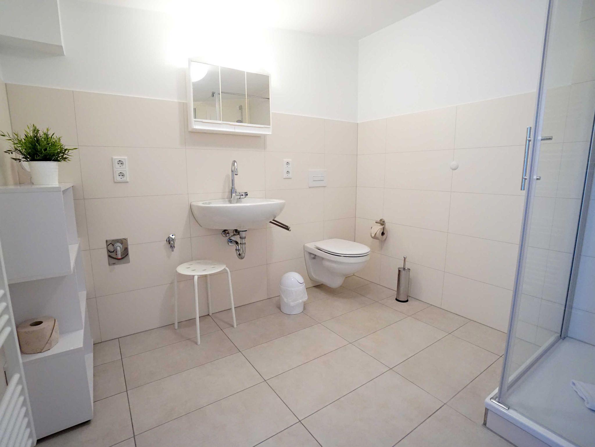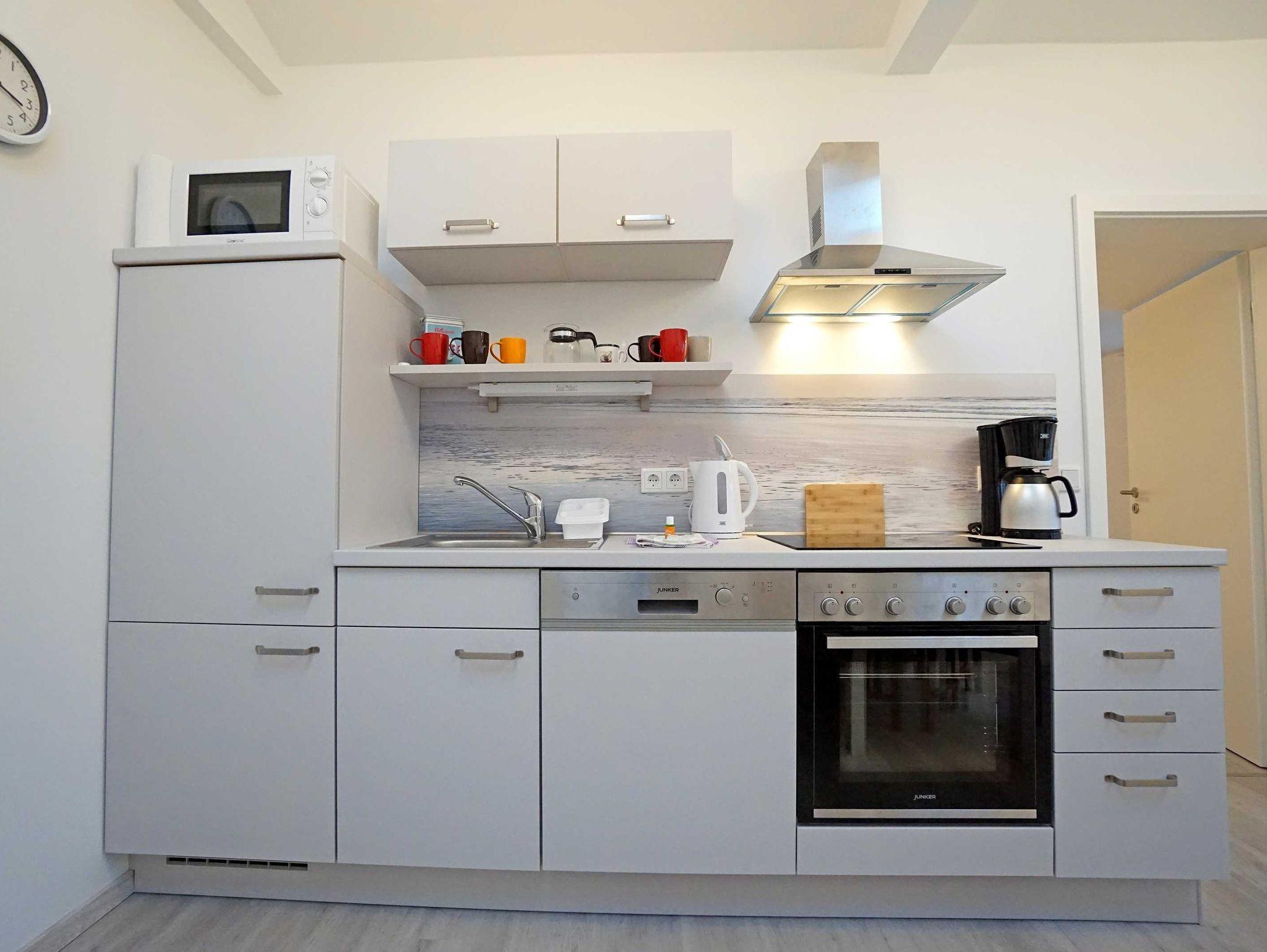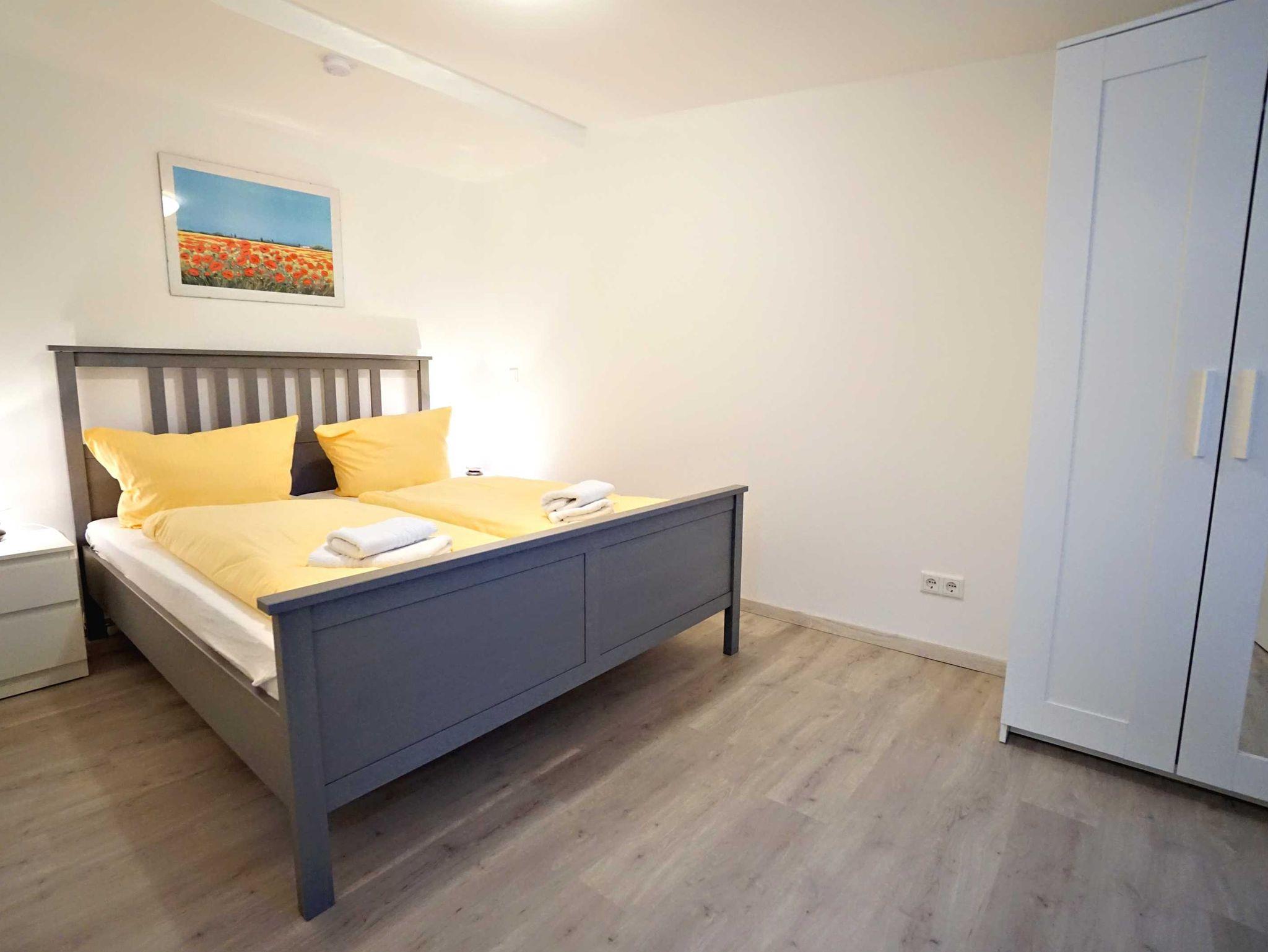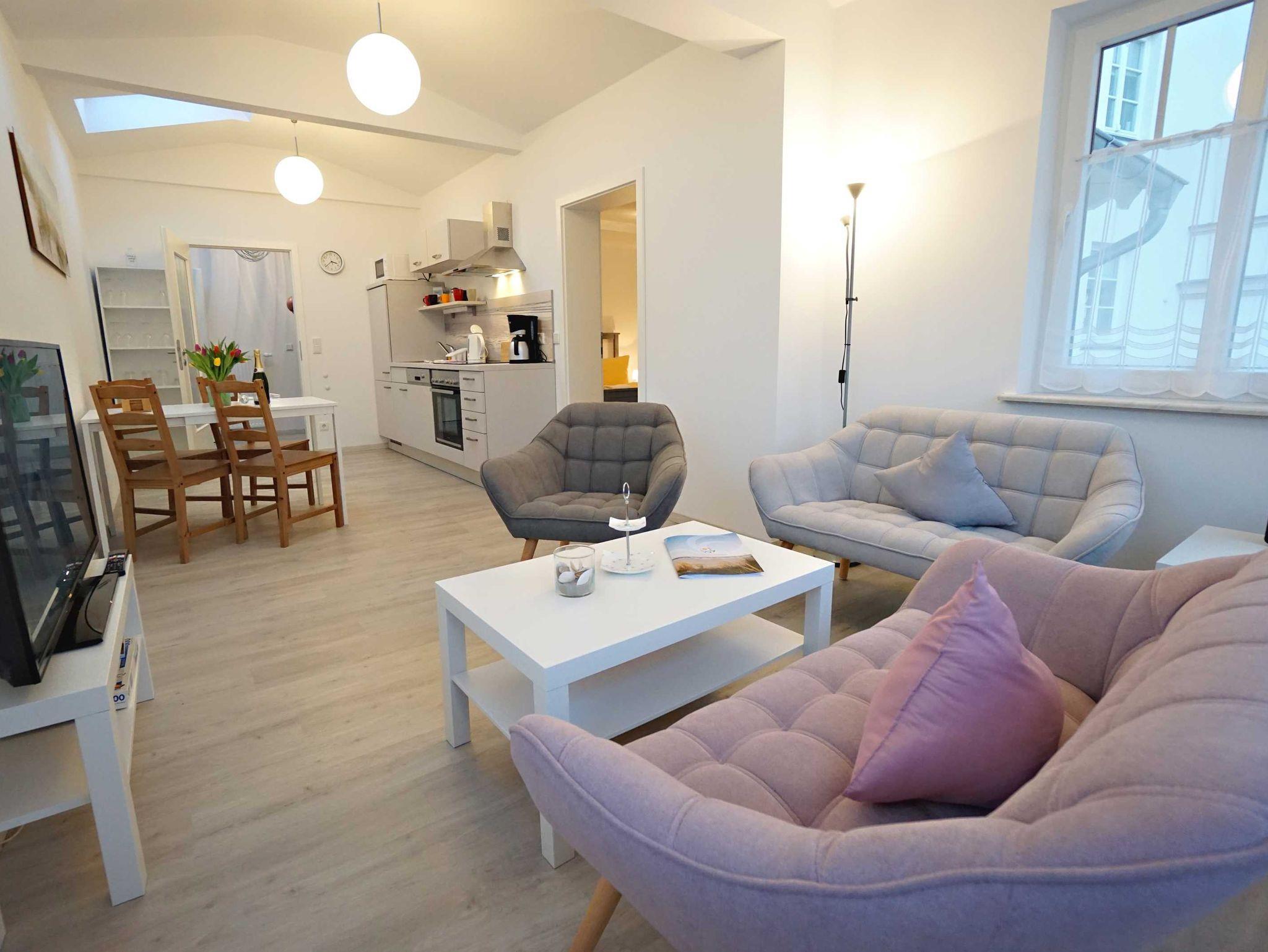 Die großzügige, lichtdurchflutete Ferienwohnung im ersten Obergeschoss verfügt über zwei Schlafzimmer, einen kombinierten Wohn- und Kochbereich sowie ein großzügiges Duschbad. Das große Schlafzimmer ist mit einem Doppelbett (160cm breit) ausgestattet und bietet genügend Platz für ein zusätzliches Kinderbett. Das zweite Schlafzimmer verfügt auch über ein Doppelbett (140cm breit). Der kombinierte Wohn- Kochraum verfügt über eine komplett ausgestattete Küchenzeile, einen Esstisch und eine gemütliche Fernsehecke im Erkerbereich. Die Wohnung besticht durch ihre komfortable, moderne Ausstattung, die Größe und die direkte Nähe zum feinen Ostseestrand und der Promenade.