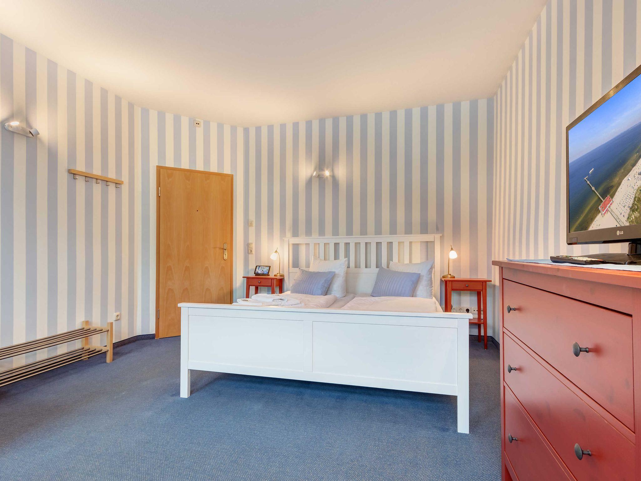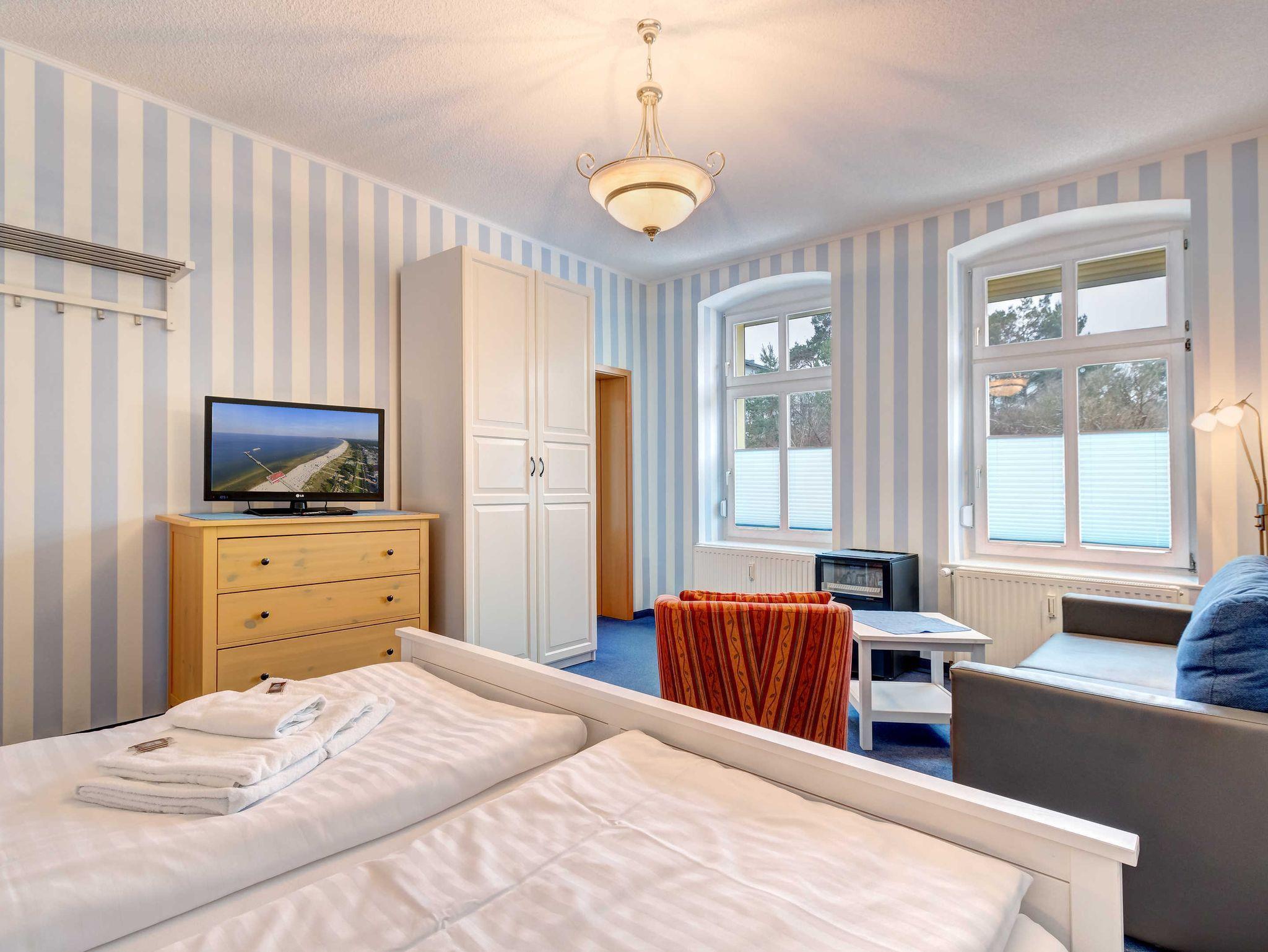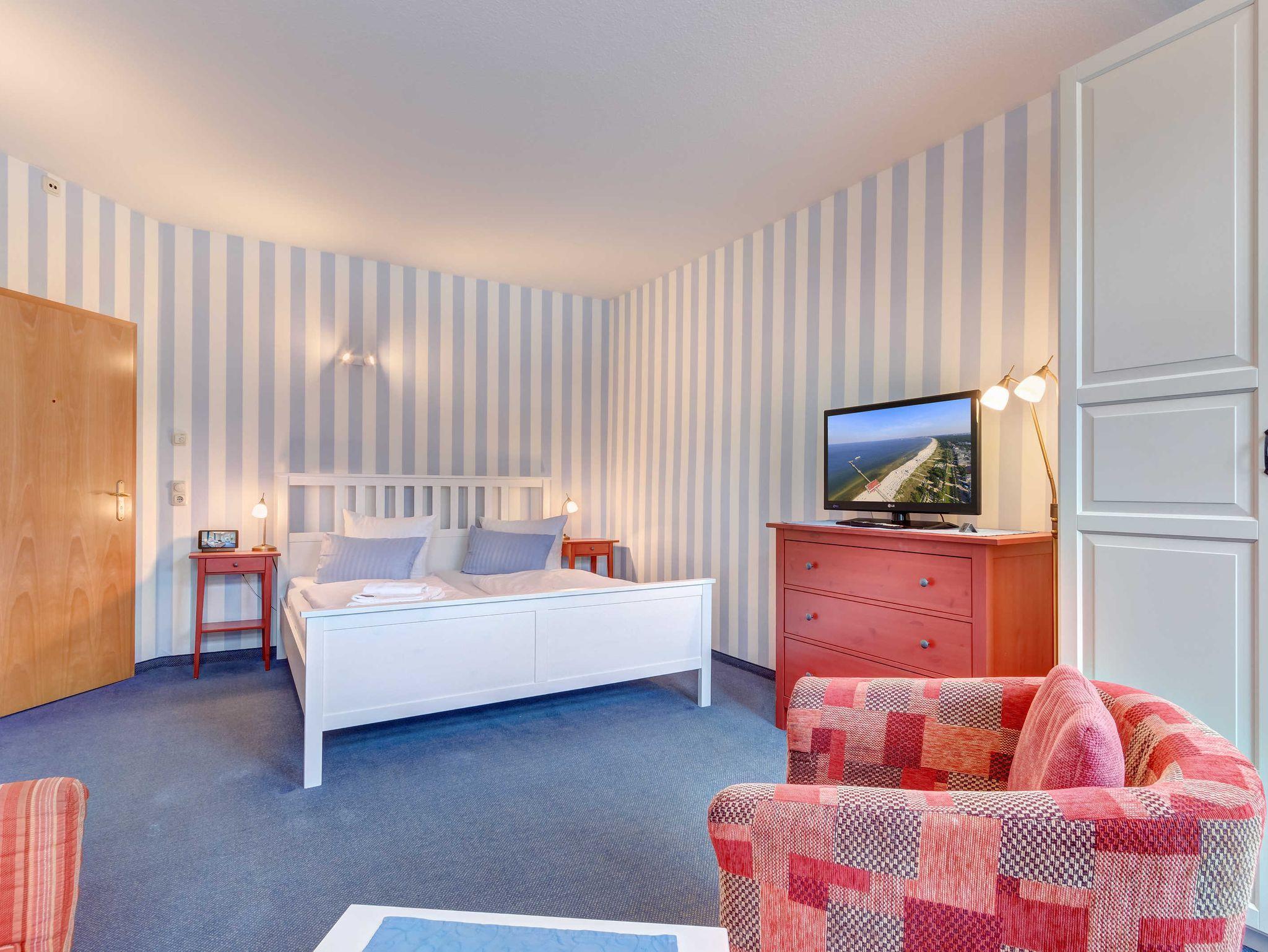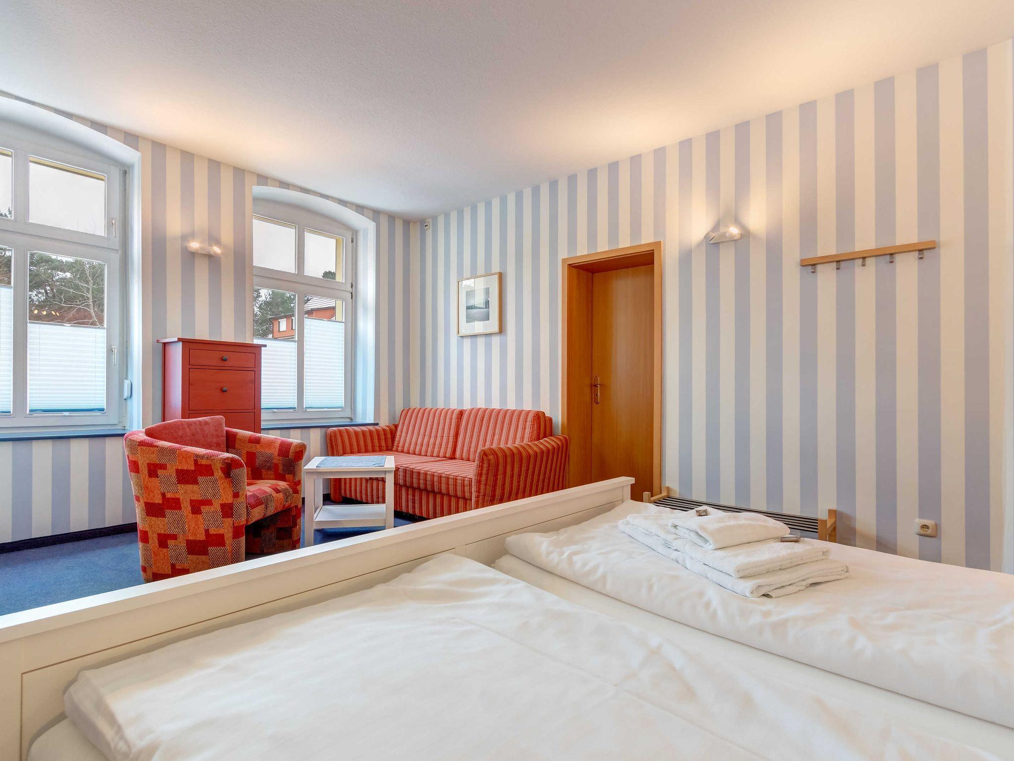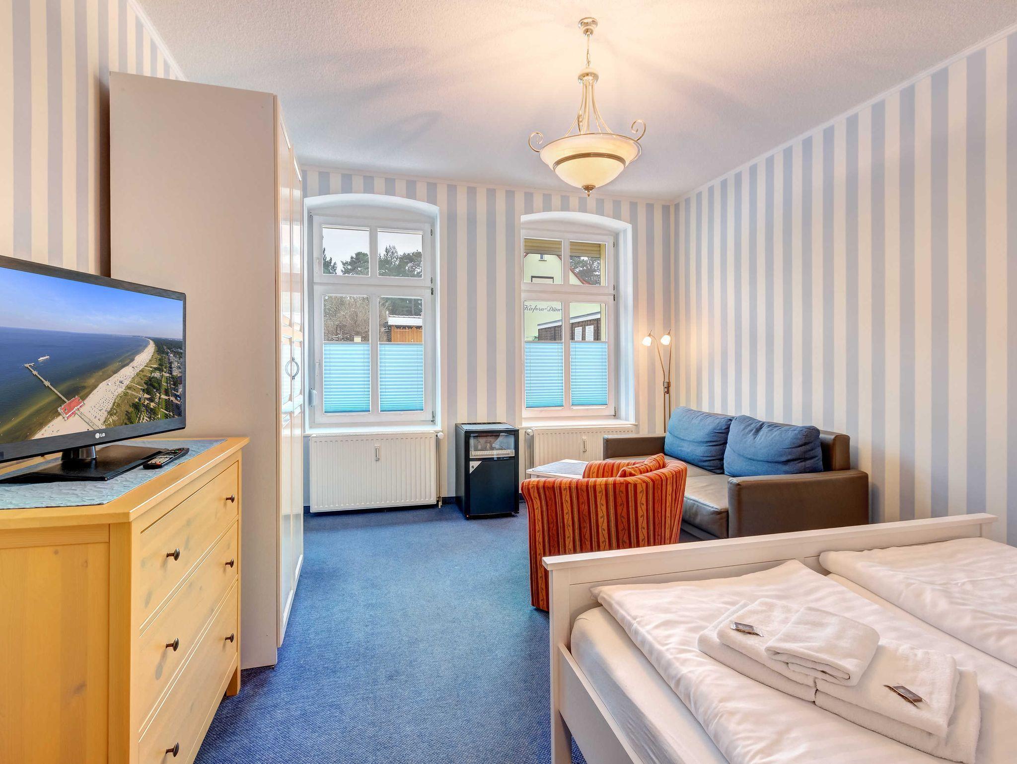 Doppelzimmer zur Landseite mit Doppelbett, Couchgruppe, Kühlmöglichkeit, Kabel-TV, Tablet-PC, Bad mit Fenster.