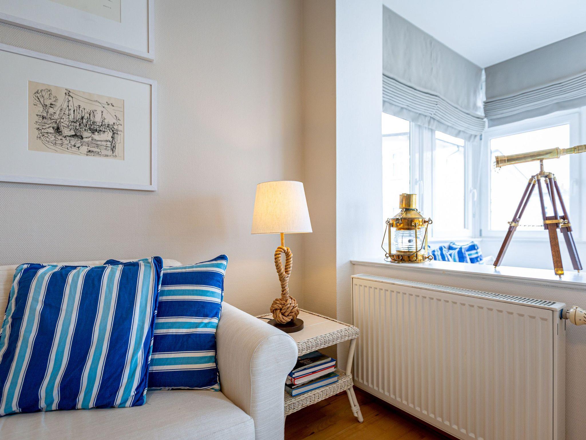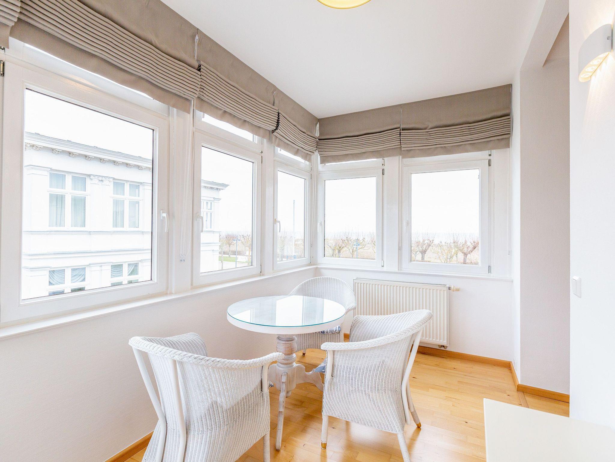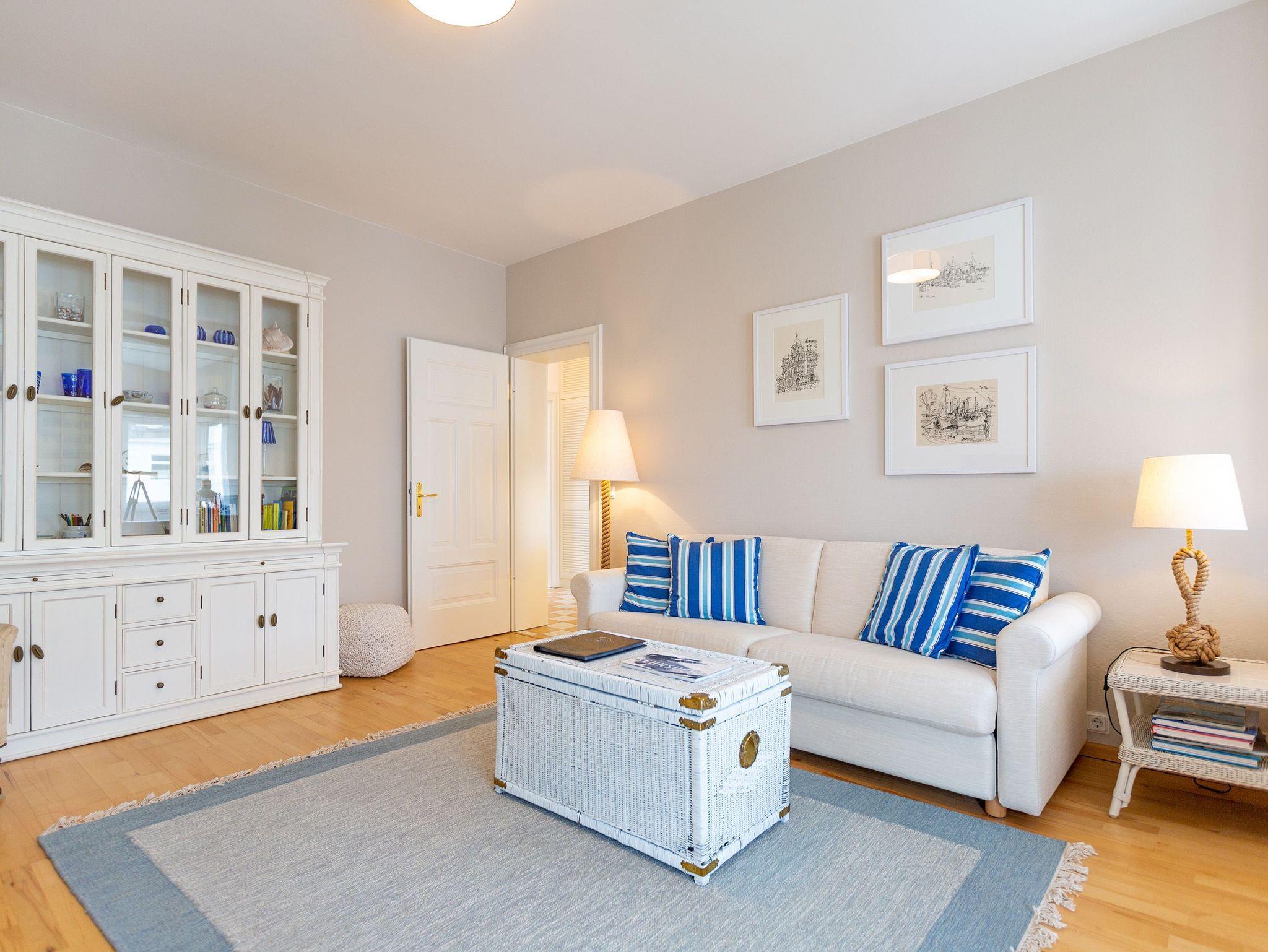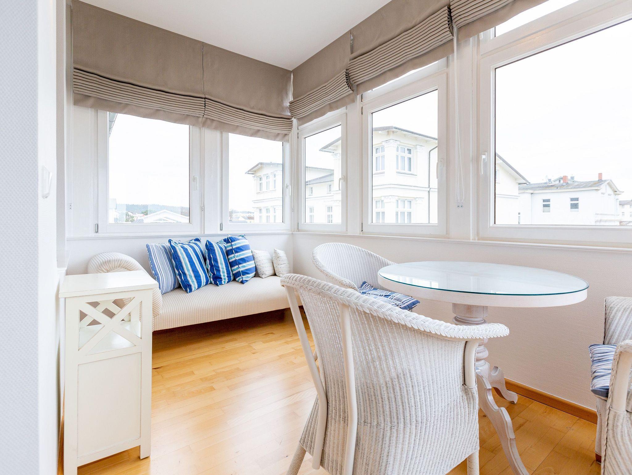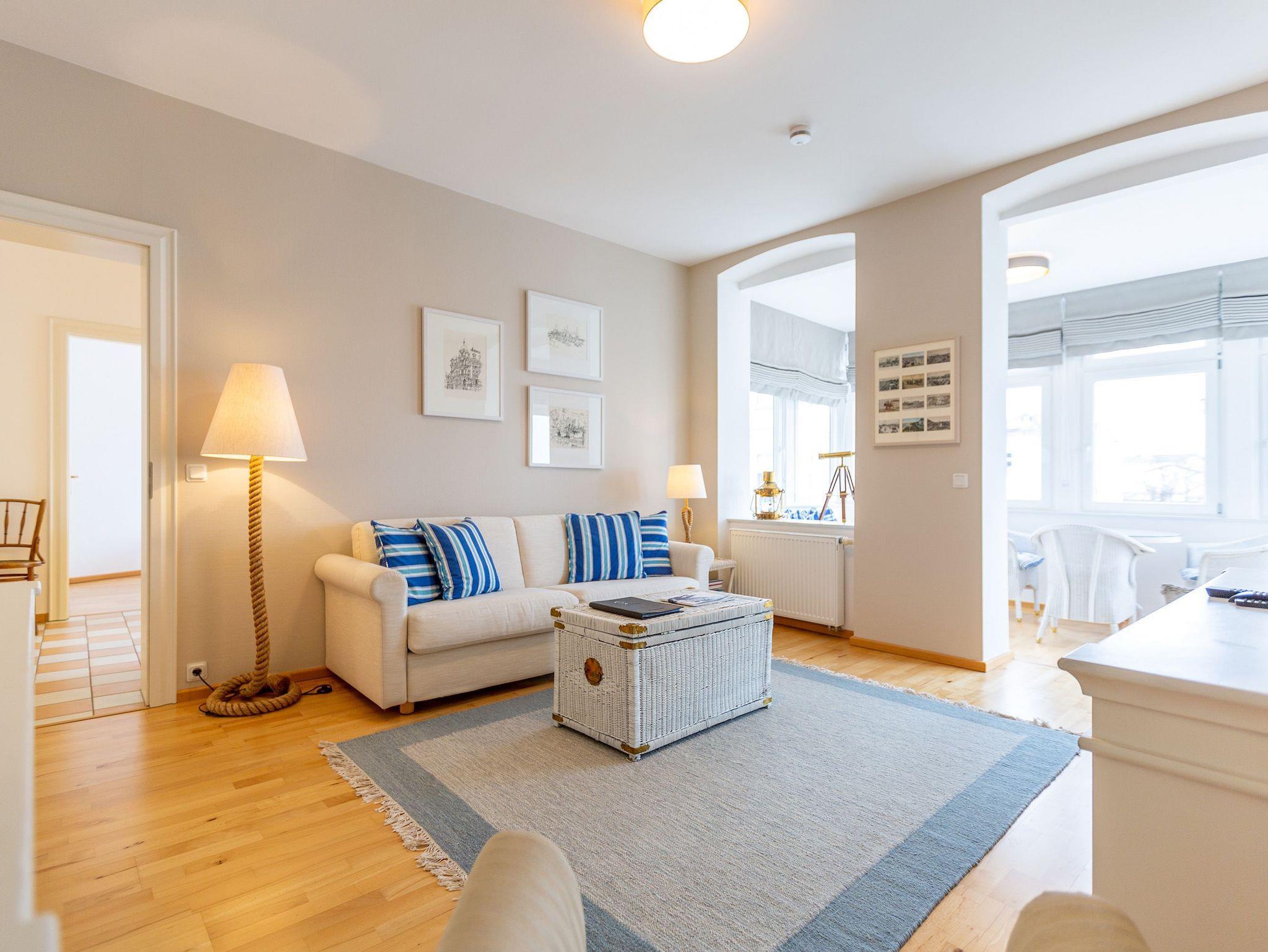 Leichtigkeit und Klarheit strahlt das Appartement Nummer 8 in der 1. Etage aus. Mit viel Liebe zum Detail sind die 57 Quadratmeter eingerichtet, bieten Platz für zwei Personen plus eine Aufbettung (eventuell für ein Kind bis 15 Jahre) auf dem Schlafsofa. Lagom nennen es die Schweden, wenn sich alles, womit man sich umgibt, in einer harmonischen Balance befindet. Das in skandinavischem Landhausstil eingerichtete Zwei-Zimmer-Appartement empfängt Ostseeliebhaber mit genau diesem Lagom. Lichtdurchflutet ist das geräumige Wohnzimmer mit der offenen Loggia, von der aus Sie sogar seitlichen Meerblick haben. Viel Weiß herrscht vor ? kombiniert mit maritimen Farbakzenten und maritimen Accessoires. Das bequeme Sofa, das zu einer Schlafcouch umfunktioniert werden kann, lädt zum Entspannen ein. Ein großer Flat-TV mit DVD-Player gehört zur Ausstattung des Raumes dazu. In der glasumrandete Veranda befindet sich ein schöner Essplatz für drei Personen. Die Küche ist voll ausgestattet mit Herd, Geschirrspüler, Kühl-Gefrierschrank, Kaffeevollautomat, Mikrowelle und Wasserkocher. Auch Geschirr finden Sie in den Schränken. Ein gemütlicher Rückzugsort ist das Schlafzimmer mit großem Doppelbett (1,80 m x 2,00 m). Passend zum mondänen Charme der alten Bädervilla ist die Ausstattung des Tageslichtbades äußerst schick und nobel. Eine ebenerdige Dusche, die viel Platz zum ausgiebigen Berieseln bietet, ein großzügiger Waschtisch, WC und Bidet gehören dazu. Handtücher liegen für Sie bei Anreise bereit. Und auch das Bett ist bezogen. Das WLAN ist kostenfrei und in der Tiefgarage ist für Sie der Stellplatz Nummer 8 reserviert.