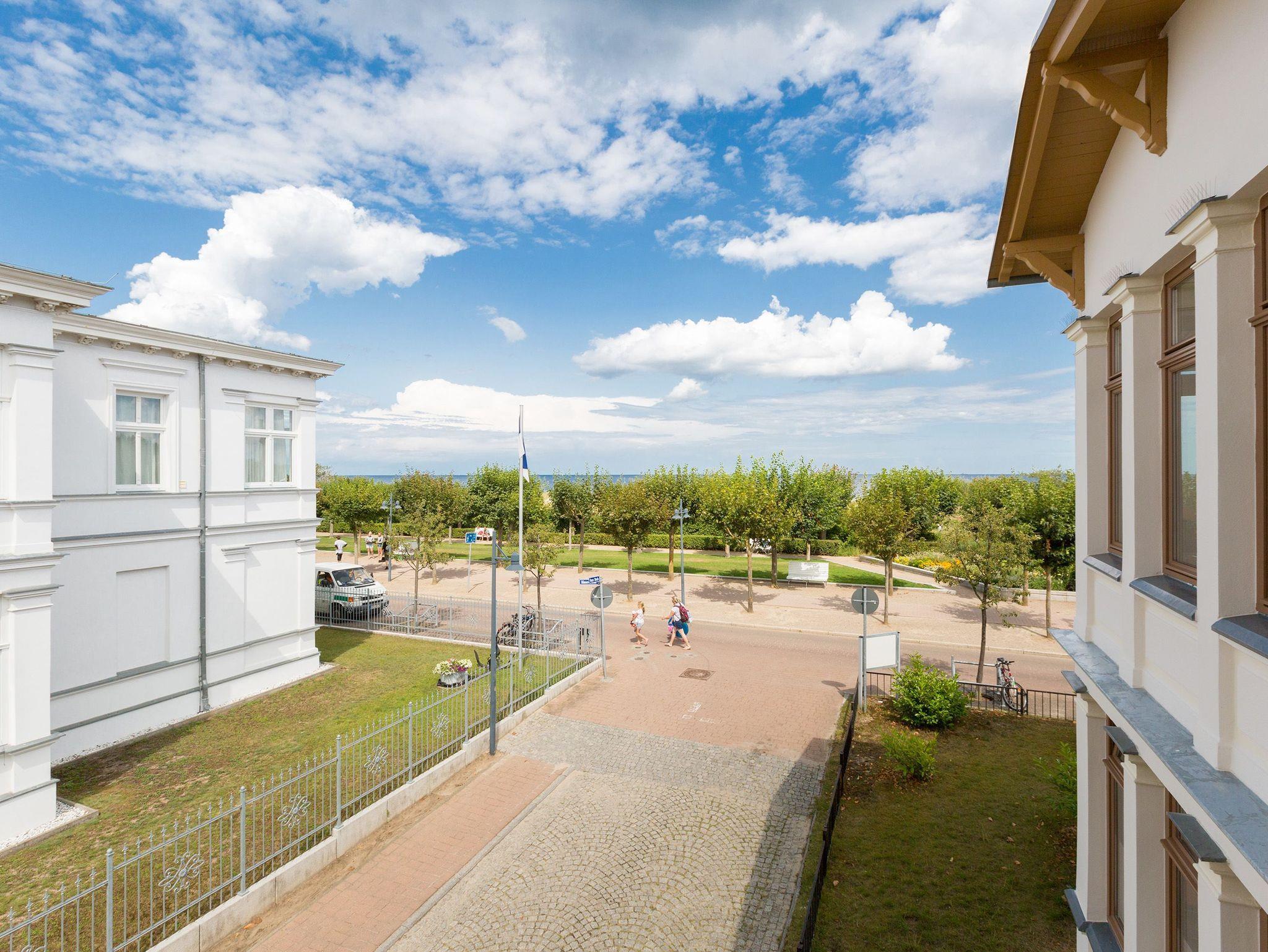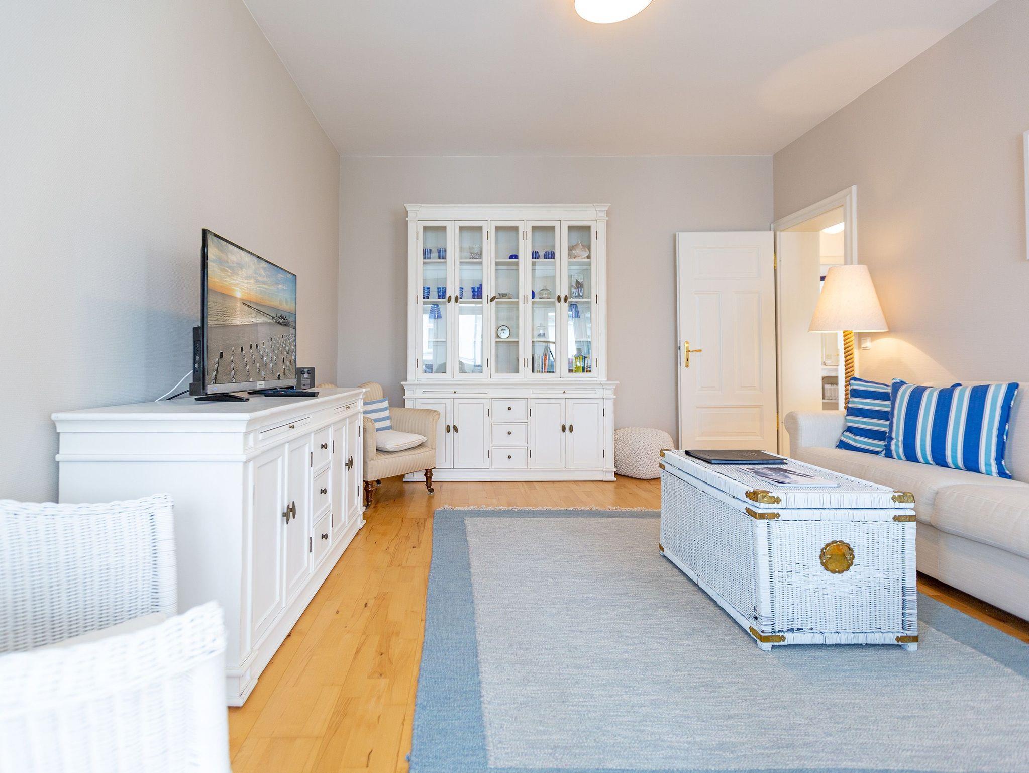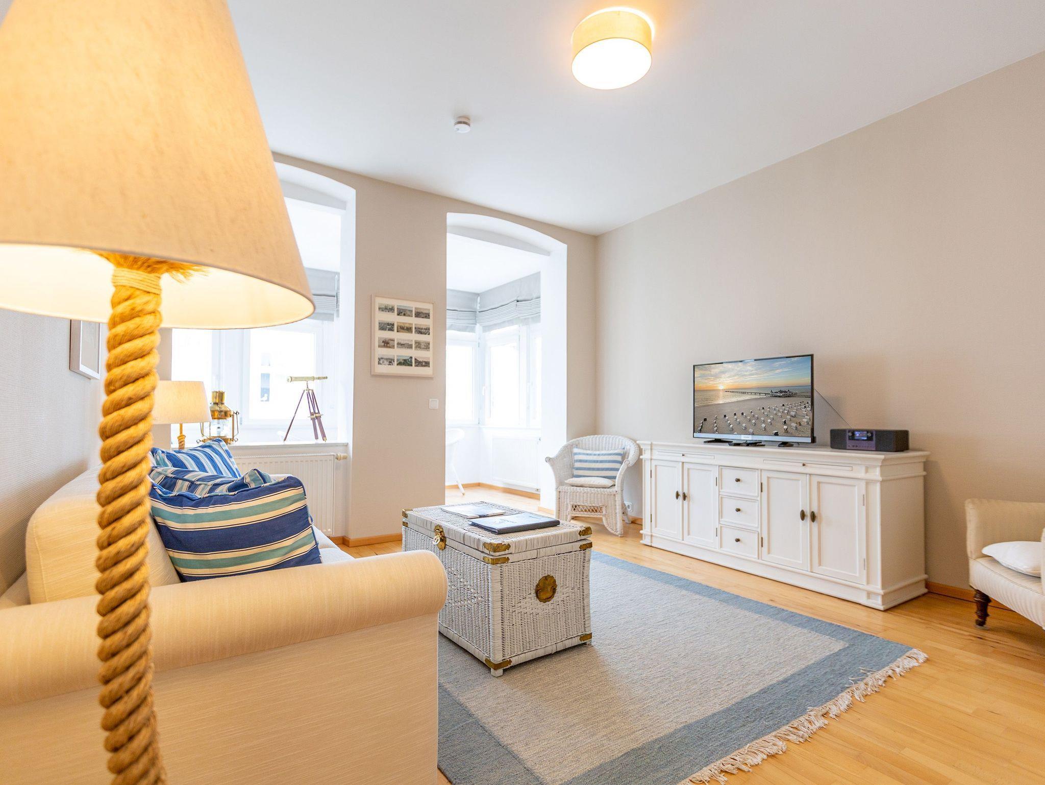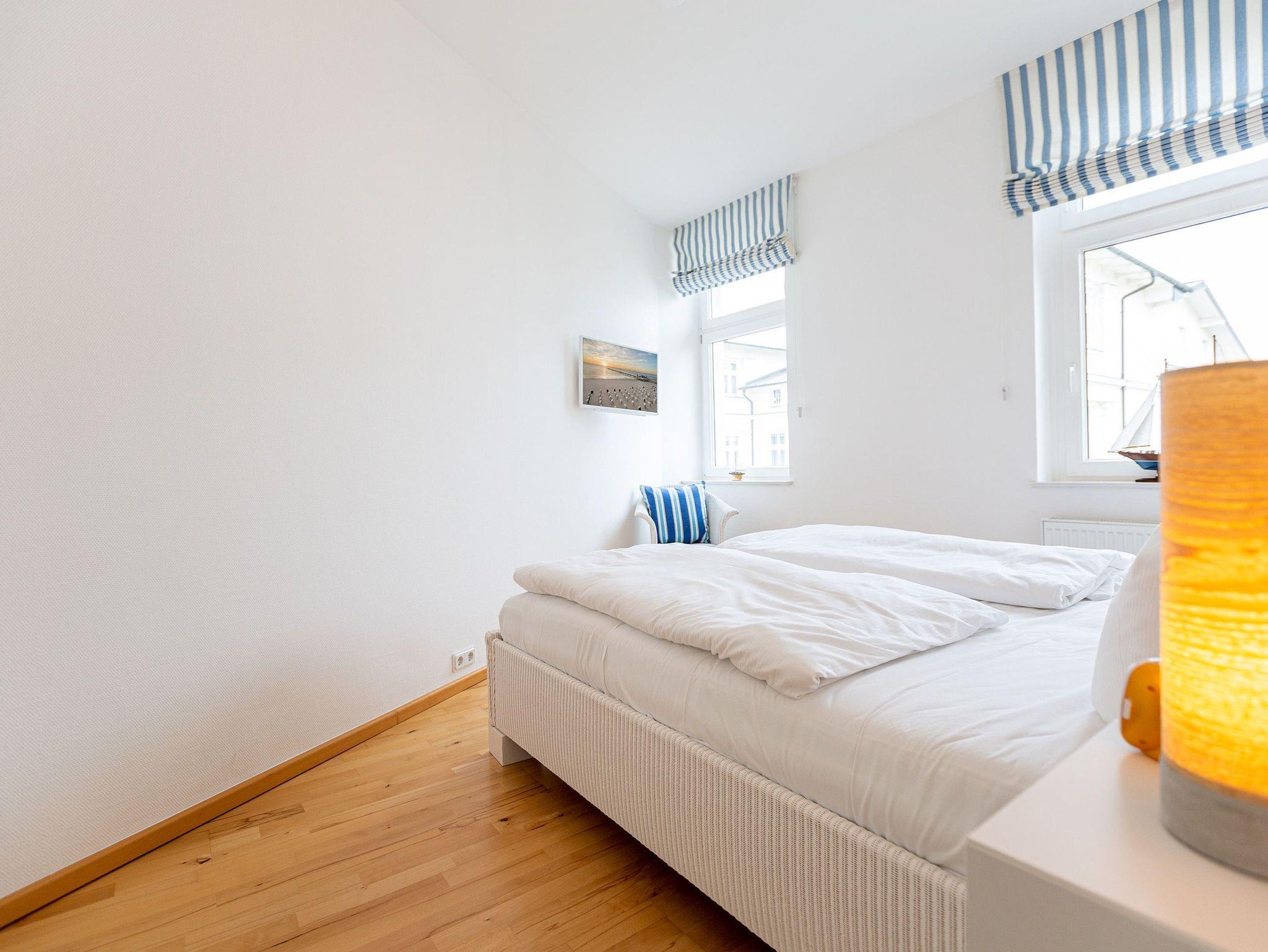 Leichtigkeit und Klarheit strahlt das Appartement Nummer 8 in der 1. Etage aus. Mit viel Liebe zum Detail sind die 57 Quadratmeter eingerichtet, bieten Platz für zwei Personen plus eine Aufbettung (eventuell für ein Kind bis 15 Jahre) auf dem Schlafsofa. Lagom nennen es die Schweden, wenn sich alles, womit man sich umgibt, in einer harmonischen Balance befindet. Das in skandinavischem Landhausstil eingerichtete Zwei-Zimmer-Appartement empfängt Ostseeliebhaber mit genau diesem Lagom. Lichtdurchflutet ist das geräumige Wohnzimmer mit der offenen Loggia, von der aus Sie sogar seitlichen Meerblick haben. Viel Weiß herrscht vor ? kombiniert mit maritimen Farbakzenten und maritimen Accessoires. Das bequeme Sofa, das zu einer Schlafcouch umfunktioniert werden kann, lädt zum Entspannen ein. Ein großer Flat-TV mit DVD-Player gehört zur Ausstattung des Raumes dazu. In der glasumrandete Veranda befindet sich ein schöner Essplatz für drei Personen. Die Küche ist voll ausgestattet mit Herd, Geschirrspüler, Kühl-Gefrierschrank, Kaffeevollautomat, Mikrowelle und Wasserkocher. Auch Geschirr finden Sie in den Schränken. Ein gemütlicher Rückzugsort ist das Schlafzimmer mit großem Doppelbett (1,80 m x 2,00 m). Passend zum mondänen Charme der alten Bädervilla ist die Ausstattung des Tageslichtbades äußerst schick und nobel. Eine ebenerdige Dusche, die viel Platz zum ausgiebigen Berieseln bietet, ein großzügiger Waschtisch, WC und Bidet gehören dazu. Handtücher liegen für Sie bei Anreise bereit. Und auch das Bett ist bezogen. Das WLAN ist kostenfrei und in der Tiefgarage ist für Sie der Stellplatz Nummer 8 reserviert.