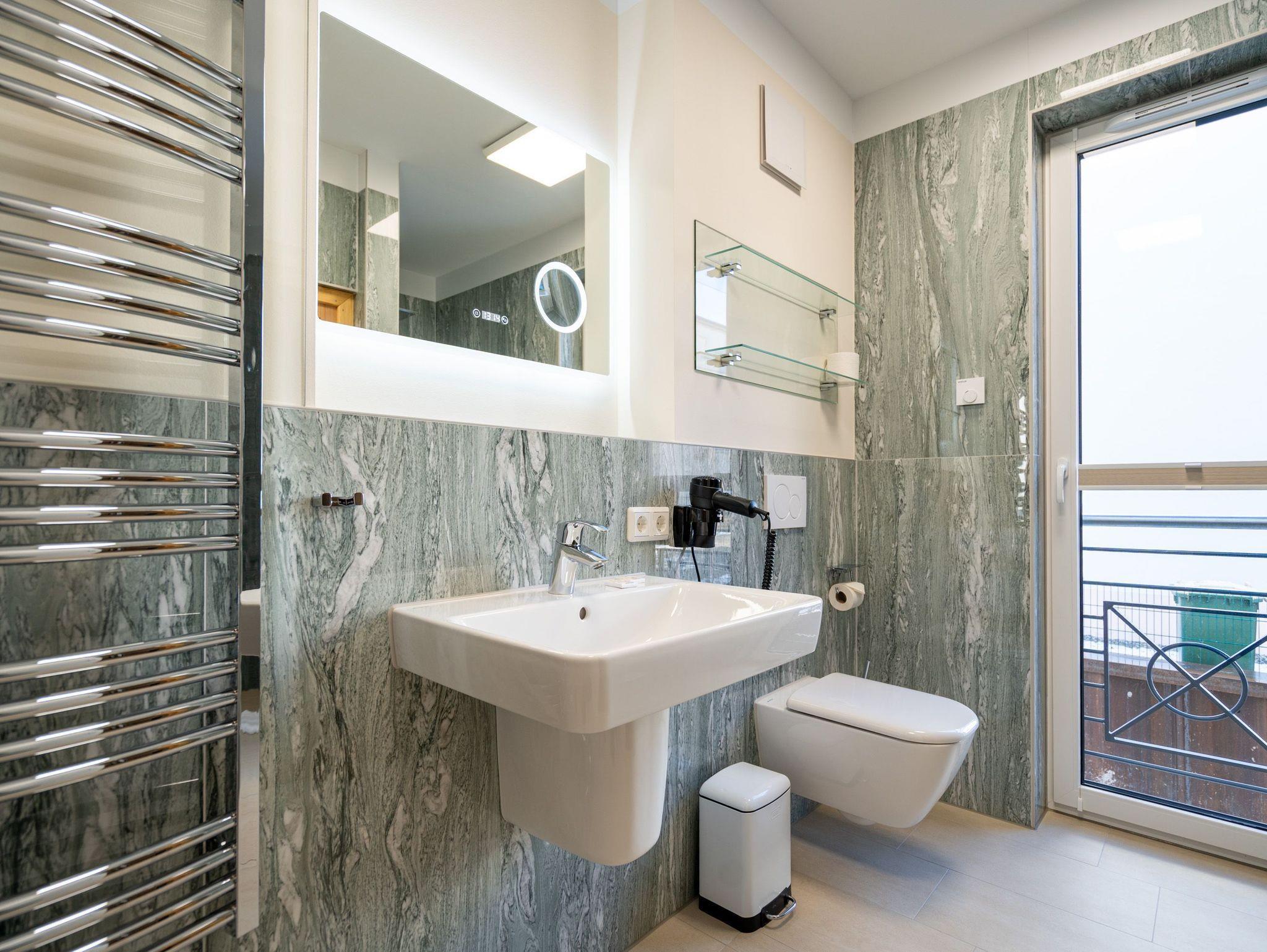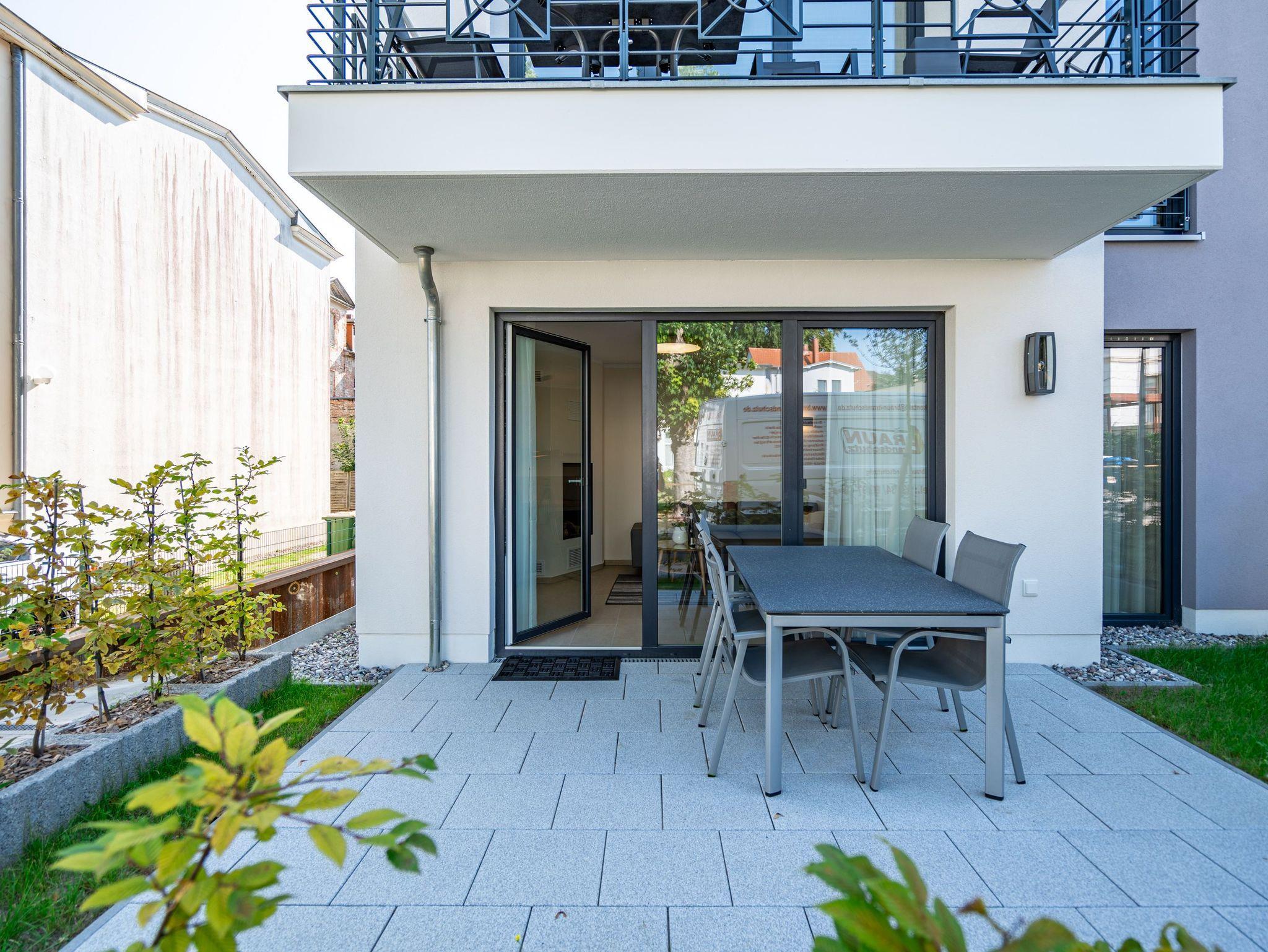 Die 3-Raum-Ferienwohnung Nr. 02 im Erdgeschoss des Quartier 6 bietet auf 73 m² Platz für bis zu 4 Personen und überzeugt mit einer modernen und komfortablen Ausstattung. Der offene Wohnbereich verfügt über eine voll ausgestattete Küchenzeile mit Induktionsherd, Mikrowelle und Backofen. Ein Essplatz für 4 Personen lädt zu gemeinsamen Mahlzeiten ein, während die gemütliche Sitzgruppe mit Flat-TV und ein per Fernbedienung gesteuerter Gas-Kamin für entspannte Abende sorgen. Von hier aus gelangen Sie auf die sonnige Süd-West-Terrasse mit einer Fläche von 10 m², die einen seitlichen Blick in Richtung Ostsee bietet. Die Ferienwohnung verfügt über zwei Schlafzimmer, jeweils mit einem Doppelbett (1,60 m x 2,00 m), Kleiderschrank und Flat-TV ausgestattet. Es stehen Ihnen zwei Bäder zur Verfügung: das erste innenliegende Bad bietet eine Dusche, einen Waschtisch, einen Haarfön und ein WC, während das zweite Bad ebenfalls mit Dusche, Waschtisch und WC ausgestattet ist und zusätzlich über eine Infrarotwärmekabine verfügt. Ein Hauswirtschaftsraum mit Waschmaschine und Trockner sorgt für zusätzlichen Komfort. Zur Wohnung gehört ein PKW-Stellplatz in der Tiefgarage sowie ein eigener Abstellraum im Keller für Fahrräder.