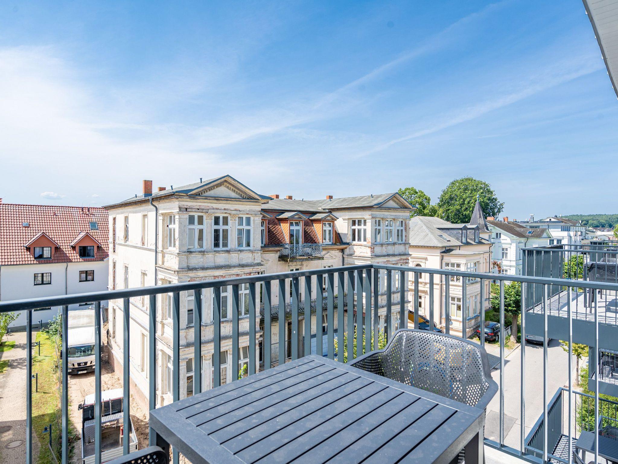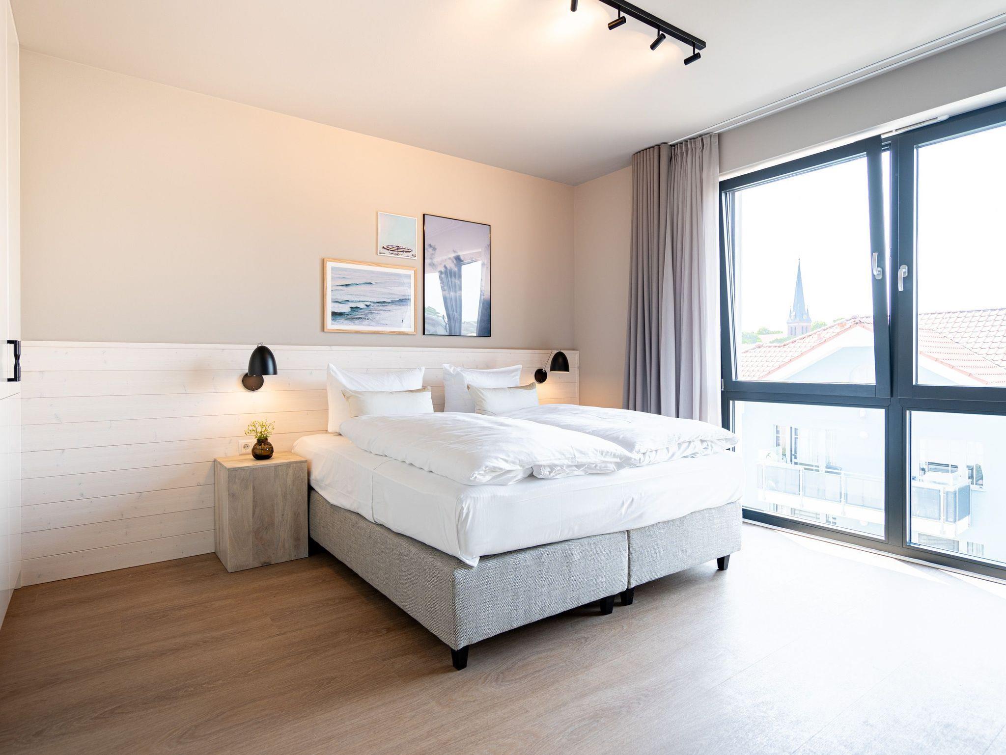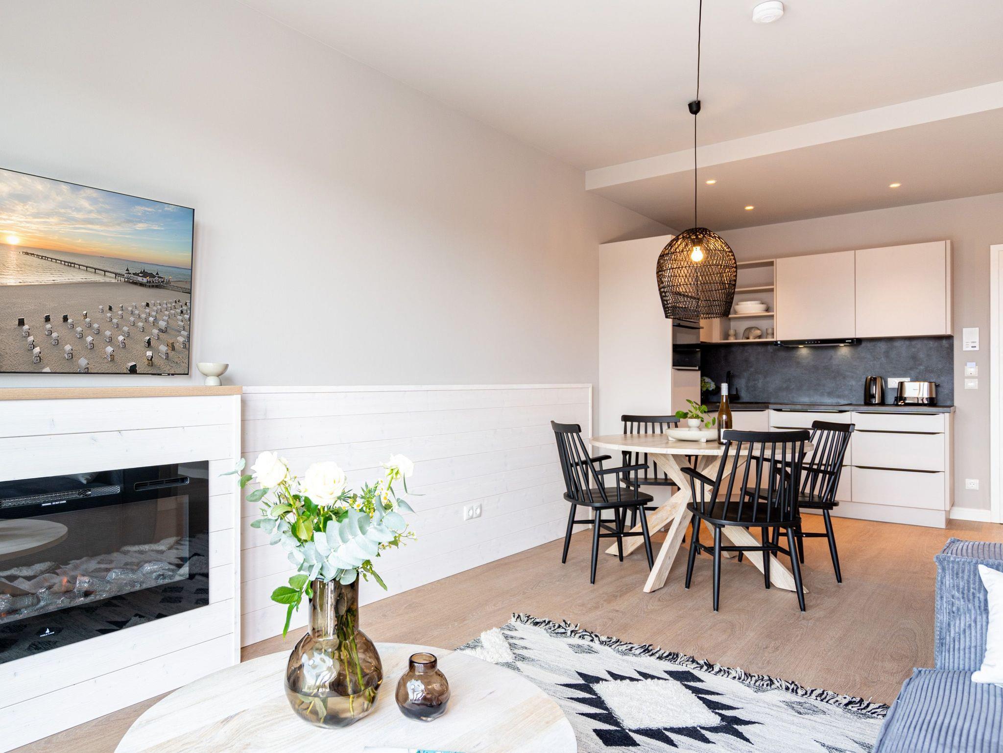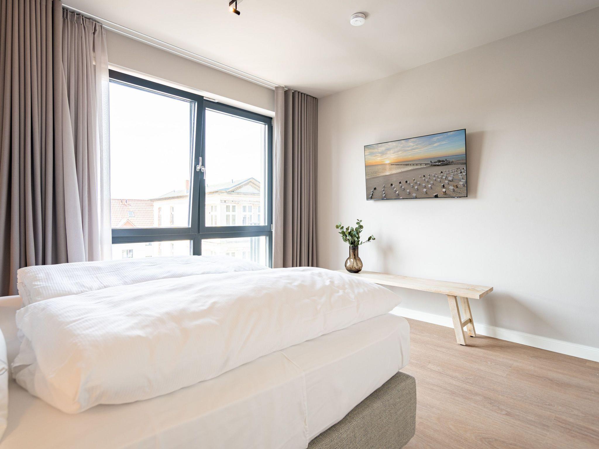 Die beiden kuschlig heimeligen Zimmer des Appartements B 3.5 (Haus B) im 3. Obergeschoss der Strandterrasse sind ein perfektes Wohlfühlparadies auf Zeit für bis zu 2 Personen und 1 Kleinkind (im Kinderreisebett). 52 helle und stylische Quadratmeter machen Ihren Ostseeaufenthalt zu einer wunderschönen Auszeit. Hier gibt es alles, was Sie genau dafür brauchen. Ein schönes und geräumiges Wohn-Esszimmer mit einer gemütlichen Couch, einem Elektrokamin (ohne Wärmeabgabe) mit Fernbedienung, einem Flat-TV (50 Zoll) und einem schönen Esstisch sorgt dafür, dass Sie in Urlaubsstimmung kommen. Die Küche ist offen und mit allen Annehmlichkeiten ausgestattet: darunter ein Backofen, einem 3-Platten-Induktionsherd und einer Nespresso-Kapselmaschine. Der Süd-Balkon ist eine Sonnenoase, auf dem Sie weit über die Dächer der alten Villen und das Seebad schauen können. Am Balkontisch mit 2 Stühlen können Sie die frische Ostseeluft genießen. Das Schlafzimmer verfügt über ein komfortables Boxspringdoppelbett (1,80m x 2,00m), einen großen Kleiderschrank und einen Flat-TV (50 Zoll). Ein modernes Duschbad mit Waschtisch und WC komplettiert das Angebot. Einen Parkplatz müssen Sie nicht erst suchen. Den finden Sie ganz bequem in der Tiefgarage. Diese stilvolle und gemütliche Ferienwohnung in unmittelbarer Nähe zum Strand wartet also nur noch auf Sie.
