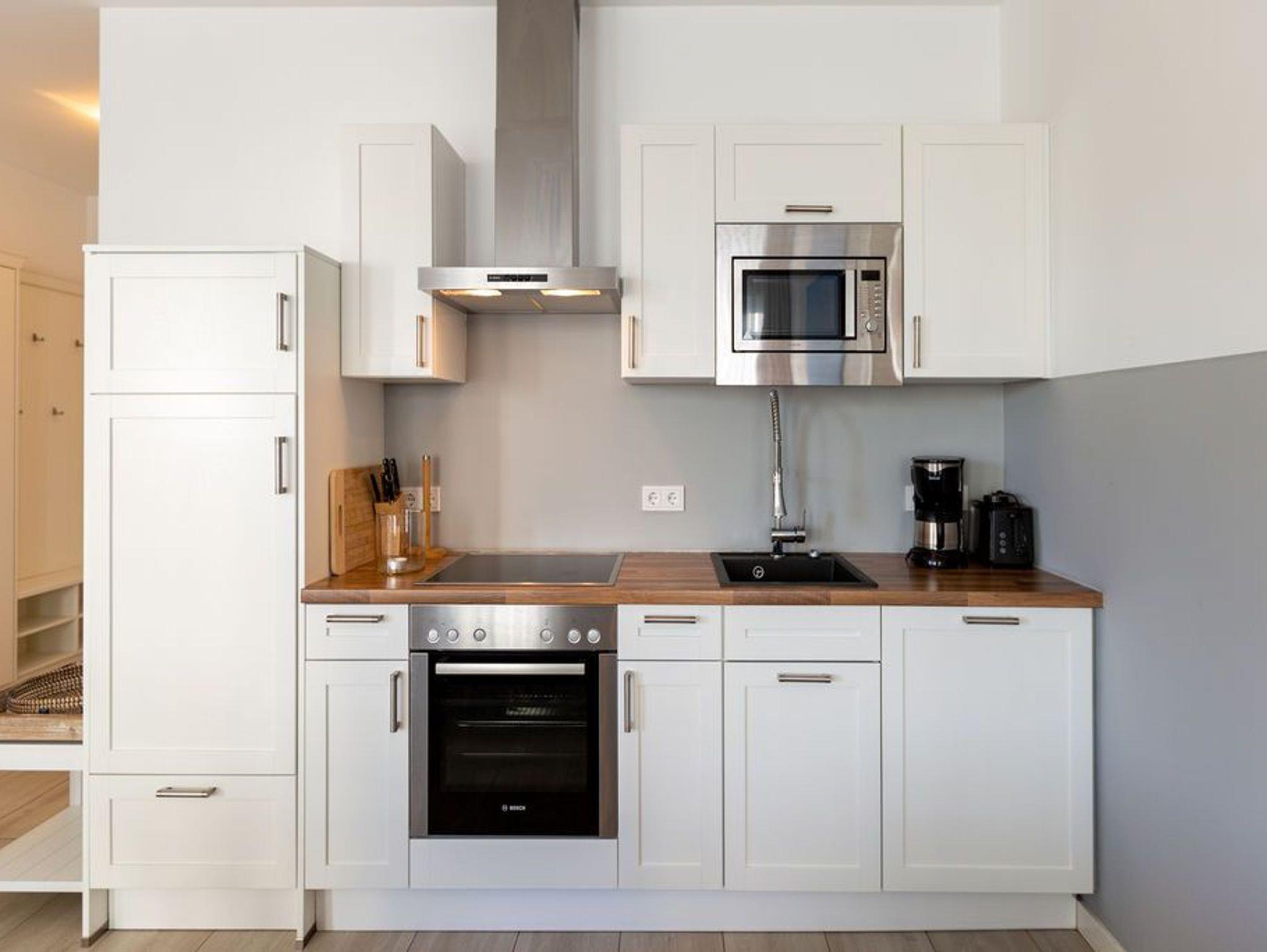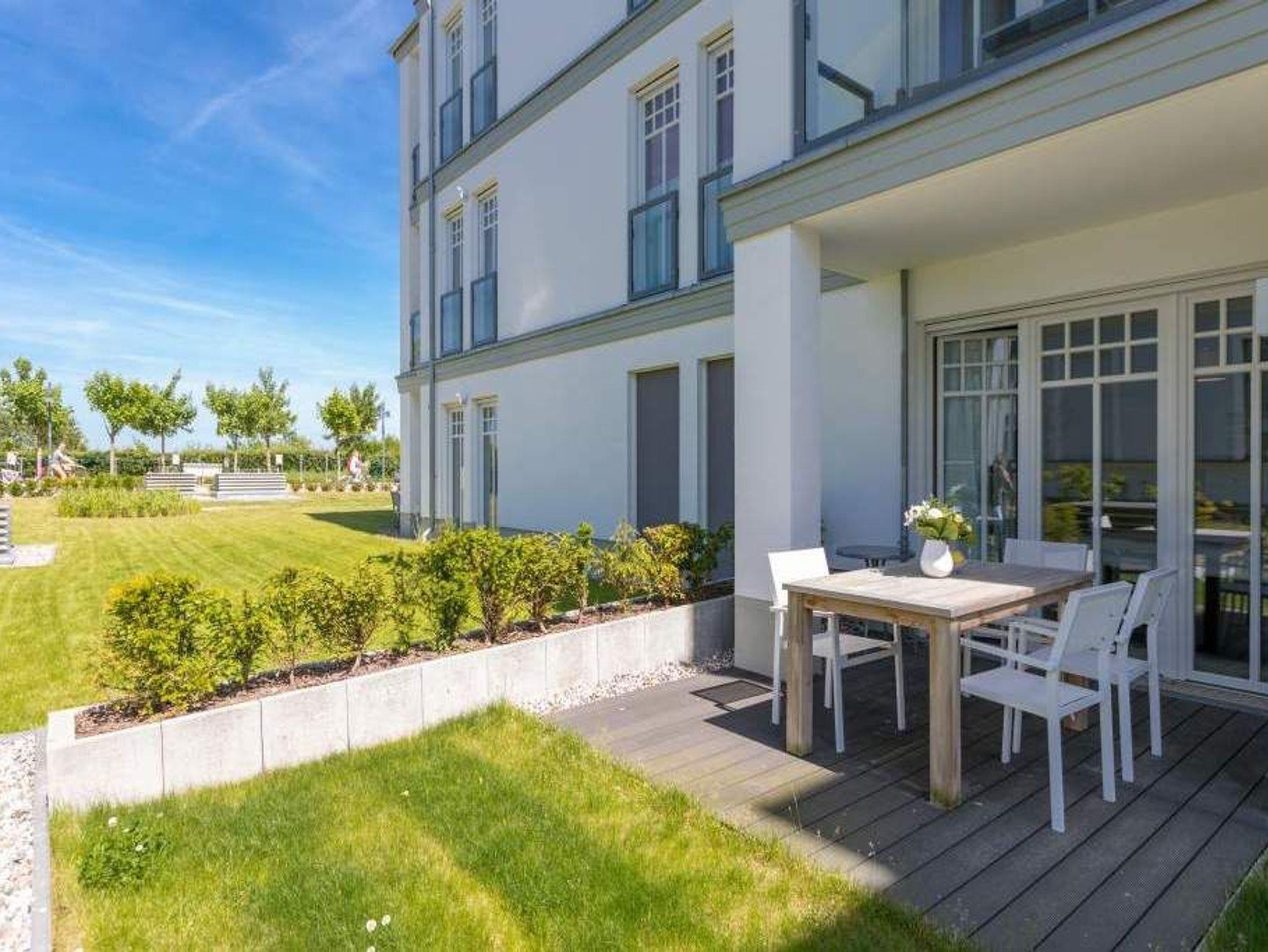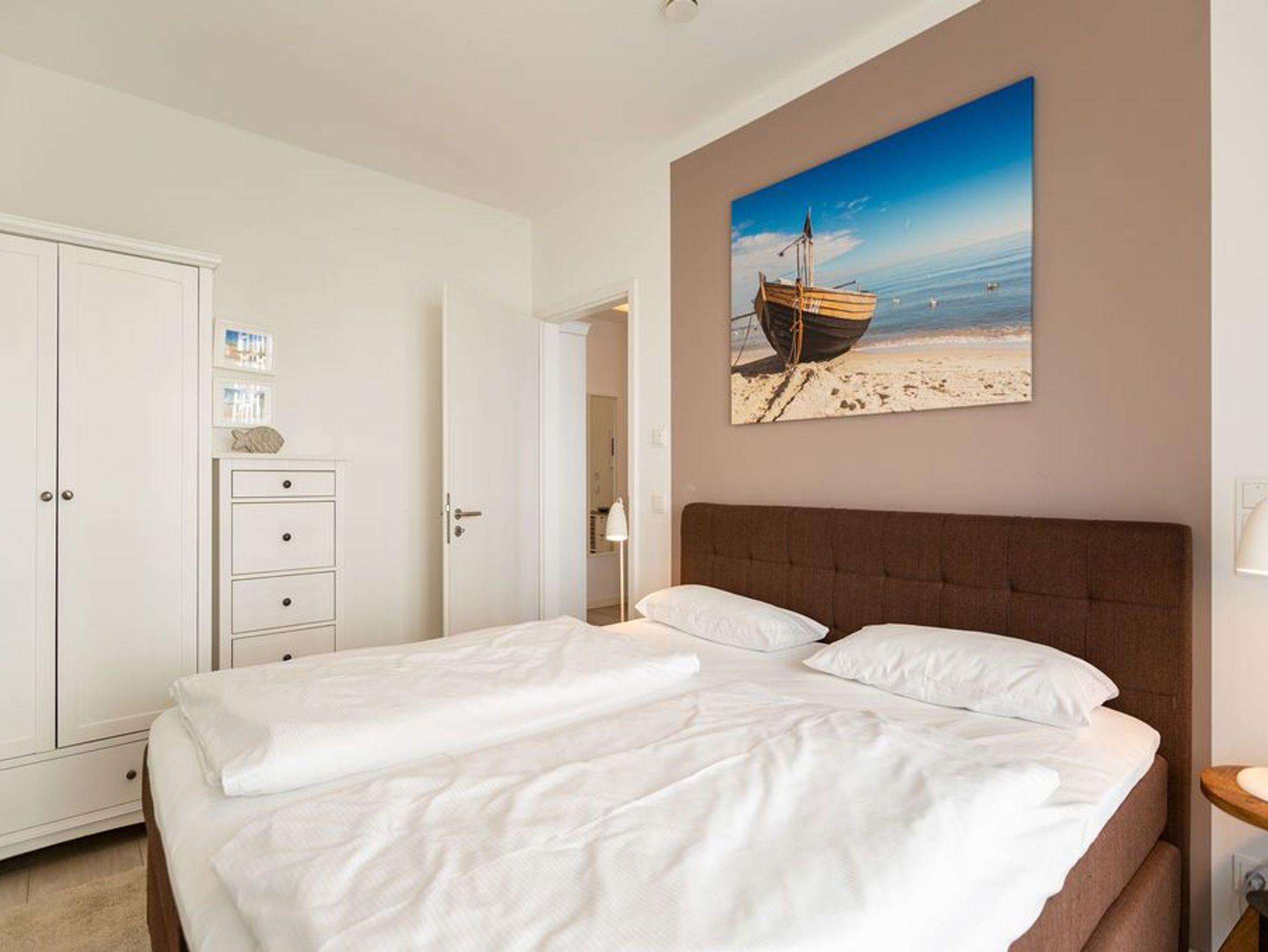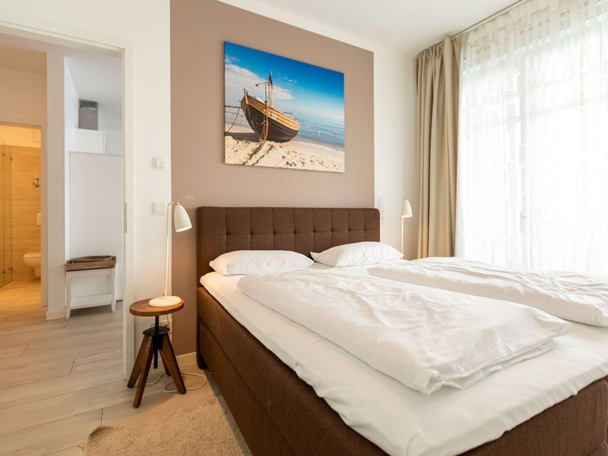 Nordisch nobel, mit einem Hauch von Industriechic präsentiert sich die 77 Quadratmeter große Ferienwohnung Nummer 5 im Erdgeschoss der Villa Westend. Sie empfängt ihre Besucher mit einem offenen und geschmackvoll eingerichteten Wohn- und Essbereich. Der hochwertige Esstisch mit großer Echtholzplatte und die skandinavischen Designstühle fallen dabei sofort ins Auge. Ebenso wie die gemütliche Sitzgruppe, die zum Relaxen vor dem Elektro-Kamin einlädt. Der zaubert ? egal ob nach einem winterfrischen Strandspaziergang oder einem sonnenreichen Sommerstrandtag ? mit seinen Flammen herrliches Wohlgefühl in Ihre Urlaubsabende. Per Knopfdruck mit oder ohne Wärme. Industrie-Designlampen setzen im Wohnraum stylische Akzente. Die offene Küche mit hochwertigen Elektrogeräten ist voll ausgestattet. Vom Wohnzimmer aus gelangen Sie auf die Terrasse, wo die Ostsee in nur 50 Metern Entfernung durch die Dünengräser glitzert. Zwei in harmonischen Farben gehaltene Schlafzimmer bieten in Boxspringdoppelbetten (1,80 m x 2,00 m) Platz für 4 Personen. In jedem Zimmer gibt es einen Flat-TV. Viel Platz für die Urlaubsgarderobe bietet je ein Kleiderschrank. In einem großen Wellnessbad, das von einem der beiden Schlafzimmer aus zugänglich ist, lässt es sich in der finnischen Sauna, der Badewanne oder unter der Regendusche wunderbar entspannen. Ein zweites Bad ist ebenfalls mit Dusche, WC und Waschtisch ausgestattet. Für den puren Urlaubsgenuss liegen Handtücher für Sie bereit und die Betten sind frisch bezogen. Es steht Ihnen ein Pkw-Stellplatz in der Tiefgarage zur Verfügung.